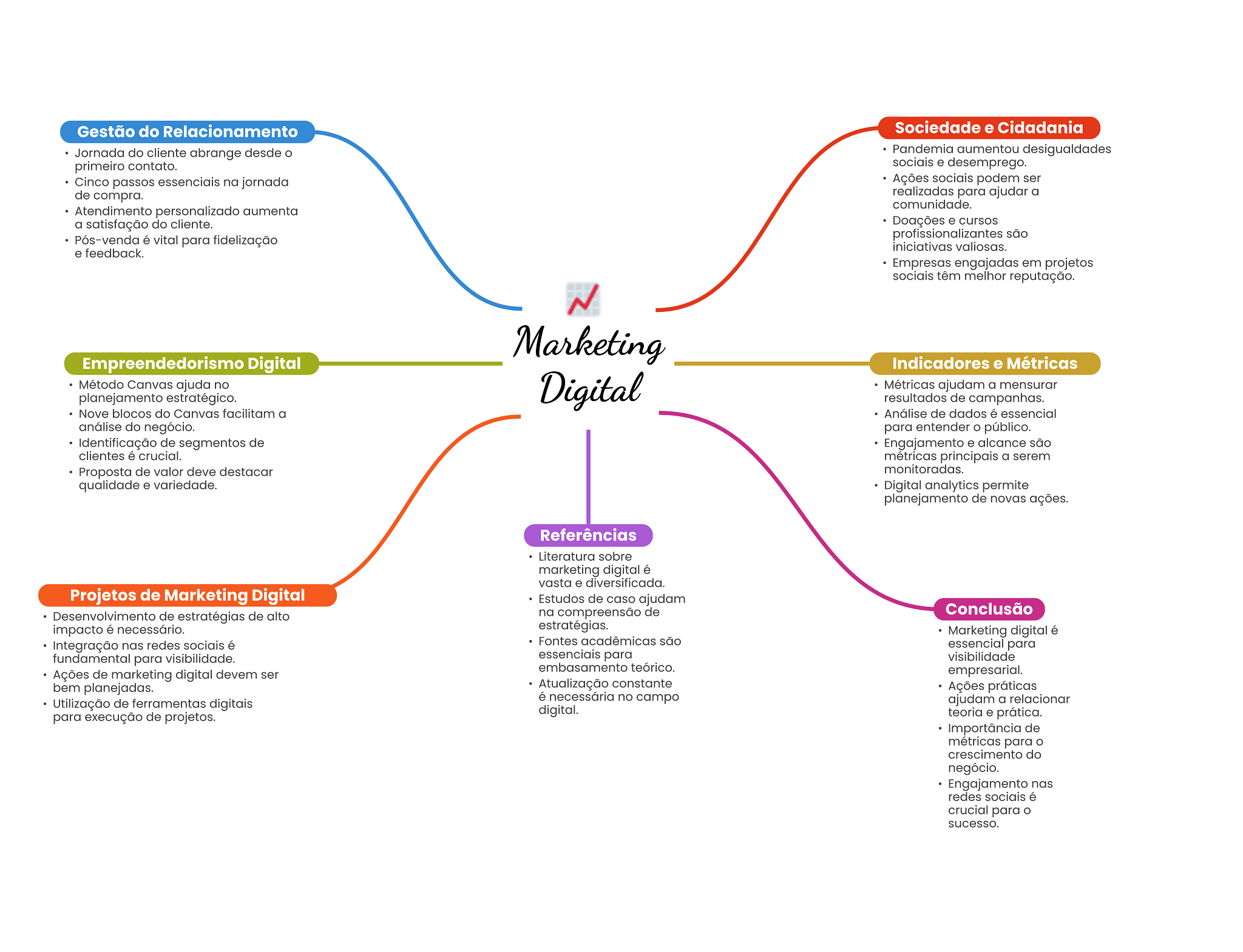Gestão do Relacionamento Sociedade e Cidadania Jornada do cliente abrange desde Pandemia aumentou desigualdades primeiro contato. sociais e desemprego. Cinco passos essenciais na jornada Ações sociais podem ser de compra. realizadas para ajudar a comunidade. Atendimento personalizado aumenta a satisfação do cliente. Doações e cursos Pós-venda é vital para fidelização profissionalizantes são iniciativas valiosas. e feedback. Empresas engajadas em projetos sociais têm melhor reputação. Marketing Empreendedorismo Digital Indicadores e Métricas Método Canvas ajuda no planejamento estratégico. Digital Métricas a mensurar resultados de campanhas. Nove blocos do Canvas facilitam a Análise de dados é essencial análise do negócio. para entender público. Identificação de segmentos de Engajamento e alcance são clientes é crucial. métricas principais a serem Proposta de valor deve destacar monitoradas. qualidade e variedade. Digital analytics permite planejamento de novas ações. Referências Literatura sobre marketing digital é vasta e diversificada. Projetos de Marketing Digital Estudos de caso ajudam Desenvolvimento de estratégias de alto na compreensão de Conclusão impacto é necessário. estratégias. Marketing digital é Integração nas redes sociais é Fontes acadêmicas são essencial para fundamental para visibilidade. essenciais para visibilidade embasamento teórico. Ações de marketing digital devem ser empresarial. bem planejadas. Atualização constante Ações práticas Utilização de ferramentas digitais é necessária no campo ajudam a relacionar para execução de projetos. digital. teoria e prática. Importância de métricas para crescimento do negócio. Engajamento nas redes sociais é crucial para O sucesso.