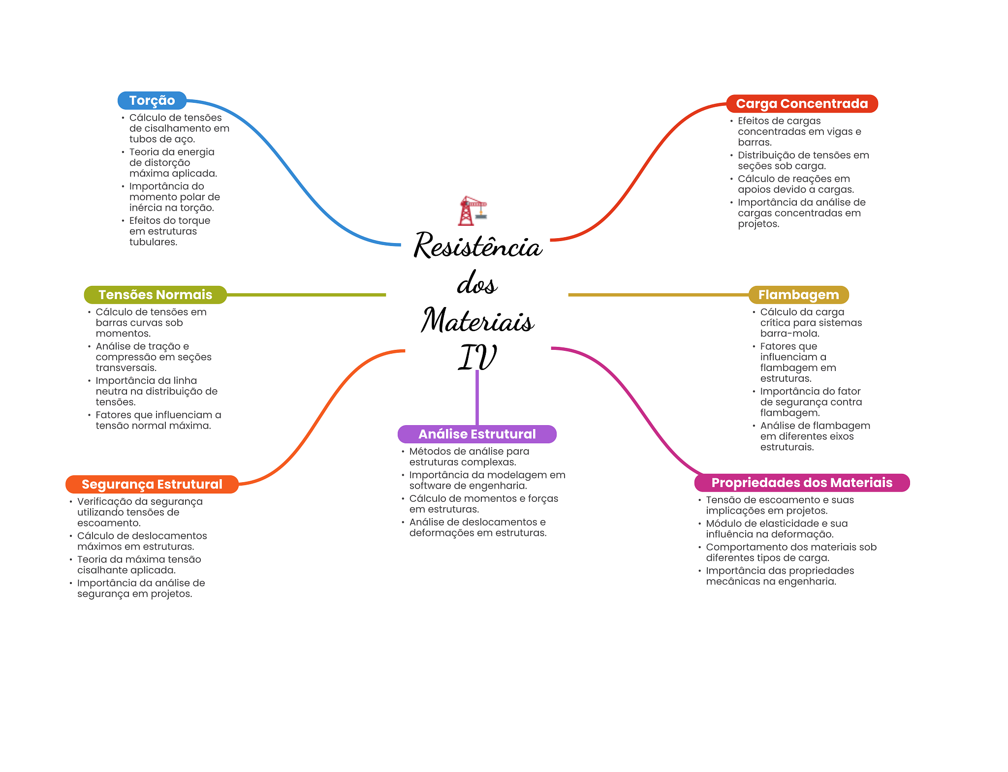 Torção Carga Concentrada Cálculo de tensões Efeitos de cargas de cisalhamento em concentradas em vigas e tubos de aço. barras. Teoria da energia Distribuição de tensões em de distorção seções sob carga. máxima aplicada. Cálculo de reações em Importância do apoios devido a cargas. momento polar de inércia na torção. Importância da análise de cargas concentradas em Efeitos do torque projetos. em estruturas tubulares. Resistência dos Tensões Normais Flambagem Cálculo de tensões em Materiais Cálculo da carga barras curvas sob crítica para sistemas momentos. barra-mola. Análise de tração e IV Fatores que compressão em seções influenciam a transversais. flambagem em Importância da linha estruturas. neutra na distribuição de Importância do fator tensões. de segurança contra Fatores que influenciam a flambagem. tensão normal máxima. Análise de flambagem Análise Estrutural em diferentes eixos Métodos de análise para estruturais. estruturas complexas. Importância da modelagem em Segurança Estrutural software de engenharia. Propriedades dos Materiais Verificação da segurança Cálculo de momentos e forças Tensão de escoamento e suas utilizando tensões de em estruturas. implicações em projetos. escoamento. Análise de deslocamentos e Módulo de elasticidade e sua Cálculo de deslocamentos deformações em estruturas. influência na deformação. máximos em estruturas. Comportamento dos materiais sob Teoria da máxima tensão diferentes tipos de carga. cisalhante aplicada. Importância das propriedades Importância da análise de mecânicas na engenharia. segurança em projetos.