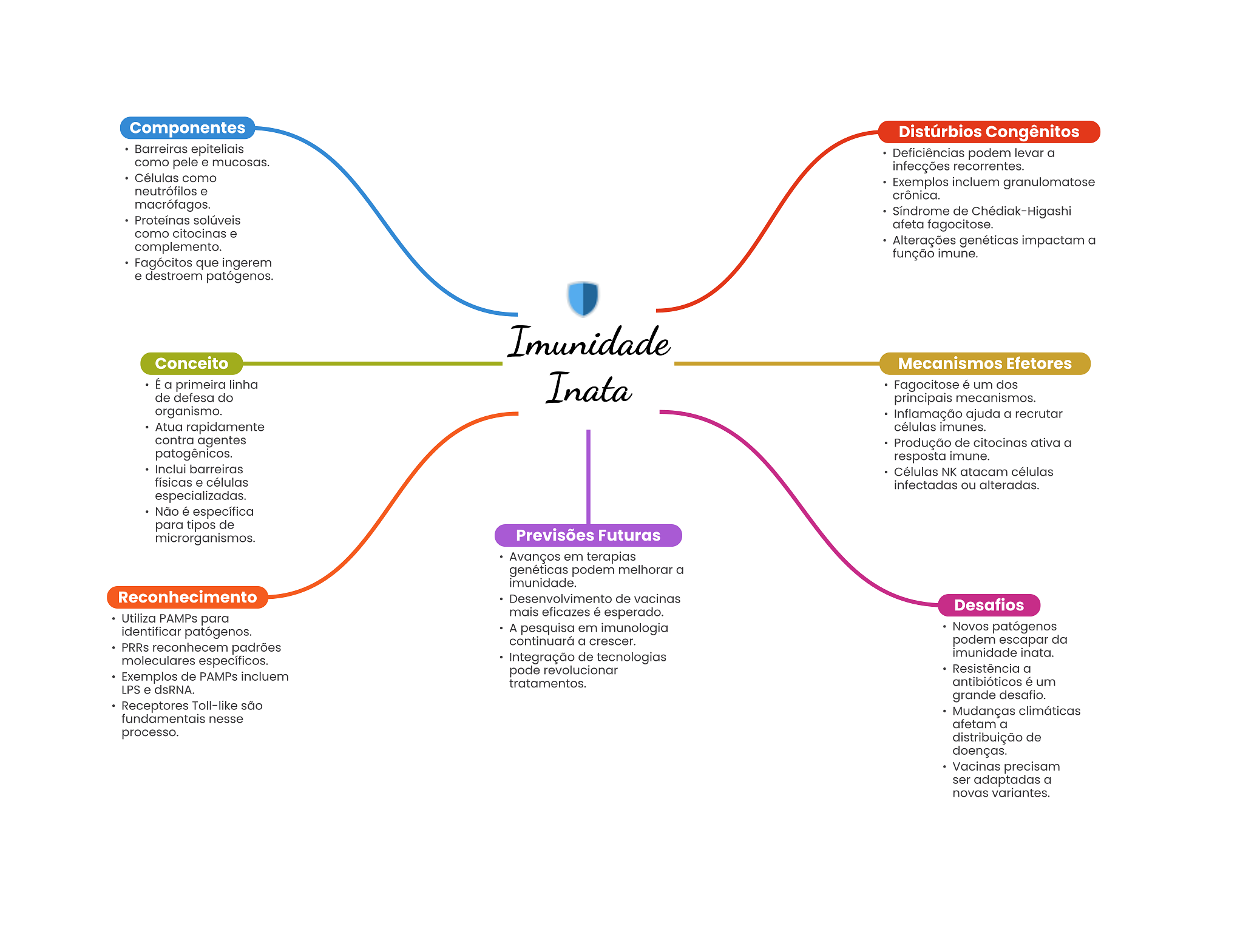 Componentes Distúrbios Congênitos Barreiras epiteliais Deficiências podem levar a como pele e mucosas. infecções recorrentes. Células como Exemplos incluem granulomatose neutrófilos e crônica. macrófagos. Síndrome de Chédiak-Higashi Proteínas solúveis afeta fagocitose. como citocinas e complemento. Alterações genéticas impactam a função imune. Fagócitos que ingerem e destroem patógenos. Imunidade Conceito Mecanismos Efetores É a primeira linha de defesa do Inata Fagocitose é um dos principais mecanismos. organismo. Inflamação ajuda a recrutar Atua rapidamente células imunes. contra agentes Produção de citocinas ativa a patogênicos. resposta imune. Inclui barreiras Células NK atacam células físicas e células infectadas ou alteradas. especializadas. Não é específica para tipos de microrganismos. Previsões Futuras Avanços em terapias genéticas podem melhorar a imunidade. Reconhecimento Desenvolvimento de vacinas Desafios Utiliza PAMPs para mais eficazes é esperado. identificar patógenos. A pesquisa em imunologia Novos patógenos continuará a crescer. podem escapar da PRRs reconhecem padrões moleculares específicos. Integração de tecnologias imunidade inata. pode revolucionar Resistência a Exemplos de PAMPs incluem tratamentos. antibióticos é um LPS e dsRNA. grande desafio. Receptores Toll-like são Mudanças climáticas fundamentais nesse afetam a processo. distribuição de doenças. Vacinas precisam ser adaptadas a novas variantes.