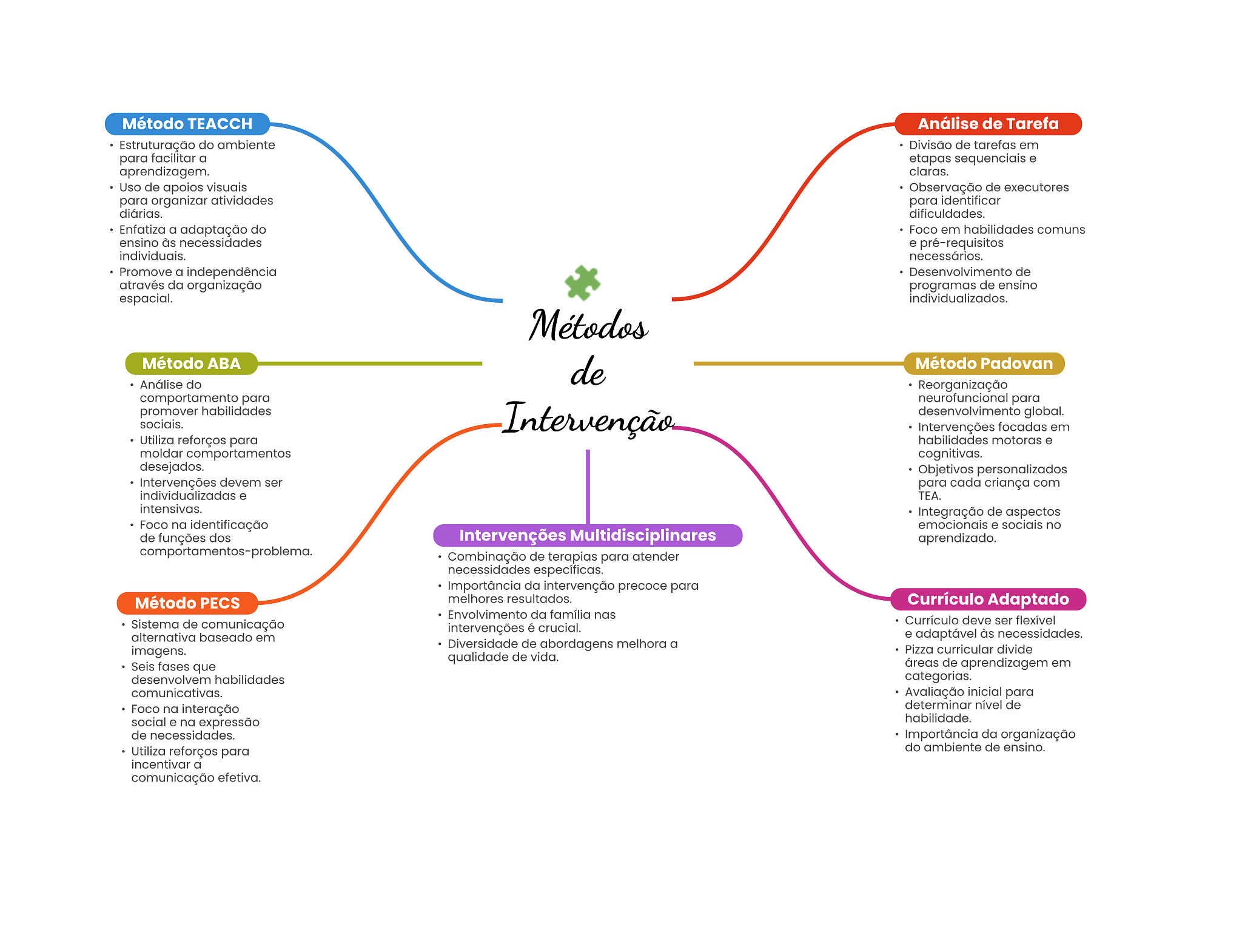 Método TEACCH Análise de Tarefa Estruturação do ambiente Divisão de tarefas em para facilitar a etapas sequenciais e aprendizagem. claras. Uso de apoios visuais Observação de executores para organizar atividades para identificar diárias. dificuldades. Enfatiza a adaptação do Foco em habilidades comuns ensino às necessidades e pré-requisitos individuais. necessários. Promove a independência Desenvolvimento de através da organização programas de ensino espacial. individualizados. Métodos Método ABA de Método Padovan Análise do Reorganização comportamento para neurofuncional para promover habilidades sociais. Intervenção desenvolvimento global. Intervenções focadas em Utiliza reforços para habilidades motoras e moldar comportamentos cognitivas. desejados. Objetivos personalizados Intervenções devem ser para cada criança com individualizadas e TEA. intensivas. Integração de aspectos Foco na identificação emocionais e sociais no de funções dos Intervenções Multidisciplinares aprendizado. comportamentos-problema. Combinação de terapias para atender necessidades específicas. Importância da intervenção precoce para Método PECS melhores resultados. Currículo Adaptado Envolvimento da família nas Sistema de comunicação Currículo deve ser flexível intervenções é crucial. alternativa baseado em e adaptável às necessidades. imagens. Diversidade de abordagens melhora a Pizza curricular divide qualidade de vida. Seis fases que áreas de aprendizagem em desenvolvem habilidades categorias. comunicativas. Avaliação inicial para Foco na interação determinar nível de social e na expressão habilidade. de necessidades. Importância da organização Utiliza reforços para do ambiente de ensino. incentivar a comunicação efetiva.