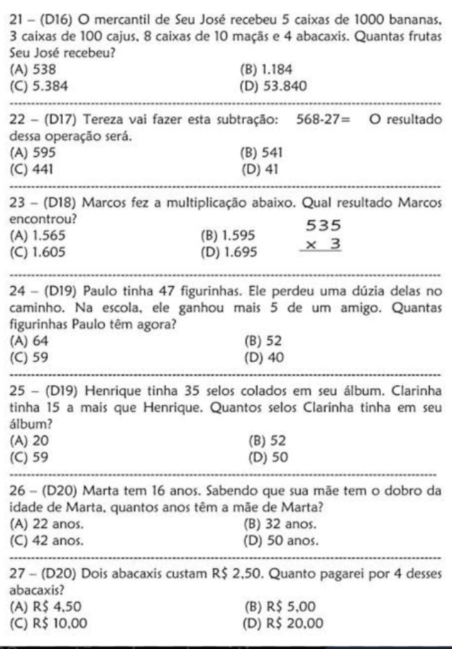 21 (D16) mercantil de Seu José recebeu 5 caixas de 1000 3 caixas de 100 cajus, 8 caixas de 10 maçãs e 4 abacaxis. Quantas frutas Seu José recebeu? (A) 538 (B) 1.184 (C) 5.384 (D) 53.840 22 (D17) Tereza vai fazer esta subtração: 568-27= resultado dessa operação será. (A) 595 (B) 541 (C) 441 (D) 41 23 (D18) Marcos fez a multiplicação abaixo. Qual resultado Marcos encontrou? 535 (A) 1.565 (B) 1.595 3 (C) 1.605 (D) 1.695 24 (D19) Paulo tinha 47 figurinhas. Ele perdeu uma dúzia delas no caminho. Na ele ganhou mais 5 de um amigo. Quantas figurinhas Paulo têm agora? (A) 64 (B) 52 (C) 59 (D) 40 25 (D19) Henrique tinha 35 selos colados em seu álbum. Clarinha tinha 15 a mais que Henrique. Quantos selos Clarinha tinha em seu álbum? (A) 20 (B) 52 (C) 59 (D) 50 26 (D20) Marta tem 16 anos. Sabendo que sua mãe tem O dobro da idade de Marta. quantos anos têm a mãe de Marta? (A) 22 anos. (B) 32 anos. (C) 42 anos. (D) 50 anos. 27 (D20) Dois abacaxis custam R$ Quanto pagarei por 4 desses abacaxis? (A) (B) (C) R$ 10,00 (D)