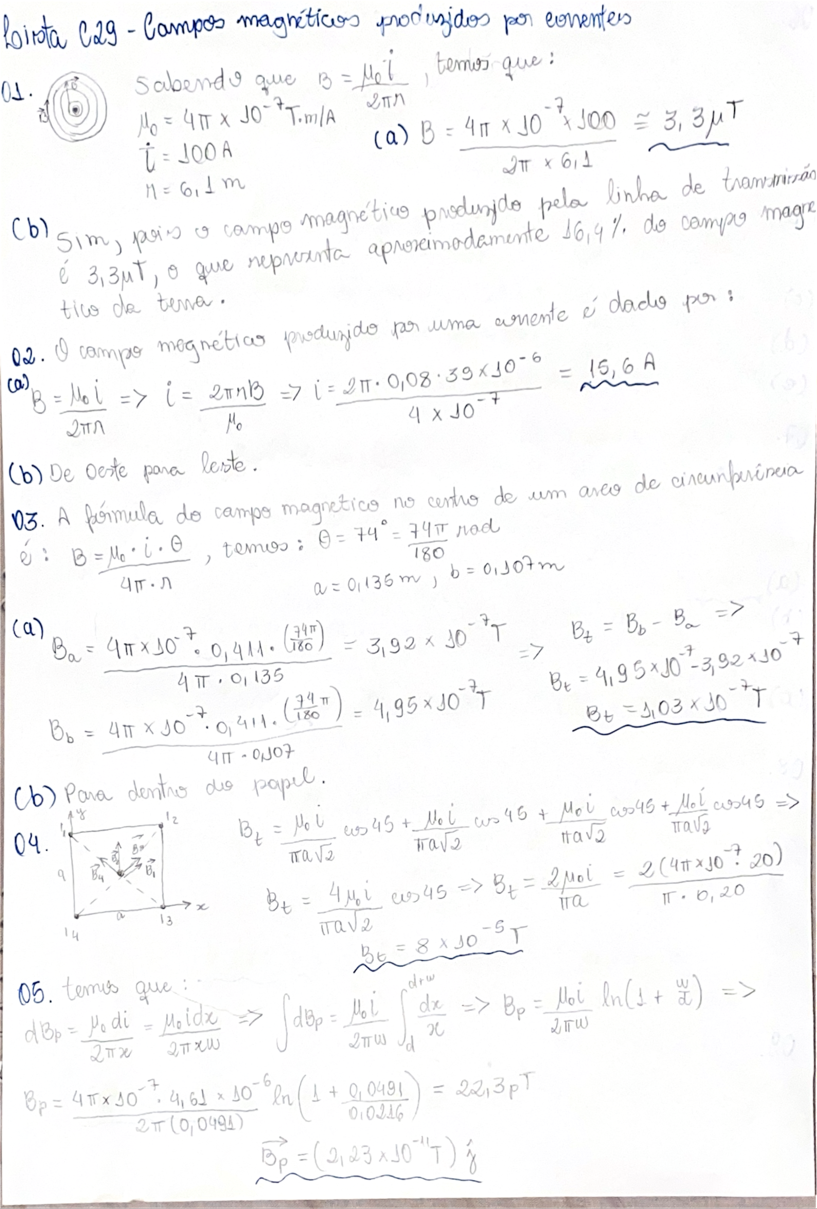 C29 - Campos 01. que B = que: = T.m/A (a) B = 10 100 = 100A 2TT (b) M = 6,1 m pela linha de magne Sim, é campo representa 16,4% do 02. I tiw campo produzido par uma é dado per : tena. 3 B = Moi i= = 15,6 A = Mo 4 X 10 7 (b) De Deste para 03. A do campo magnetico no centro de um areo de e: = 74° = 180 rod = 0,135 = (a) = 0,411. = 3,92 X 10 Bt = Bb - Ba Bt = Bb = = 4,95 Bt = (b) Para dentro do papel. y 12 04. = + Noi us 45 + Moi + of a By = us45 = = 2 20) x a 13 14 = 8 -5 T 05. drw dBp = = Moidx = dx Bp = Moi ln(1 + x 2πx 2πxw d Bp = 4,61 (1 + 0,0491) = 2TT (0,0491) Bp =06. A entre duas é dade b F in F ba = Ba Fbc = ib = 3.10 (a) + = 4d) = 26 + d 2d 3d = X (b) F2 = 2d + j = 12TT. 10 = (1,88 8 (c) = 2TT pois fio 3 está no meio dos (d) = - F2 = 10 if (e) F5 = = (- 4,69 X 07. B(r) = J(n) M i = B(n) = Moieno 0 = 2TT Jo a 3a (a) B(o) = 0 (b) B G/N = 10 310 (3,1 2 2 = = 3(3,1 (c) B(a) = = 10⁻⁷. 3,1 10⁻³ = 3 3 08. Temos = i(nR) = Moin = L = BL Sabenelo que raio de = = mo = eB 10 -31 0,0460.3 = 1,6 IT (100) 09. Temos Bp = = 8.4 200.0,0122 = 8,78 X = 5JSR 0,2510. b (a) B = B = = 4 a B= 4 0,0572 + B = 4,97 = 0,497 MT (b) B aponta para dentro da de a segna da (c) Para : A = do momento 2 = 2 = 2 M \ = 1,06 (d) Para dentro da