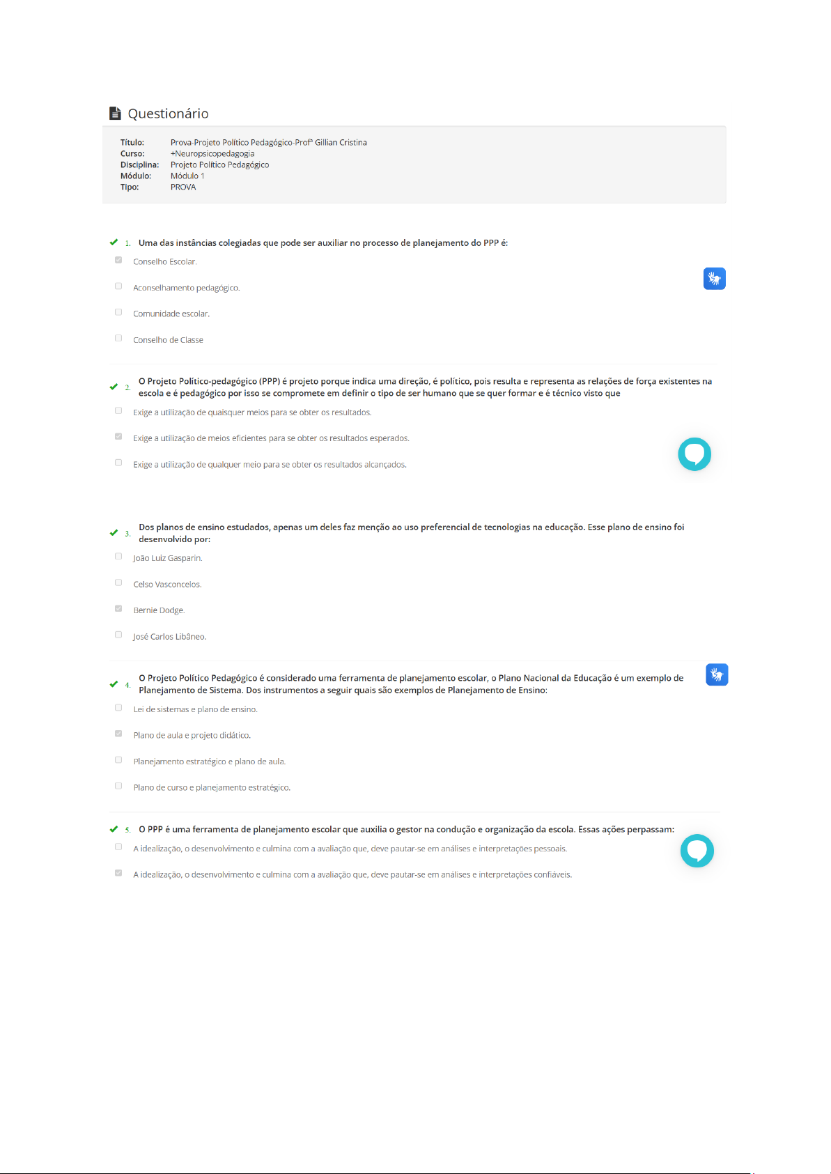 Questionário Título: Prova-Projeto Político Gillian Cristina Curso: +Neuropsicopedagogia Disciplina: Projeto Político Pedagógico Módulo: Módulo 1 Tipo: PROVA 1. Uma das instâncias colegiadas que pode ser auxiliar no processo de planejamento do PPP é: Conselho Escolar. Aconselhamento pedagógico. Comunidade escolar. Conselho de Classe o Projeto Politico-pedagógico (PPP) é projeto porque indica uma direção, é político, pois resulta e representa as relações de força existentes na 2. escola e é pedagógico por isso se compromete em definir o tipo de ser humano que se quer formar e é técnico visto que Exige a utilização de quaisquer meios para se obter os resultados. Exige a utilização de meios eficientes para se obter os resultados esperados. Exige a utilização de qualquer meio para se obter os resultados alcançados. Dos planos de ensino estudados, apenas um deles faz menção ao uso preferencial de tecnologias na educação. Esse plano de ensino foi 3. desenvolvido por: João Luiz Gasparin. Celso Vasconcelos. Bernie Dodge. José Carlos Libâneo. o Projeto Político Pedagógico é considerado uma ferramenta de planejamento escolar, o Plano Nacional da Educação é um exemplo de 4. Planejamento de Sistema. Dos instrumentos a seguir quais são exemplos de Planejamento de Ensino: Lei de sistemas e plano de ensino. Plano de aula e projeto didático. Planejamento estratégico e plano de aula. Plano de curso e planejamento estratégico. 5. PPP é uma ferramenta de planejamento escolar que auxilia gestor na condução e organização da escola. Essas ações perpassam: A idealização, desenvolvimento e culmina com a avaliação que, deve pautar-se em análises e interpretações pessoais. A idealização, desenvolvimento e culmina com a avaliação que, deve pautar-se em análises e interpretações confiáveis.6. Sobre planejamento podemos afirmar pautados em nossos estudos que: planejamento é técnico, político-virtual, político-filosófico e científico. planejamento é técnico, político-social, político-filosófico e científico. planejamento é técnico, político-social, político-filosófico e planejado. planejamento é artístico, político-social, político-filosófico e científico. Segundo PILETTI, um dos três questionamentos que deveriam orientar a escrita de Planejamentos é "Para quem se planeja?". Os outros dois 7. questionamentos referem-se a: Por que se planeja e que considerar nos planejamentos. Com quem se planeja e que considerar nos planejamentos. Onde se planeja e que considerar nos planejamentos. Onde se planeja e com quem se planeja. 8. A comunidade escolar é composta por: Professores, alunos, técnicos educacionais, comunidade e família. Professores, alunos e família. Carrano e Dayrel afirmam: A elaboração de um projeto de vida é fruto de um processo de aprendizagem, no qual o maior desafio é aprender a escolher. Na sociedade contemporânea, somos chamados a escolher, a decidir continuamente, fazendo dessa ação uma condição para a sobrevivência social. 9. A escolha também é objeto de aprendizagem: aprendemos a escolher e a nos responsabilizar pelas nossas escolhas. Um e outro se aprendem fazendo, errando, refletindo sobre os erros. Essas são condições para a formação de sujeitos autônomos. Com base nessa afirmação é correto assegurar: Nenhuma escolha realizada traz consigo a responsabilidade de assumí-la. Ao colocar em prática ações planejadas não aprendemos. Não existem condições especiais para formar sujeitos. Quanto mais escolhemos, projetamos e planejamos mais aprendemos. 10. No planejamento de ensino, assim como nos demais, quatro são os elementos que devem compô-los são eles: Definição dos objetivos, a revisão dos conteúdos, a seleção dos procedimentos metodológicos e estabelecimento de critérios e procedimentos de avaliação. Definição dos objetivos, a previsão dos conteúdos, a seleção dos procedimentos metodológicos e o estabelecimento de critérios e procedimentos de avaliação. Definição dos objetivos, a previsão dos conteúdos, a seleção dos procedimentos metodológicos e estabelecimento de critérios e procedimentos de reavaliação. Definição dos objetivos, a previsão dos conteúdos, a seleção dos procedimentos metodológicos e estabelecimento de critérios e avaliação