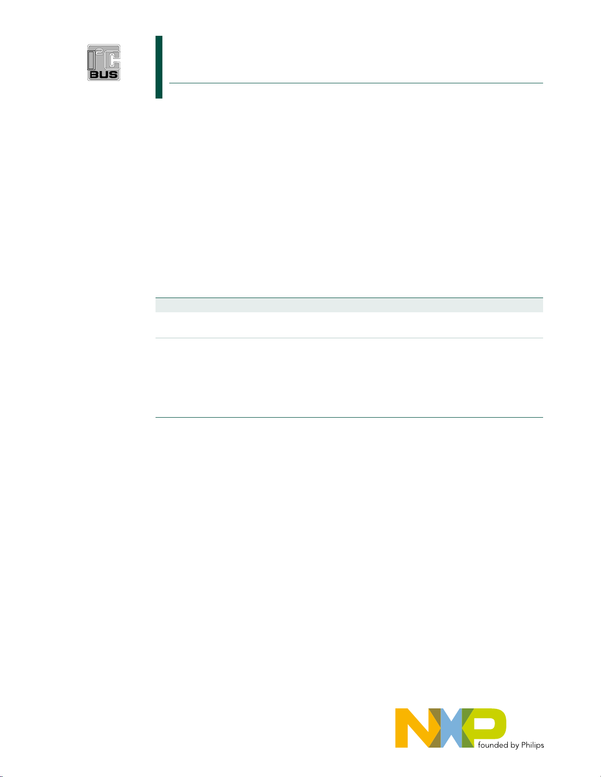 UM10204 I2C-bus specification and user manual Rev. 03 — 19 June 2007 User manual Document information Info Content Keywords I2C, I2C-bus, Standard-mode, Fast-mode, Fast-mode Plus, Fm+, High Speed, Hs, inter-IC, SDA, SCL Abstract Philips Semiconductors (now NXP Semiconductors) developed a simple bidirectional 2-wire bus for efficient inter-IC control. This bus is called the Inter-IC or I2C-bus. Only two bus lines are required: a serial data line (SDA) and a serial clock line (SCL). Serial, 8-bit oriented, bidirectional data transfers can be made at up to 100 kbit/s in the Standard-mode, up to 400 kbit/s in the Fast-mode, up to 1 Mbit/s in the Fast-mode Plus (Fm+), or up to 3.4 Mbit/s in the High-speed mode. NXP Semiconductors UM10204 I2C-bus specification and user manual Revision history Rev Date Description 03 20070619 Many of today’s applications require longer buses and/or faster speeds. Fast-mode plus was introduced to meet this need by increasing drive strength by as much as 10× and increasing the data rate to 1 Mbit/s while maintaining downward compatibility to Fast-mode and Standard-mode speeds and software commands. Modifications: • Re-ordered sections and clarified several requirements • Added description of Fast-mode Plus (Fm+) specifications • Added description of the Device ID Field • Added Bus Clear procedures • Moved level shifting information to a separate application note (AN10441) • Clarified the process of sizing Rp • Added limits for tVD;DAT and tVD;ACK 2.1 2000 Version 2.1 of the I2C-bus specification 2.0 1998 The I2C-bus has become a de facto world standard that is now implemented in over 1000 different ICs and licensed to more than 50 companies. Many of today’s applications, however, require higher bus speeds and lower supply voltages. This updated version of the I2C-bus specification meets those requirements. 1.0 1992 Version 1.0 of the I2C-bus specification Original 1982 first release UM10204_3 © NXP B.V. 2007. All rights reserved. User manual Rev. 03 — 19 June 2007 2 of 50 Contact information For additional information, please visit: http://www.nxp.com For sales office addresses, please send an email to: salesaddresses@nxp.com NXP Semiconductors UM10204 I2C-bus specification and user manual 1. Introduction The I2C-bus is a de facto world standard that is now implemented in over 1000 different ICs manufactured by more than 50 companies. Additionally, the versatile I2C-bus is used in a variety of control architectures such as System Management Bus (SMBus), Power Management Bus (PMBus), Intelligent Platform Management Interface (IPMI), and Advanced Telecom Computing Architecture (ATCA). This document will assist device and system designers to understand how the I2C-bus works and implement a working application. Various operating modes are described. It contains a comprehensive introduction to the I2C-bus data transfer, handshaking and bus arbitration schemes. Detailed sections cover the timing and electrical specifications for the I2C-bus in each of its operating modes. Designers of I2C-compatible chips should use this document as a reference and ensure that new devices meet all limits specified in this document. Designers of systems that include I2C devices should review this document and also refer to individual component data sheets. 2. I2C-bus features In consumer electronics, telecommunications and industrial electronics, there are often many similarities between seemingly unrelated designs. For example, nearly every system includes: • Some intelligent control, usually a single-chip microcontroller • General-purpose circuits like LCD and LED drivers, remote I/O ports, RAM, EEPROM, real-time clocks or A/D and D/A converters • Application-oriented circuits such as digital tuning and signal processing circuits for radio and video systems, temperature sensors, and smart cards To exploit these similarities to the benefit of both systems designers and equipment manufacturers, as well as to maximize hardware efficiency and circuit simplicity, Philips Semiconductors (now NXP Semiconductors) developed a simple bidirectional 2-wire bus for efficient inter-IC control. This bus is called the Inter IC or I2C-bus. All I2C-bus compatible devices incorporate an on-chip interface which allows them to communicate directly with each other via the I2C-bus. This design concept solves the many interfacing problems encountered when designing digital control circuits. Here are some of the features of the I2C-bus: • Only two bus lines are required; a serial data line (SDA) and a serial clock line (SCL). • Each device connected to the bus is software addressable by a unique address and simple master/slave relationships exist at all times; masters can operate as master-transmitters or as master-receivers. • It is a true multi-master bus including collision detection and arbitration to prevent data corruption if two or more masters simultaneously initiate data transfer. • Serial, 8-bit oriented, bidirectional data transfers can be made at up to 100 kbit/s in the Standard-mode, up to 400 kbit/s in the Fast-mode, up to 1 Mbit/s in Fast-mode Plus, or up to 3.4 Mbit/s in the High-speed mode. UM10204_3 © NXP B.V. 2007. All rights reserved. User manual Rev. 03 — 19 June 2007 3 of 50 NXP Semiconductors UM10204 I2C-bus specification and user manual • On-chip filtering rejects spikes on the bus data line to preserve data integrity. • The number of ICs that can be connected to the same bus is limited only by a maximum bus capacitance. More capacitance may be allowed under some conditions. Refer to Section 7.2. Figure 1 shows an example of I2C-bus applications. 2.1 Designer benefits I2C-bus compatible ICs allow a system design to rapidly progress directly from a functional block diagram to a prototype. Moreover, since they ‘clip’ directly onto the I2C-bus without any additional external interfacing, they allow a prototype system to be modified or upgra