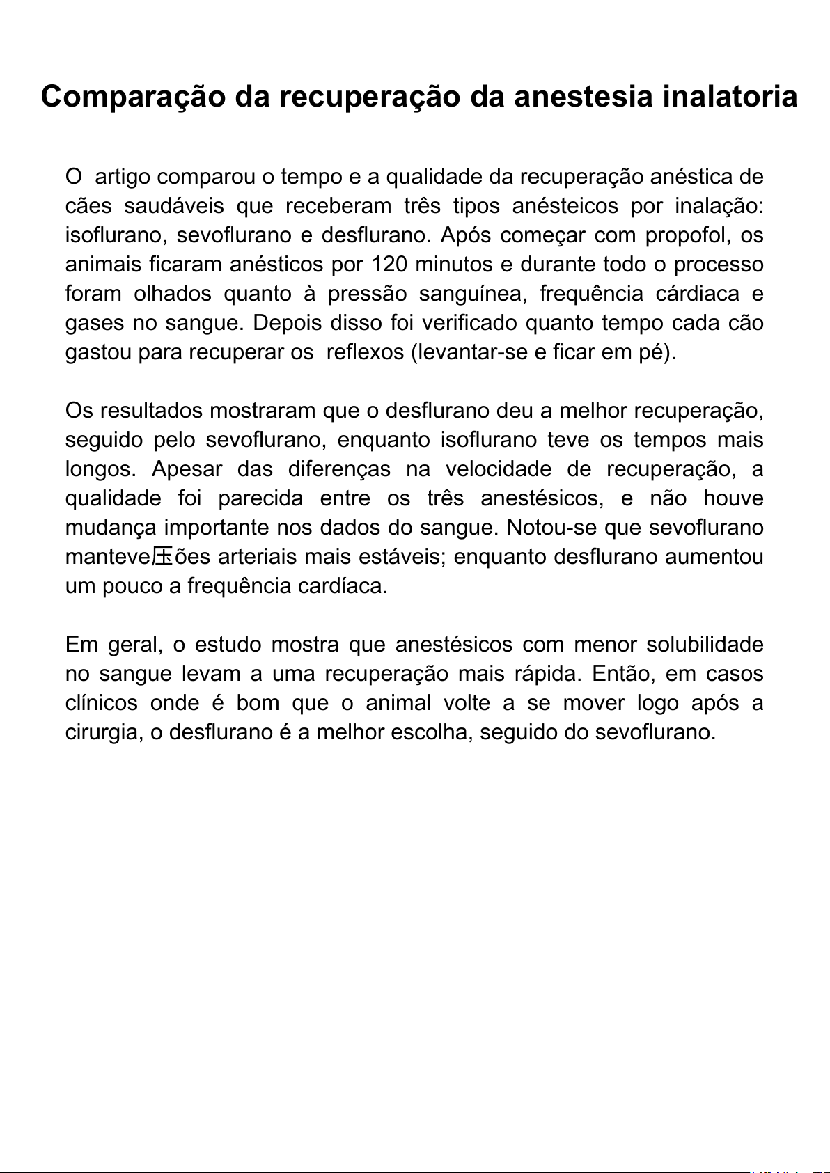 Comparação da recuperação da anestesia inalatoria O artigo comparou o tempo e a qualidade da recuperação anéstica de cães saudáveis que receberam três tipos anésteicos por inalação: isoflurano, sevoflurano e desflurano. Após começar com propofol, os animais ficaram anésticos por 120 mi nutos e durante todo o proces so foram olhados quanto à pressão san guínea, frequência cárdia ca e gases no sangue. Depois disso foi verificado quanto tempo cada cão gastou par a recuperar os reflexos (le vantar-se e ficar em pé). Os resultados mostraram que o desfluran o deu a melhor recup eração , seguido pelo sevo flurano, en quanto isoflurano teve os tempos mais longos. Apesar das difer ença s na velocidade de rec uperação, a qualidade foi pa recida entre os três anestési cos, e não houve mudança importa nte nos dados do sangue. No tou-se que sevoflurano man teve压ões arteriais mais estáveis; enquanto desflurano aumentou um pouco a frequência c ard íaca. Em geral, o estudo mostra que anestésicos com menor solubilidade no sangue levam a uma recuperação mais rápida. Então, em casos clínicos onde é bom que o animal volte a se mover logo após a cirurgia, o desflurano é a melhor escolha, seguido do sevoflurano.