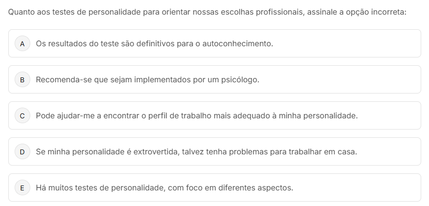 Quanto aos testes de personalidade para orientar nossas escolhas profissionais, assinale a opção incorreta: A Os resultados do teste são definitivos para O autoconhecimento. B Recomenda-se que sejam implementados por um psicólogo. C Pode ajudar-me a encontrar perfil de trabalho mais adequado à minha personalidade. D Se minha personalidade é extrovertida, talvez tenha problemas para trabalhar em casa. E Há muitos testes de personalidade, com foco em diferentes aspectos.