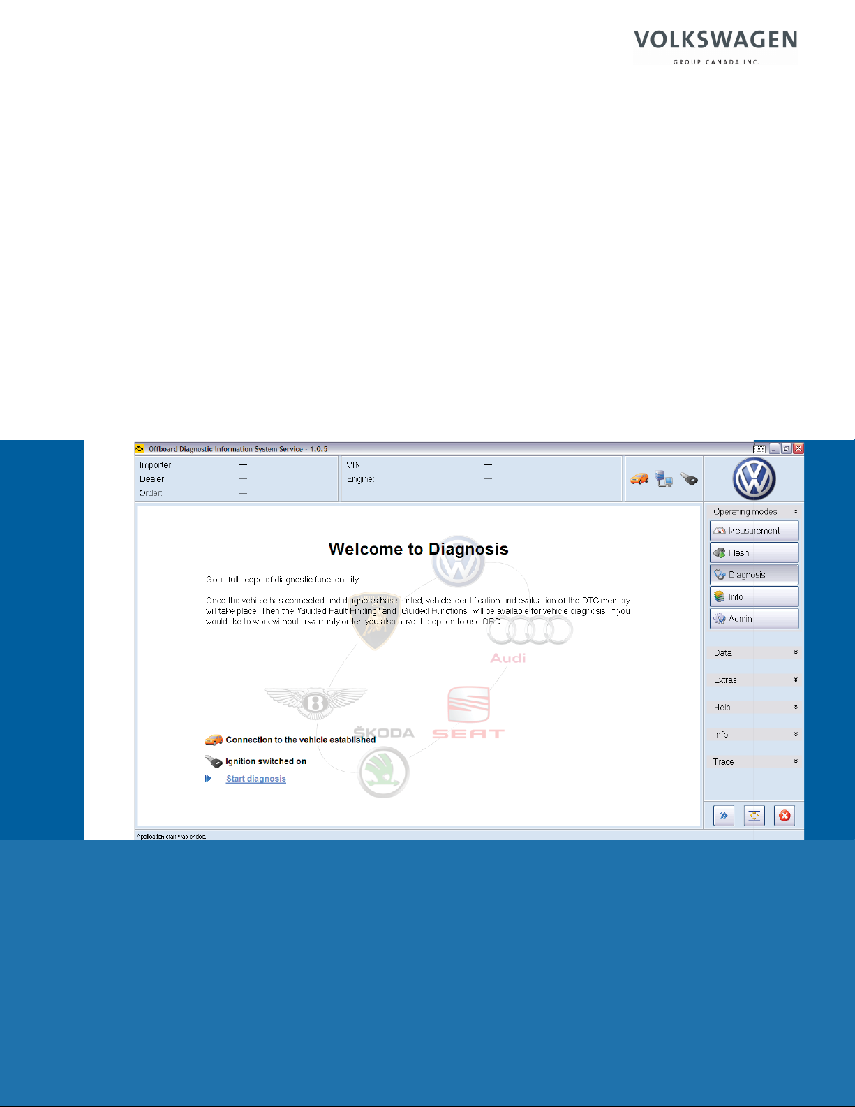 Service Training Reference Guide 810123UC Offboard Diagnostic Information System (ODIS Service) leberj Typewritten Text Volkswagen Group Canada, Inc. Volkswagen Academy Printed 5/2012 Course Number 810123UC Based on ODIS Service Software Version 1.0.5 ©2012 Volkswagen Group Canada, Inc. All rights reserved. All information contained in this manual is based on the latest information available at the time of printing and is subject to the copyright and other intellectual property rights of Volkswagen Group Canada, Inc., its aff liated companies and its licensors. All rights are reserved to make changes at any time without notice. No part of this document may be reproduced, stored in a retrieval system, or transmitted in any form or by any means, electronic, mechanical, photocopying, recording or otherwise, nor may these materials be modif ed or reposted to other sites without the prior expressed written permission of the publisher. All requests for permission to copy and redistribute information should be referred to Volkswagen Group Canada, Inc. Always check Technical Bulletins and the latest electronic repair information for information that may supersede any information included in this booklet. Trademarks: All brand names and product names used in this manual are trade names, service marks, trademarks, or registered trademarks; and are the property of their respective owners. i Contents Introduction . . . . . . . . . . . . . . . . . . . . . . . . . . . . . . . . . . . . . . . . . . . . . . . . . . . . . . . . . . 1 Launching ODIS . . . . . . . . . . . . . . . . . . . . . . . . . . . . . . . . . . . . . . . . . . . . . . . . . . . . . . . 3 The ODIS Window . . . . . . . . . . . . . . . . . . . . . . . . . . . . . . . . . . . . . . . . . . . . . . . . . . . . . 5 Launching GFF . . . . . . . . . . . . . . . . . . . . . . . . . . . . . . . . . . . . . . . . . . . . . . . . . . . . . . . . 7 Control Module Tab Tips . . . . . . . . . . . . . . . . . . . . . . . . . . . . . . . . . . . . . . . . . . . . . . . 11 Viewing DTCs . . . . . . . . . . . . . . . . . . . . . . . . . . . . . . . . . . . . . . . . . . . . . . . . . . . . . . . 13 Launching Test Plans . . . . . . . . . . . . . . . . . . . . . . . . . . . . . . . . . . . . . . . . . . . . . . . . . . 15 Erasing DTCs . . . . . . . . . . . . . . . . . . . . . . . . . . . . . . . . . . . . . . . . . . . . . . . . . . . . . . . . 17 Selecting Test Plans . . . . . . . . . . . . . . . . . . . . . . . . . . . . . . . . . . . . . . . . . . . . . . . . . . . 19 GFF Test Plan Tips . . . . . . . . . . . . . . . . . . . . . . . . . . . . . . . . . . . . . . . . . . . . . . . . . . . . 23 Documents . . . . . . . . . . . . . . . . . . . . . . . . . . . . . . . . . . . . . . . . . . . . . . . . . . . . . . . . . . 25 Saving/Interrupting . . . . . . . . . . . . . . . . . . . . . . . . . . . . . . . . . . . . . . . . . . . . . . . . . . . 29 Guided Functions . . . . . . . . . . . . . . . . . . . . . . . . . . . . . . . . . . . . . . . . . . . . . . . . . . . . 33 Control Module OBD . . . . . . . . . . . . . . . . . . . . . . . . . . . . . . . . . . . . . . . . . . . . . . . . . . 35 Vehicle OBD . . . . . . . . . . . . . . . . . . . . . . . . . . . . . . . . . . . . . . . . . . . . . . . . . . . . . . . . . 37 Diagnostic Logs . . . . . . . . . . . . . . . . . . . . . . . . . . . . . . . . . . . . . . . . . . . . . . . . . . . . . . 41 Adaptations . . . . . . . . . . . . . . . . . . . . . . . . . . . . . . . . . . . . . . . . . . . . . . . . . . . . . . . . . 43 Measuring Value Blocks . . . . . . . . . . . . . . . . . . . . . . . . . . . . . . . . . . . . . . . . . . . . . . . 45 Support . . . . . . . . . . . . . . . . . . . . . . . . . . . . . . . . . . . . . . . . . . . . . . . . . . . . . . . . . . . . . 49 This Reference Guide provides information regarding the new program "Offboard Diagnostic Information System." This Reference Guide is not a Repair Manual. This is Reference Guide is not meant to replace the ODIS manual. This information will not be updated. The pages in this reference manual are screen shots from the Volkswagen version of ODIS Service. The technical procedures outlined in this guide are the same between Audi and Volkswagen. 1 The Offboard Diagnostic Information System The Offboard Diagnostic Information System (ODIS) is the software that will be replacing the VAS-PC diagnostic software in the near future. It is an extension of the VAS-PC software that adds many features to help with vehicle diagnosis and repair. ODIS does not replace Guided Fault Finding (GFF). Guided Fault Finding is an integral component of ODIS. ODIS can be used on VAS 5051B, VAS 5052A and VAS 6150 diagnostic tools, as long as they are correctly updated. It cannot be used on the VAS 5051A or VAS 5052. ODIS-1 The ODIS interface is different from VAS-PC, and is very intuitive. With the this Reference Guide and some practice, it won’t take long for you to discover the advantages of ODIS. ODIS-94 ODIS-95 ODIS-96 2 Using this Reference Guide This reference guide contains a series of Job Aids that are designed to help you quickly move through the ODIS interface. In addition to being listed in the Table of Contents, the titles of each Job Aid are clearly marked on the sides of every page. This allows for “thumbing through” of this Reference Guide to quickly fi nd the Job Aid that will help you with your current ODIS task. As with any computer program, practicing is the best way to learn. Be sure to use ODIS regularly, and use these Job Aids if you have questions. The ODIS interface has its own User Guide, and this series of Job Aids is not designed to replace that document. These Job Aids are designed to get started quickly. If you want more detailed information, consult the User Guide in the ODIS interface. This Reference Guide only covers the ODIS software version shown on the cover, which is also shown on the bottom center of each page. As with any software prog