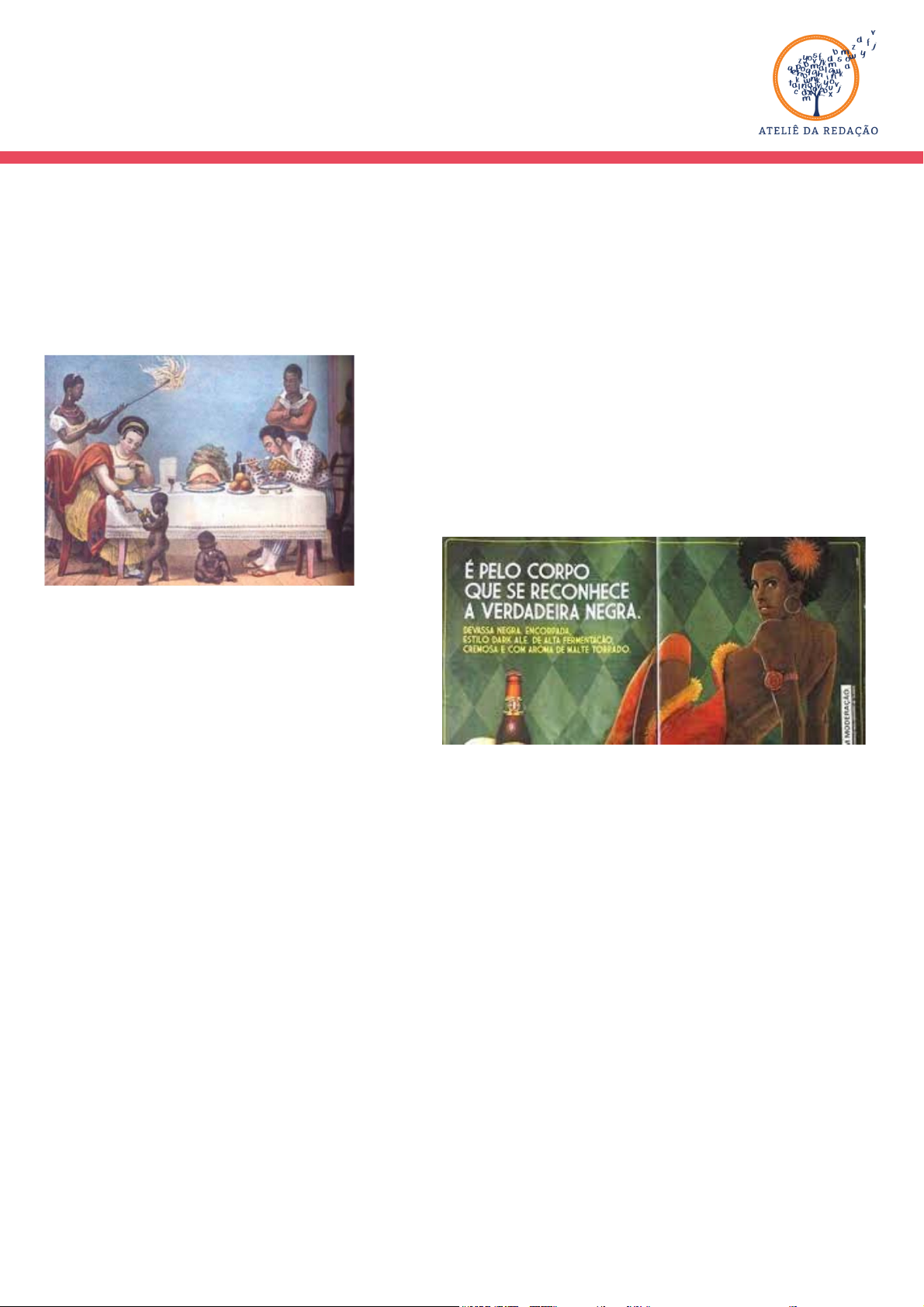 TEMA 2 Com base nos textos apresentados e em seus próprios conhecimentos, escreva uma dissertação, de acordo com a norma-padrão da língua portuguesa, sobre o seguinte tema: "A persistência do racismo estrutural na sociedade brasileira" EIXO TEMÁTICO - PRECONCEITO E EXCLUSÃO TEXTO 1 TEXTO 2 (DEBRET, J-B. Um jantar brasileiro, 1827.) 60% dos jovens de periferia Sem antecedentes criminais já sofreram violência policial A cada quatro pessoas mortas pela polícia, três são negras Nas universidades brasileiras, apenas 2% dos alunos são negros A cada quatro horas, um jovem negro morre violentamente em São Paulo Aqui quem fala é Primo Preto, mais um sobrevivente RACIONAIS MC's. Sobrevivendo no inferno, 1997. A carne mais barata do mercado é a carne negra (Só-só cego não vê) Que vai de graça pro presídio E para debaixo do plástico E vai de graça pro subemprego E pros hospitais psiquíatricos A carne mais barata do mercado é a carne negra (Dizem por aí) A carne mais barata do mercado é a carne negra Que fez e faz história Segurando esse país no braço, meu irmão O cabra que não se sente revoltado Porque o revólver já está engatilhado E o vingador eleito Mas muito bem intencionado E esse país vai deixando todo mundo preto E o cabelo esticado Mas mesmo assim ainda guarda o direito De algum antepassado da cor Brigar sutilmente por respeito Brigar bravamente por respeito Brigar por justiça e por respeito (pode acreditar) TEXTO 3 TEXTO 4 (Reprodução de propaganda da cerveja Devassa, 2010.) SOARES, E. A carne, 2002. TEXTO 5 Uma mulher negra, que trabalha como cozinheira, foi agredida covardemente por uma mulher branca, que aparenta ser mais jovem, em um prédio de luxo localizado na Rua Oscar Freire, uma das regiões mais ricas de São Paulo. A polícia investiga o caso como racismo. Em entrevista à Band, a cozinheira Eliane Aparecida de Paula disse que as agressões começaram após a mulher insultá-la por estar sentada no hall de entrada do prédio. “Ela me aborda com uma frase muito difícil: ‘Que mulher esquisita, que negra estranha. O que essa negra está fazendo aqui?’ Eu tento dialogar com ela, em um primeiro momento, e ela continua com as ofensas. Ela fala esse monte de coisas e sai”, disse a cozinheira, que foi atrás da mulher para pedir explicações. Em seguida, a agressora - identificada como Patrícia Brito Debatin - tenta entrar no prédio. Impedida pela cozinheira, ela começa a puxar o cabelo da mulher e a desferir joelhadas contra ela. “Nesse momento que ela me intimida eu tento passar para ela exatamente a situação: ‘Isso que você está fazendo é racismo, isso que você está fazendo não é legal'". disse a mulher agredida. Revista Fórum, abril de 2022. (adaptado) Em uma sociedade em que o racismo está presente na vida cotidiana, as instituições que não tratarem de maneira ativa e como um problema a desigualdade racial irão facilmente reproduzir as práticas racistas já tidas como “normais” em toda a sociedade. É o que geralmente acontece nos governos, empresas e escolas em que não há espaços ou mecanismos institucionais para tratar de conflitos raciais e sexuais. Nesse caso, as relações do cotidiano no interior das instituições vão reproduzir as práticas sociais corriqueiras, dentre as quais o racismo, na forma de violência explícita ou de microagressões – piadas, silenciamento, isolamento etc. Enfim, sem nada fazer, toda instituição irá se tornar uma correia de transmissão de privilégios e violências racistas e sexistas. ALMEIDA, S. Racismo estrutural. TEXTO 6 63 A T E L I Ê D A R E D A Ç Ã O A P O S T I L A 2 0 2 3