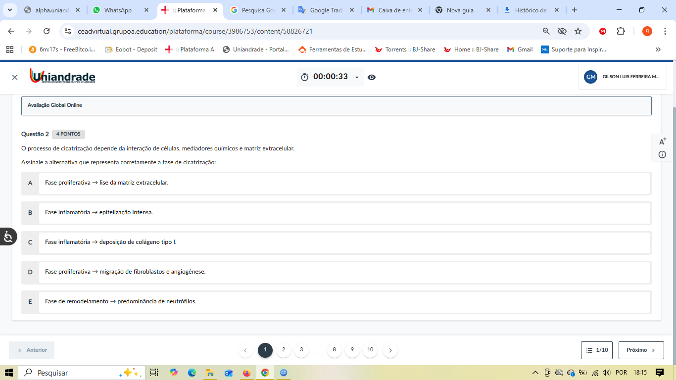 alpha.uniand WhatsApp X + Plataforma Pesquisa Go Google Trad M Caixa de ent Nova guia Histórico de X + X ceadvirtual.grupoa.education/plataforma/course/3986753/content/5882672 g : 6m:17s Eobot Deposit Plataforma A Uniandrade Portal... Ferramentas de Estu... Torrents BJ-Share Home BJ-Share Gmail Suporte para Inspir... X Uniandrade 00:00:33 GM GILSON LUIS FERREIRA M... Avaliação Global Online Questão 2 4 PONTOS O processo de cicatrização depende da interação de células, mediadores químicos e matriz extracelular. Assinale a alternativa que representa corretamente a fase de cicatrização: A Fase proliferativa lise da matriz extracelular. Fase inflamatória epitelização intensa. C Fase inflamatória deposição de colágeno tipo D Fase proliferativa migração de fibroblastos e angiogênese. E Fase de remodelamento predominância de neutrófilos. !!! 1/10 Proximo > Pesquisar POR 18:15