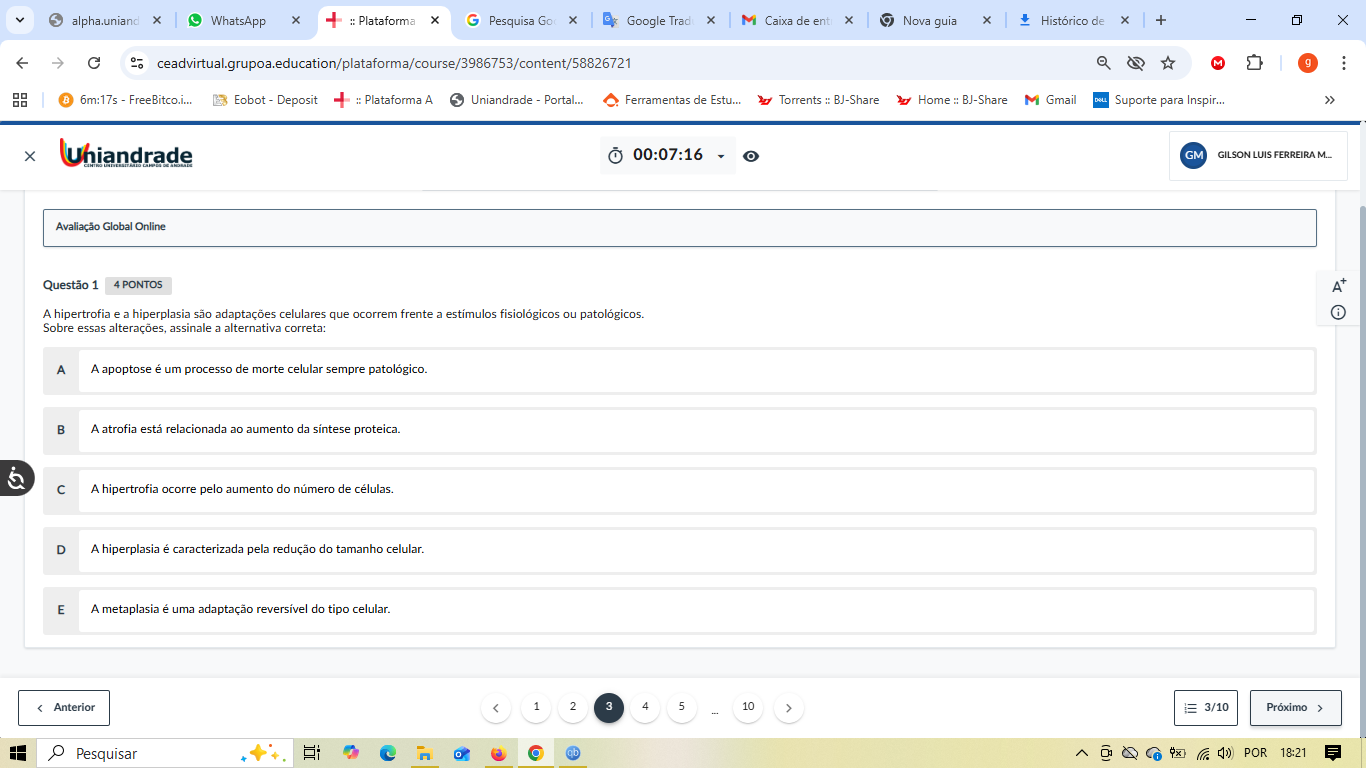 alpha.uniand X WhatsApp + Plataforma Pesquisa Go Google Trad Caixa de ent Nova guia Histórico de X + X ceadvirtual.grupoa.education/plataforma/course/3986753/content/58826721 g : 6m:17s Eobot Deposit Plataforma A Uniandrade Portal... Ferramentas de Estu... Torrents BJ-Share Home BJ-Share Gmail Suporte para Inspir... X 00:07:16 GM GILSON LUIS FERREIRA M... Avaliação Global Online Questão 1 4 PONTOS A hipertrofia e a hiperplasia são adaptações celulares que ocorrem frente a estímulos fisiológicos ou patológicos. Sobre essas alterações, assinale a alternativa correta: A A apoptose é um processo de morte celular sempre patológico. A atrofia está relacionada ao aumento da sintese proteica. C A hipertrofia ocorre pelo aumento do de células. D A hiperplasia é caracterizada pela redução do tamanho celular. E A metaplasia é uma adaptação do tipo celular. 3/10 Proximo > Pesquisar POR 18:21