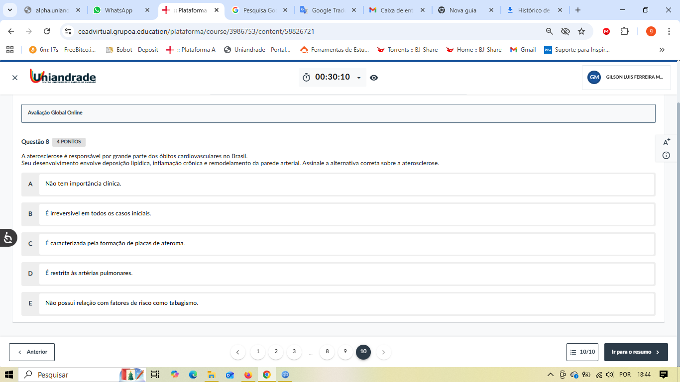 alpha.uniand WhatsApp X + Plataforma X Pesquisa Go Google Trad Caixa de ent Nova guia Histórico de X + X ceadvirtual.grupoa.education/plataforma/course/3986753/content/58826721 g : 6m:17s Eobot Deposit Plataforma A Uniandrade Portal... Ferramentas de Estu... Torrents BJ-Share Home BJ-Share M Gmail Suporte para Inspir... X 00:30:10 GM GILSON LUIS FERREIRA M... Avaliação Global Online Questão 8 4 PONTOS A aterosclerose é responsável por grande parte dos óbitos cardiovasculares no Brasil. i Seu desenvolvimento envolve deposição lipídica, inflamação crônica e remodelamento da parede arterial. Assinale a alternativa correta sobre a aterosclerose. A Não tem importância clínica. É irreversível em todos os casos iniciais. C É caracterizada pela formação de placas de ateroma. D É restrita às artérias pulmonares. E Não possui relação com fatores de risco como tabagismo. 10/10 Ir para resumo > Pesquisar POR 18:44