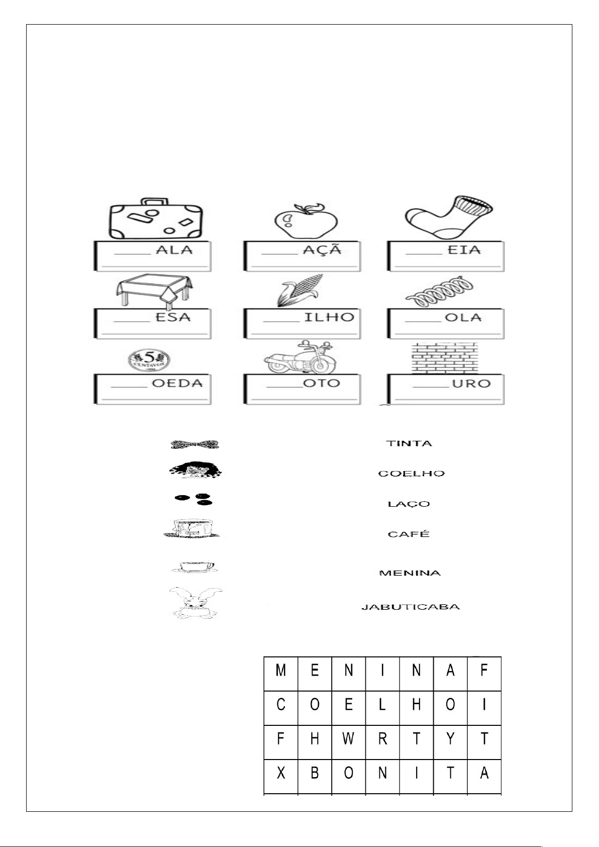 CARUARU, __________ DE ____________________________________ DE 2024. ESCOLA:____________________________________________________________________________________________ NOME:_____________________________________________________________________________________________ PROFESSORA:______________________________________________ TURMA:_________________________________ ATIVIDADE 1-COMPLETE COM AS SÍLABAS MA, ME, MI, MO E MU: 2-LIGUE A IMAGEM AO NOME : 3-ENCONTRE NO CAÇA-PALAVRAS AS PALAVRAS: MENINA - COELHO - BONITA FAZENDO ARTE MENINA BONITA DO LAÇO DE FITA DESENHE OS CABELOS DA MENINA BONITA DO LAÇO DE FITA E DEPOIS COLE ENFEITES: image1.jpeg image2.jpeg image3.jpeg image4.jpeg