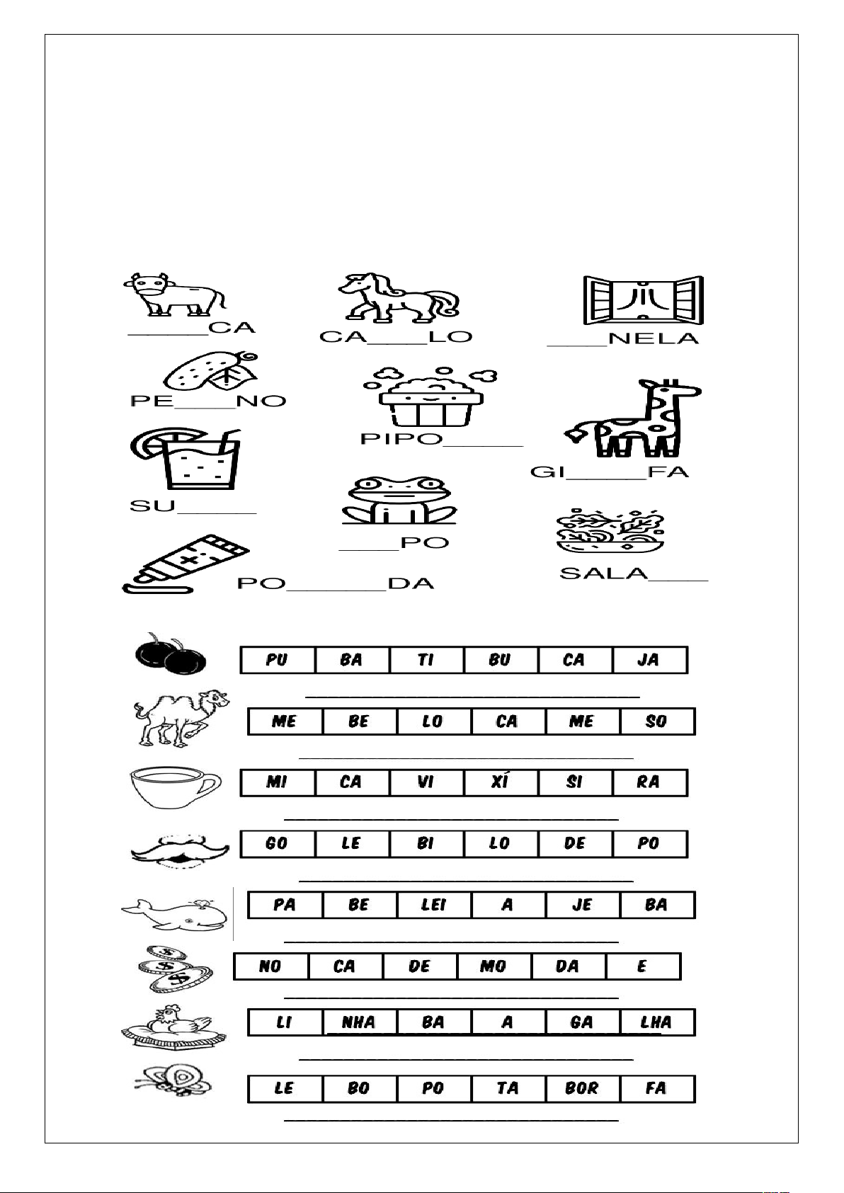 CARUARU, __________ DE ____________________________________ DE 2024. ESCOLA:____________________________________________________________________________________________ NOME:_____________________________________________________________________________________________ PROFESSORA:______________________________________________ TURMA:_________________________________ ATIVIDADE 1-COMPLETE AS PALAVRAS COM AS SÍLABAS QUE FALTAM: 2-CIRCULE AS SÍLABAS QUE FORMAM O NOME DE CADA FIGURA : image1.png image2.jpeg