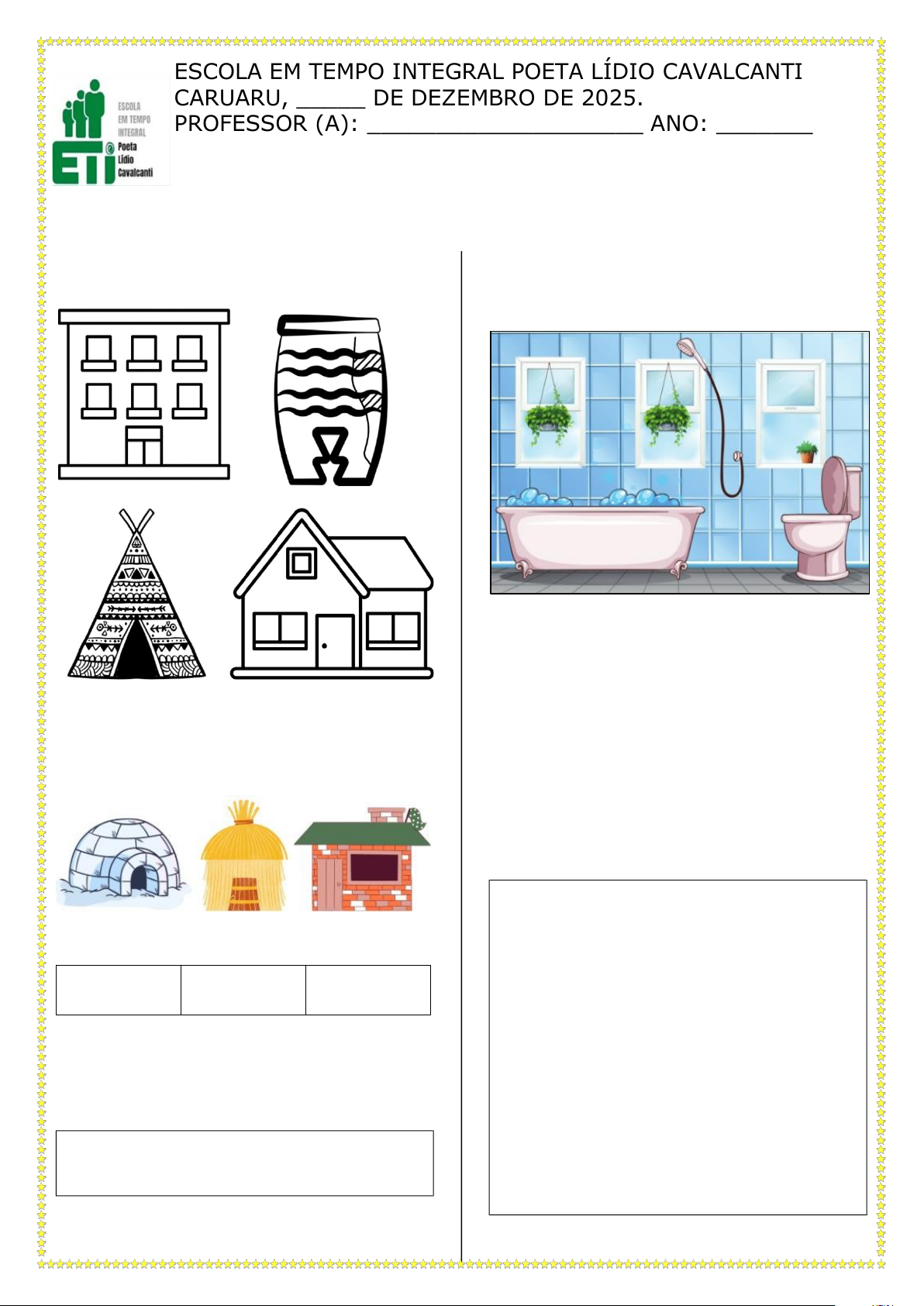 ESCOLA EM TEMPO INTEGRAL POETA LÍDIO CAVALCANTI CARUARU, _____ DE DEZEMBRO DE 2025. PROFESSOR (A): ____________________ ANO: _______ ESTUDANTE: ____________________________________ Atividade Avaliativa de Geografia IV Unidade 1. PINTE A MORADIA QUE MAIS SE PARECE COM A SUA. 2. LIGUE AS MORADIAS AO PRINCIPAL MATERIAL UTILIZADO EM SUA CONSTRUÇÃO. TIJOLO GELO PALHA 3. ESCREVAO NOME DOMATERIAL UTILIZADO NA CONSTRUÇÃO DE SUA MORADIA. 4. EXISTEM DIVERSOS TIPOS DE CÔMODOS PRESENTES NAS MORADIAS. OBSERVE. OS CÔMODOS POSSUEM VÁRIAS FUNÇÕES. O CÔMODO REPRESENTADO NA IMAGEM ACIMA SERVE PARA: a) DORMIR. b) COMER. c) ESTUDAR d) TOMAR BANHO. 5. REPRESENTE, NO ESPAÇO ABAIXO, SUA MORADIA POR MEIO DE DESENHOS.