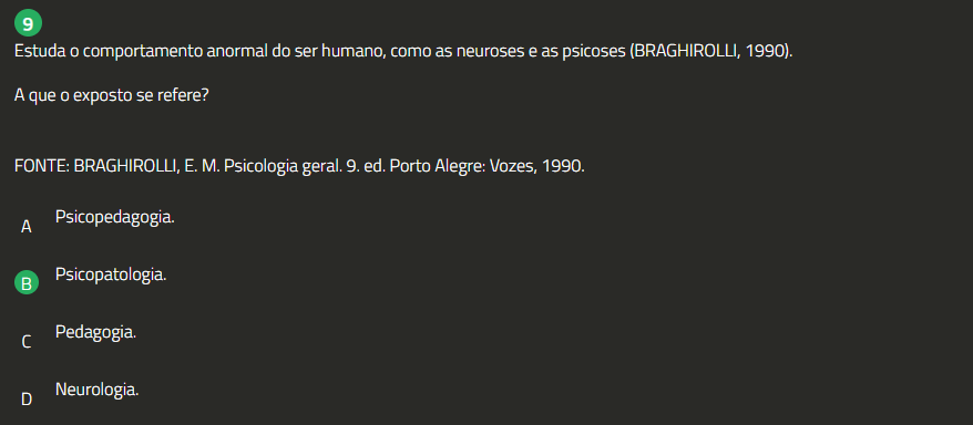 9 Estuda comportamento anormal do ser humano, como as neuroses e as psicoses (BRAGHIROLLI, 1990). A que exposto se refere? FONTE: BRAGHIROLLI, E.M. Psicologia geral. 9. ed. Porto Alegre: Vozes, 1990. A Psicopedagogia. B Psicopatologia. Pedagogia. D Neurologia.