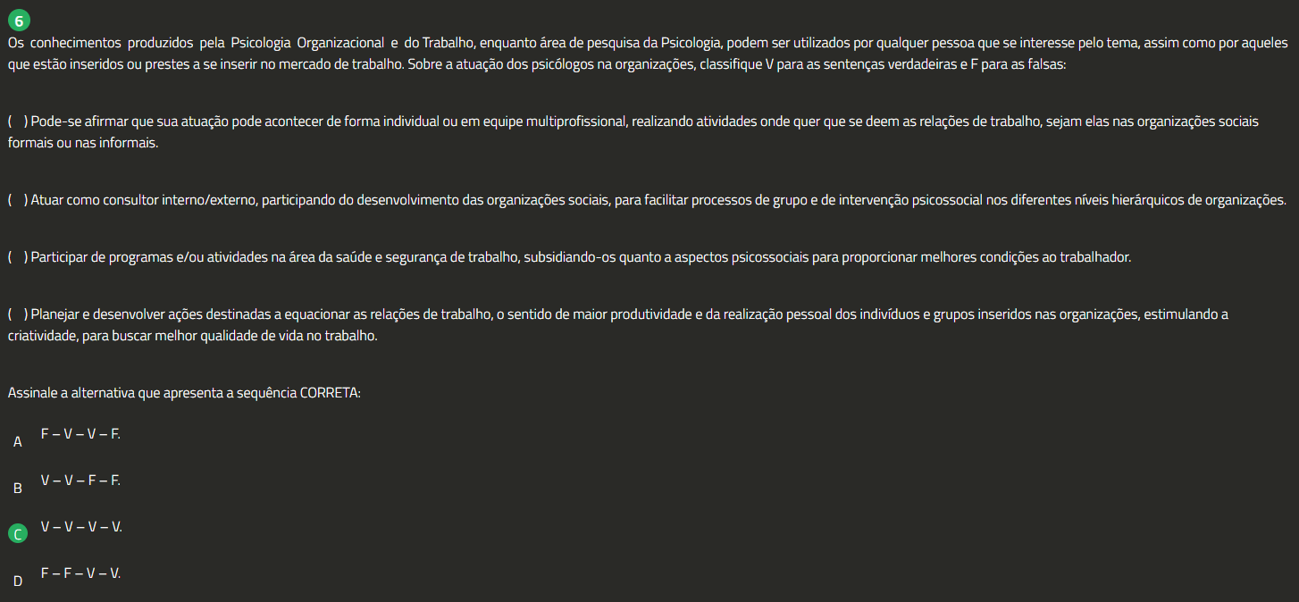 6 Os conhecimentos produzidos pela Psicologia Organizacional e do Trabalho, enquanto área de pesquisa da Psicologia, podem ser utilizados por qualquer pessoa que se interesse pelo tema, assim como por aqueles que estão inseridos ou prestes a se inserir no mercado de trabalho. Sobre a atuação dos psicólogos na organizações, classifique V para as sentenças verdadeiras eF para as falsas: ( ) Pode-se afirmar que sua atuação pode acontecer de forma individual ou em equipe multiprofissional, realizando atividades onde quer que se deem as relações de trabalho, sejam elas nas organizações sociais formais ou nas informais. ( ) Atuar como consultor interno/externo, participando do desenvolvimento das organizações sociais, para facilitar processos de grupo e de intervenção psicossocial nos diferentes níveis hierárquicos de organizações. ( ) Participar de programas e/ou atividades na área da saúde e segurança de trabalho, subsidiando-os quanto a aspectos psicossociais para proporcionar melhores condições ao trabalhador. ( ) Planejar e desenvolver ações destinadas a equacionar as relações de trabalho, 0 sentido de maior produtividade e da realização pessoal dos indivíduos e grupos inseridos nas organizações, estimulando a criatividade, para buscar melhor qualidade de vida no trabalho. Assinale a alternativa que apresenta a sequência CORRETA: A B F-F-V-V. D