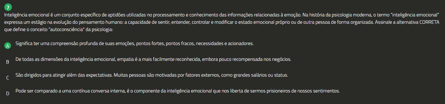 7 Inteligência emocional é um conjunto específico de aptidões utilizadas no processamento e conhecimento das informações relacionadas à emoção. Na história da psicologia moderna, 0 termo "inteligência emocional" expressa um estágio na evolução do pensamento humano: a capacidade de sentir, entender, controlar e modificar 0 estado emocional próprio ou de outra pessoa de forma organizada. Assinale a alternativa CORRETA que define 0 conceito "autoconsciência" da psicologia: A Significa ter uma compreensão profunda de suas emoções, pontos fortes, pontos fracos, necessidades e acionadores. De todas as dimensões da inteligência emocional, empatia é a mais facilmente reconhecida, embora pouco recompensada nos negócios. São dirigidos para atingir além das expectativas. Muitas pessoas são motivadas por fatores externos, como grandes salários ou status. D Pode ser comparado a uma contínua conversa interna, é 0 componente da inteligência emocional que nos liberta de sermos prisioneiros de nossos sentimentos.