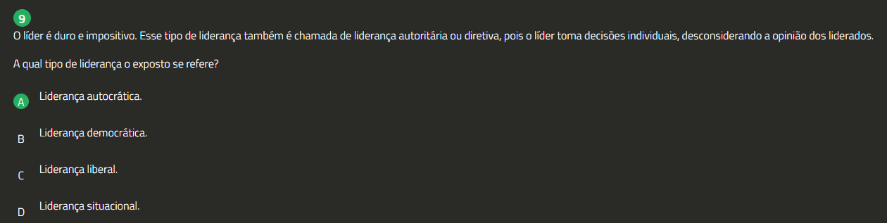 9 0 é duro e impositivo. Esse tipo de liderança também é chamada de liderança ou diretiva, pois 0 toma decisões individuais, desconsiderando a opinião dos liderados. A qual tipo de liderança 0 exposto se refere? A Liderança autocrática. Liderança democrática. Liderança liberal. D Liderança situacional.