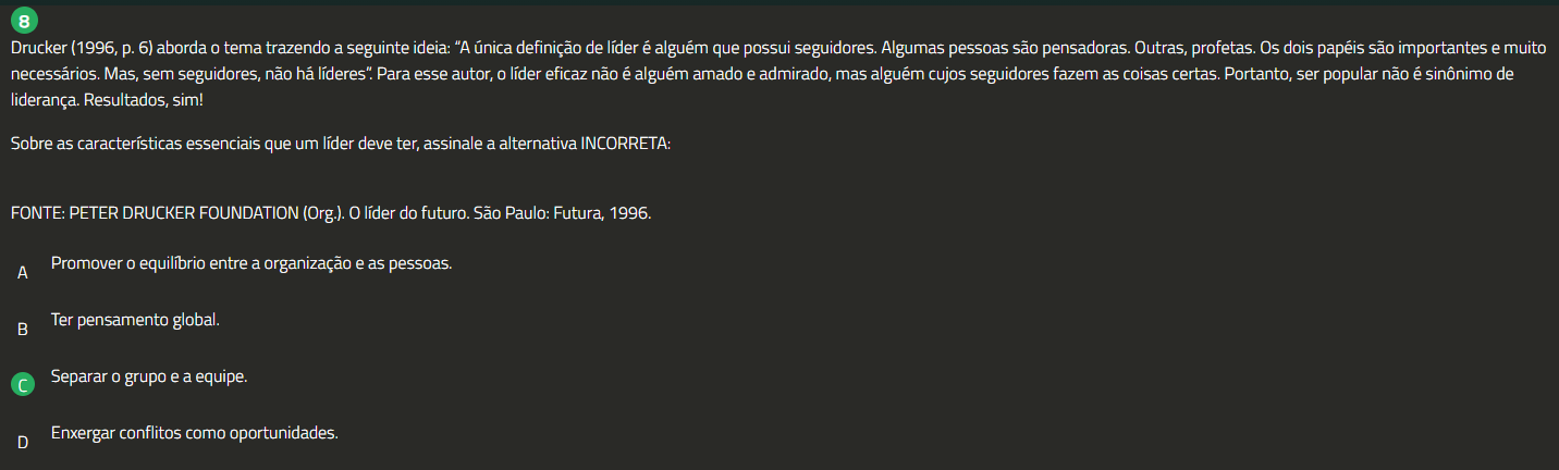 8 Drucker (1996, p. 6) aborda 0 tema trazendo a seguinte ideia: "A única definição de é alguém que possui seguidores. Algumas pessoas são pensadoras. Outras, profetas. Os dois papéis são importantes e muito necessários. Mas, sem seguidores, não há líderes". Para esse autor, 0 eficaz não é alguém amado e admirado, mas alguém cujos seguidores fazem as coisas certas. Portanto, ser popular não é sinônimo de liderança. Resultados, sim! Sobre as características essenciais que um deve ter, assinale a alternativa INCORRETA: FONTE: PETER DRUCKER FOUNDATION (Org.). 0 do futuro. São Paulo: Futura, 1996. A Promover 0 entre a organização e as pessoas. Ter pensamento global. Separar grupo e a equipe. D Enxergar conflitos como oportunidades.