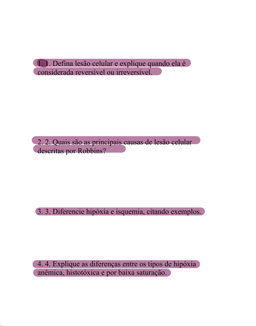 Patologia Geral – Lesão Celular: 25 Questões com Gabarito 1. 1. Defina lesão celular e explique quando ela é considerada reversível ou irreversível. Gabarito: Lesão celular é qualquer alteração estrutural ou funcional causada por um estímulo nocivo que ultrapassa a capacidade de adaptação celular. É reversível quando a célula pode recuperar-se com a remoção do agente agressor; é irreversível quando evolui para morte celular (necrose ou apoptose). 2. 2. Quais são as principais causas de lesão celular descritas por Robbins? Gabarito: Hipóxia (por isquemia, anemias, insuficiência respiratória), agentes físicos (trauma, temperatura), agentes químicos e drogas, agentes infecciosos, reações imunológicas, alterações genéticas, desequilíbrio nutricional e envelhecimento. 3. 3. Diferencie hipóxia e isquemia, citando exemplos. Gabarito: Hipóxia é a redução do oxigênio tecidual, podendo ocorrer mesmo com fluxo sanguíneo normal. Isquemia é a redução do fluxo sanguíneo, que causa hipóxia, como em trombose ou embolia. 4. 4. Explique as diferenças entre os tipos de hipóxia: anêmica, histotóxica e por baixa saturação. Gabarito: Anêmica: pouca hemoglobina para transportar O2 (ex.: anemias graves). Histotóxica: células incapazes de usar O2 (ex.: intoxicação por cianeto). Baixa saturação: diminuição de O2 no ambiente ou pulmões (ex.: pneumonia grave). 5. 5. Cite e explique como agentes físicos podem provocar lesão celular. Gabarito: Trauma mecânico, calor, frio, variações de pressão e radiação podem danificar membranas, organelas e DNA, interferindo nos processos metabólicos celulares. 6. 6. Descreva o mecanismo de lesão celular provocado por agentes químicos e drogas. Gabarito: Podem agir diretamente, liberando toxinas que danificam membranas e proteínas, ou indiretamente, gerando radicais livres que afetam organelas. 7. 7. Explique de que forma agentes infecciosos lesam as células. Gabarito: Bactérias, vírus, fungos e parasitas podem destruir células diretamente, liberar toxinas ou induzir resposta inflamatória intensa, causando dano tecidual. 8. 8. O que são reações imunológicas exageradas e qual seu impacto sobre as células? Gabarito: São respostas autoimunes ou alérgicas desproporcionais que danificam tecidos, destruindo células e provocando inflamação crônica. 9. 9. Como alterações genéticas podem causar lesão celular? Dê exemplos. Gabarito: Mutação em genes estruturais ou enzimáticos resulta em proteínas defeituosas e metabolismo anormal. Ex.: fibrose cística, anemia falciforme. 10. 10. Qual é o papel do desequilíbrio nutricional na lesão celular? Gabarito: Carências (ex.: vitaminas) ou excessos (ex.: lipídios) comprometem o metabolismo, a síntese proteica e a reparação tecidual, favorecendo degeneração e morte celular. 11. 11. De que forma o envelhecimento celular contribui para a morte celular? Gabarito: Há acúmulo de danos no DNA, perda de capacidade de reparo e encurtamento dos telômeros, levando à apoptose ou senescência celular. 12. 12. Explique a frase: “A lesão celular é resultante de diferentes mecanismos bioquímicos que agem em vários componentes celulares essenciais”. Gabarito: Significa que o dano resulta de múltiplos fatores simultâneos, como depleção de ATP, falha de bombas de íons, estresse oxidativo e lesão de membranas. 13. 13. Quais são as principais alterações bioquímicas observadas em uma lesão celular? Gabarito: Depleção de ATP, falha na fosforilação oxidativa, entrada de cálcio, produção de radicais livres, danos mitocondriais e disfunção de membranas. 14. 14. O que é depleção de ATP e quais as consequências para a célula? Gabarito: É a diminuição do ATP por hipóxia ou toxinas, comprometendo bombas de íons, síntese proteica e integridade de membranas, levando a tumefação e necrose. 15. 15. Explique os danos mitocondriais e suas consequências. Gabarito: Provocam redução na produção de ATP, liberação de citocromo c e ativação de apoptose, além de aumento de radicais livres. 16. 16. Descreva a tumefação celular (degeneração hidrópica/vacuolar) e seus mecanismos. Gabarito: É o inchaço celular causado por falha da bomba Na+/K+-ATPase e acúmulo de Na+ e água, com vacúolos claros e inchaço nebuloso. 17. 17. Quais são as principais características microscópicas de uma lesão celular reversível? Gabarito: Tumefação celular, vacuolização, degeneração gordurosa e desorganização leve de organelas. 18. 18. Conceitue degeneração gordurosa e relacione com suas causas mais comuns. Gabarito: Acúmulo de lipídios no citoplasma, comum no fígado, coração e rins, causada por hipóxia, alcoolismo, obesidade, diabetes e desnutrição. 19. 19. Diferencie metaplasia, hipertrofia, hiperplasia, atrofia e neoplasia, incluindo um exemplo clínico para cada uma. Gabarito: Metaplasia: substituição de um tipo celular por outro (ex.: epitélio respiratório em fumantes). Hipertrofia: aumento do tamanho celular (ex.: músculo cardíaco). Hiperplasia: aumento do número de células (ex.: endométrio). Atrofia: diminuição do tamanho celular (ex.: desuso muscular). Neoplasia: proliferação descontrolada (ex.: câncer). 20. 20. Por que a retirada precoce do estímulo nocivo pode evitar a progressão para lesão irreversível? Gabarito: Porque as alterações bioquímicas iniciais ainda são compatíveis com a recuperação, impedindo danos estruturais permanentes. 21. 21. Em relação à morte celular, descreva as diferenças morfológicas entre necrose e apoptose. Gabarito: Necrose: morte desordenada com ruptura de membrana e inflamação. Apoptose: morte programada, com condensação nuclear e formação de corpos apoptóticos sem inflamação. 22. 22. Explique a importância do fenótipo genético da célula na resposta à agressão. Gabarito: Variações genéticas influenciam a capacidade de resposta, reparo e a