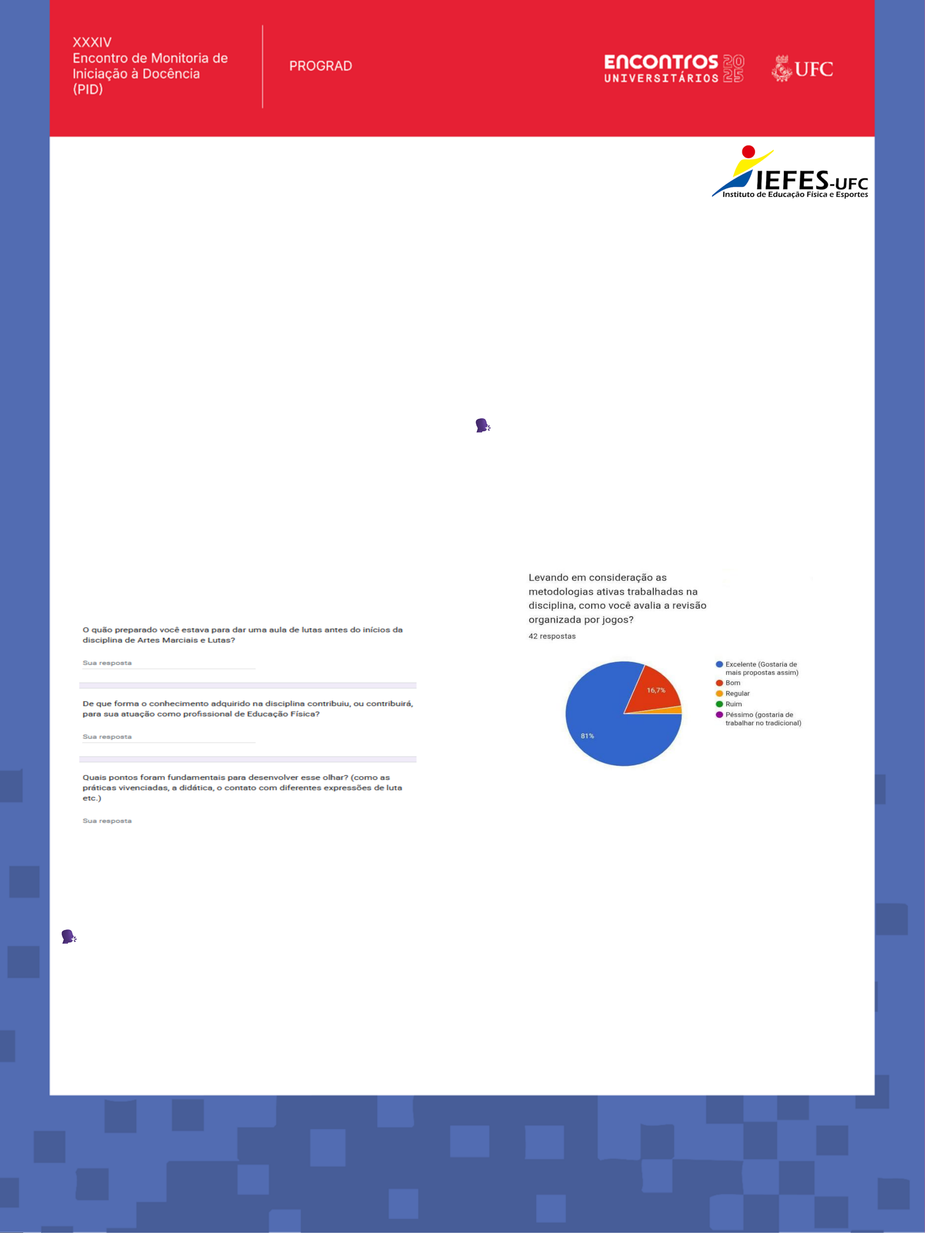 LUTAS E O PROFISSIONAL DE EDUCAÇÃO FÍSICA: UM OLHAR DOS ALUNOS DE EDUCAÇÃO FÍSICA DA UFC ACERCA DO ENSINO DAS LUTAS APÓS OS CONHECIMENTOS ADQUIRIDOS NADISCIPLINA DE ARTESMARCIAIS E CAPOEIRA. Maxwemy Andrade Vieira; Victor Silveira Coswig INTRODUÇÃO ✓ As lutas e artes marciais promovem disciplina, respeito, autocontrole e cooperação ✓ Inseridas na Educação Física, valorizam a diversidade de práticas corporais ✓ Formar profissionais mais sensíveis e preparados para atuar em diferentes contextos educativos. OBJETIVOS Analisar as percepções de estudantes de Educação Física da UFC sobre o ensino das lutas e sua importância na formação como Profissional de Educação Física a partir dos conhecimentos adquiridos na disciplina de Artes Marciais e Capoeira. MÉTODO ✓ Análise qualitativa; ✓ Questionário - estudantes do curso de Educação Física da UFC que estão cursando ou já cursaram a disciplina de Ginástica I; ✓ 30 alunos; ✓ Três perguntas norteadoras sobre preparo, contribuição e pontos fundamentais: RESULTADOS: Analisando as respostas da pesquisa, podemos observar que, em relação a primeira pergunta, 70% relataram baixa preparação antes da disciplina, 20% relataram preparo intermediário e 10% relataram boa preparação prévia. Depoimentos destacam insegurança inicial quanto à didática e aplicação prática das lutas. Em relação à segunda pergunta, todos responderam que as práticas vivenciadas nas disciplinas foram ponto chave para fixação do conhecimento das modalidades e suas especificidades; 90% relataram mudança significativa na segurança para ensinar lutas e 10% apontaram contribuição moderada. Os aspectos mais citados: ✓ Práticas vivenciadas nas aulas; ✓ Contato com diferentes modalidades (Capoeira, Judô, Luta Marajoara, etc); ✓ Discussões pedagógicas sobre segurança emetodologia. Já em relação à terceira pergunta, os pontos mais mencionados pelos alunos foram: ✓ Vivências práticas e simulações de aula (83%); ✓ Didática aplicada e feedback do docente (67%); ✓ Compreensão cultural das lutas (60%). “A disciplina de lutas me fez perceber que as lutas podem ser ensinadas com segurança e respeito no ambiente tanto escolar como em academias.” Por último, foi aplicado um formulário no último dia de aula da turma de 2025.2 da disciplina de Artes Marciais e Capoeira como forma de revisão para a prova e na última pergunta os alunos responderam uma pergunta sobre as metodologias ativas, obtendo os seguintes resultados: DISCUSSÃO Análise dos resultados: ✓ A vivência prática ampliou a confiança docente dos alunos; ✓ Houve integração entre teoria e prática, fortalecendo a visão pedagógica sobre as lutas; ✓ A percepção de risco foi substituída por uma visão educativa e cultural dessas práticas. CONCLUSÃO: Concluímos que a disciplina de Artes Marciais e Capoeira foi essencial para transformar a percepção dos alunos sobre o ensino das lutas. O conhecimento adquirido gerou mudança significativa na segurança dos futuros profissionais, bem como compreender que as lutas, quando bem orientadas, são ferramentas educativas potentes para o desenvolvimento físico, emocional e social dos praticantes. Slide 1