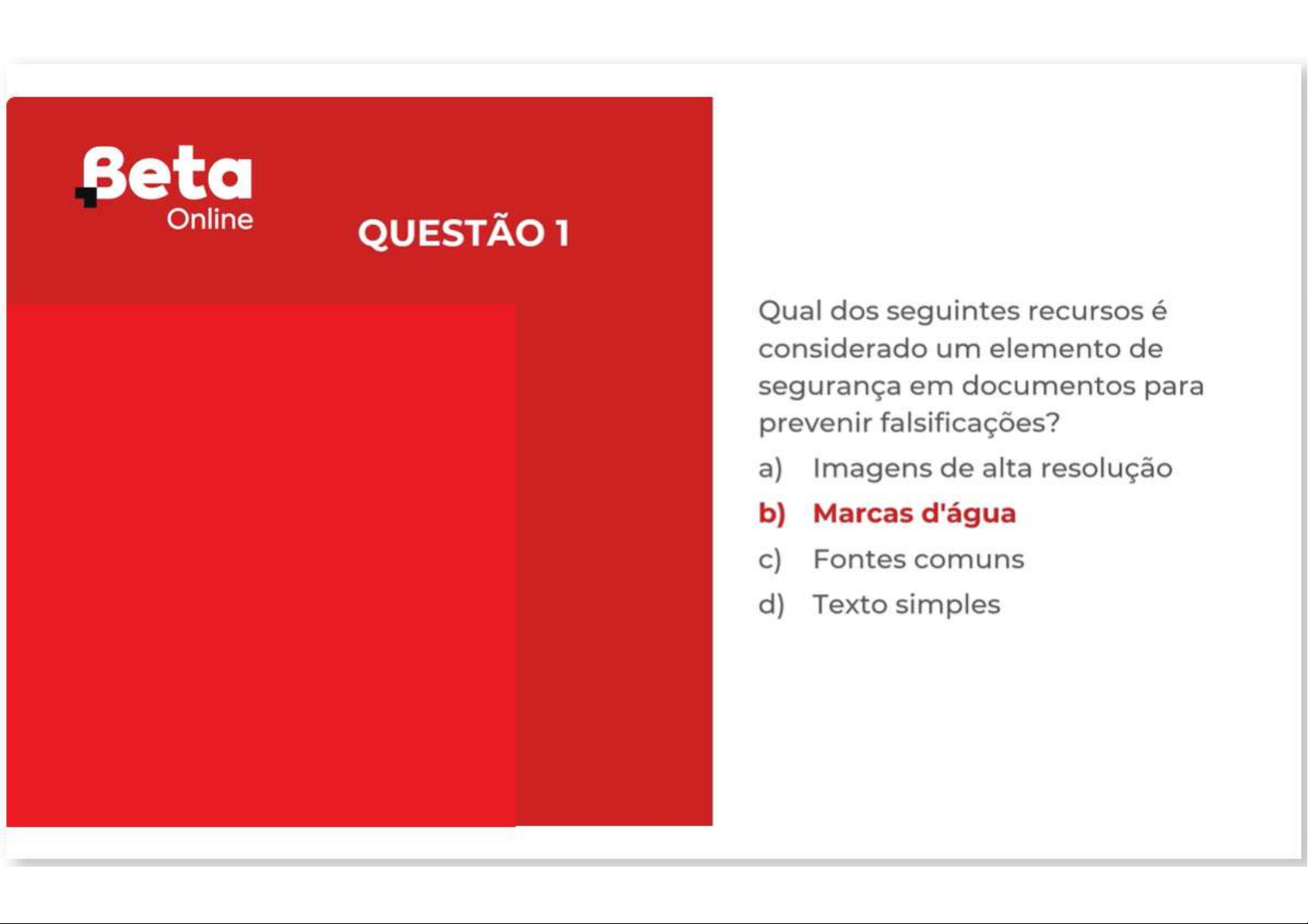 Beta Online Qual dos seguintes recursos é considerado um elemento de segurança em documentos para prevenir falsificações? a) Imagens de alta resolução b) Marcas d'água c) Fontes comuns d) Texto simplesBeta Online QUESTÃO 2 Qual tipo de falsificação ocorre quando falsificador cria um documento completamente novo sem tentar imitar diretamente um documento ou assinatura existente? a) Falsificação sem imitação b) Falsificação por imitação de memória c) Falsificação por imitação servil d) Falsificação por imitação exercitadaBeta Online QUESTÃO 3 Na falsificação por imitação de memória, falsificador tenta reproduzir um documento ou assinatura baseado em: a) Ferramentas digitais avançadas b) Técnicas de decalque c) Sua memória visual d) Imitação servilBeta Online QUESTÃO 4 Uma das formas de combater a falsificação de documentos é através de: a) Censura de informações b) Capacitação e treinamento de profissionais c) Privatização de serviços públicos d) Liberalização das leisBeta Online QUESTÃO 5 A cooperação entre instituições e autoridades é fundamental para: a) Reduzir a burocracia b) Facilitar a livre circulação de pessoas c) Criar barreiras comerciais d) Enfrentar e prevenir fraudes documentais organizadasBeta Online QUESTÃO 6 Falsificações totais são fraudes documentais que envolvem: a) Criação completa de documentos falsos b) Uso indevido de documentos autênticos c) Adulterações e alterações d) Fraudes digitaisBeta Online QUESTÃO 7 Adulterações e alterações são fraudes documentais que consistem em: a) Criação completa de documentos falsos b) Uso indevido de documentos autênticos c) Modificação de documentos originais d) Fraudes digitaisBeta Online QUESTÃO 8 No ambiente digital, a falsificação de documentos pode incluir: a) Assinaturas manuscritas b) Assinaturas digitais c) Marcas d'água d) MicroimpressõesBeta Online QUESTÃO 9 A responsabilidade social no combate à fraude documental envolve: a) Conscientização e educação da população b) Aumento das penas para fraudadores c) Controle rígido das informações pessoais d) Restrição do acesso a documentos públicosBeta Online QUESTÃO 10 Quando uma pessoa falsifica seus próprios documentos ou assinaturas com objetivo de cometer fraude, evitar responsabilidades legais ou obter benefícios indevidos, isso é chamado de: a) Falsificação por imitação exercitada b) Simulação de falso c) Falsificação por decalque ou transferência d) Autofalsificação