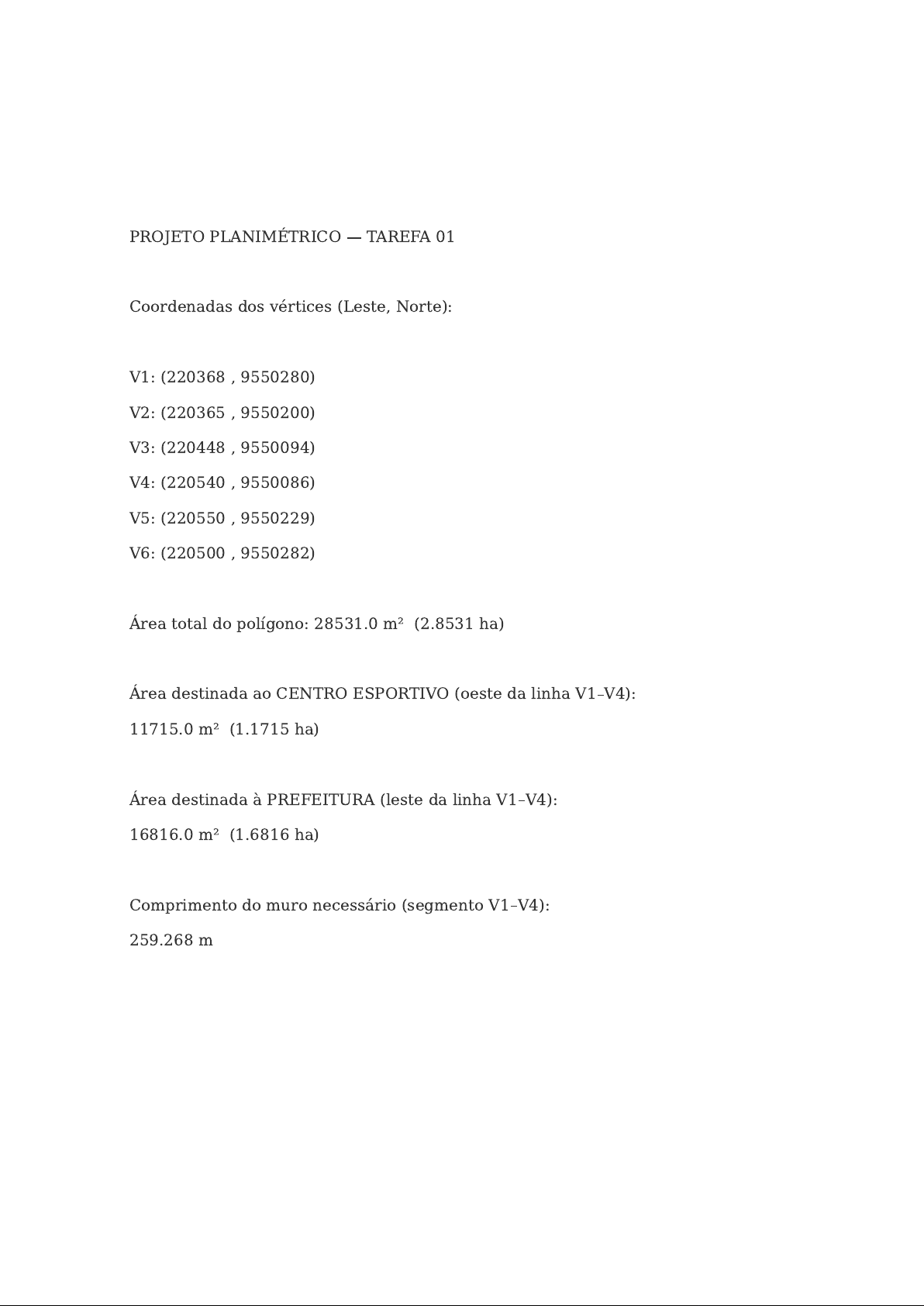 PROJETO PLANIMÉTRICO TAREFA 01 Coordenadas dos vértices (Leste, Norte): V1: (220368 , 9550280) V2: (220365 , 9550200) V3: (220448 , 9550094) V4: (220540 , 9550086) V5: (220550 , 9550229) V6: (220500 , 9550282) Área total do polígono: 28531.0 m² (2.8531 ha) Área destinada ao CENTRO ESPORTIVO (oeste da linha V1 V4): 11715.0 m² (1.1715 ha) Área destinada à PREFEITURA (leste da linha V1 V4): 16816.0 m² (1.6816 ha) Comprimento do muro necessário (segmento V1 V4): 259.268 m 220375 220400 220425 220450 220475 220500 220525 220550 Leste (m) 100 125 150 175 200 225 250 275 No rte (m ) +9.55e6 V1 V2 V3 V4 V5 V6 Planta Planimétrica Áreas Divididas (Tudo em Português)