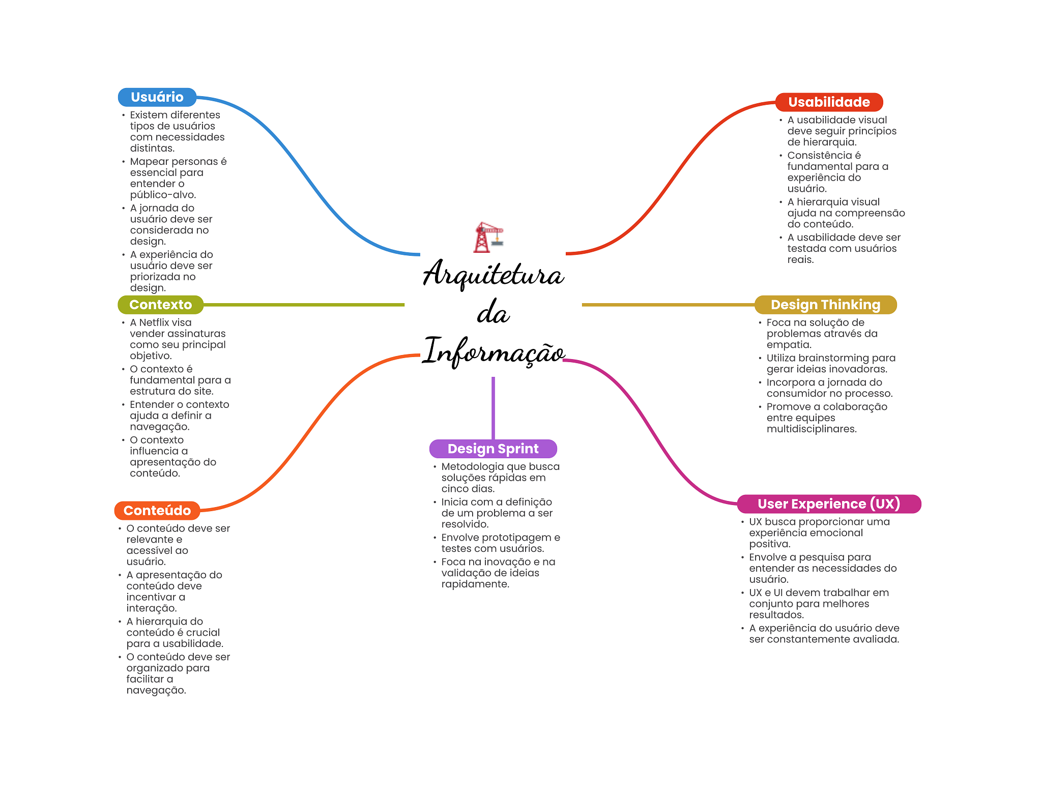 Usuário Usabilidade Existem diferentes A usabilidade visual tipos de usuários com necessidades deve seguir princípios distintas. de hierarquia. Consistência é Mapear personas é fundamental para a essencial para experiência do entender usuário. público-alvo. A hierarquia visual A jornada do usuário deve ser ajuda na compreensão do conteúdo. considerada no design. A usabilidade deve ser testada com usuários A experiência do reais. usuário deve ser priorizada no Arquitetura design. Contexto da Design Thinking A Netflix visa Foca na de vender assinaturas problemas através da como seu principal objetivo. Informação empatia. Utiliza brainstorming para contexto é gerar ideias inovadoras. fundamental para a Incorpora a jornada do estrutura do site. consumidor no processo. Entender contexto Promove a colaboração ajuda a definir a entre equipes navegação. multidisciplinares. contexto influencia a Design Sprint apresentação do Metodologia que busca conteúdo. soluções rápidas em cinco dias. Inicia com a definição Conteúdo User Experience (UX) de um problema a ser conteúdo deve ser resolvido. UX busca proporcionar uma Envolve prototipagem e experiência emocional relevante e testes com usuários. positiva. acessível ao usuário. Foca na inovação e na Envolve a pesquisa para entender as necessidades do A apresentação do validação de ideias usuário. conteúdo deve rapidamente. incentivar a UX e UI devem trabalhar em interação. conjunto para melhores resultados. A hierarquia do conteúdo é crucial A experiência do usuário deve para a usabilidade. ser constantemente avaliada. conteúdo deve ser organizado para facilitar a navegação.