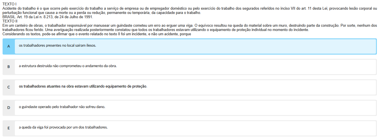 TEXTO I Acidente do trabalho é 0 que ocorre pelo exercício do trabalho a serviço de empresa ou de empregador doméstico ou pelo exercício do trabalho dos segurados referidos no inciso VII do art. 11 desta Lei, provocando lesão corporal ou perturbação funcional que cause a morte ou a perda ou redução, permanente ou temporária, da capacidade para 0 BRASIL Art. 19 da Lei n. 8.213, de 24 de Julho de 1991. TEXTO II Em um canteiro de obras, trabalhador responsável por manusear um guindaste cometeu um erro ao erguer uma viga. O equívoco resultou na queda do material sobre um muro, destruindo parte da construção. Por sorte, nenhum dos trabalhadores ficou ferido. Uma averiguação realizada posteriormente constatou que todos trabalhadores estavam utilizando 0 equipamento de proteção individual no momento do incidente. Considerando os textos, pode-se afirmar que 0 evento relatado no texto II foi um incidente, e não um acidente, porque A trabalhadores presentes no local ilesos. B a estrutura destruída não comprometeu andamento da obra. C os trabalhadores atuantes na obra estavam utilizando equipamento de proteção. D O guindaste operado pelo trabalhador não sofreu dano. E a queda da viga foi provocada por um dos trabalhadores.