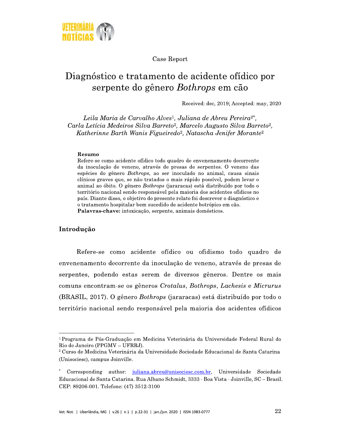 VETERINÁRIA NOTÍCIAS Case Report Diagnóstico e tratamento de acidente ofídico por serpente do gênero Bothrops em cão Received: dec, 2019; Accepted: may, 2020 Leila Maria de Carvalho Alves1, Juliana de Abreu Carla Letícia Medeiros Silva Marcelo Augusto Silva Katherinne Barth Wanis Natascha Jenifer Morante2 Resumo Refere-se como acidente ofídico todo quadro de envenenamento decorrente da inoculação de veneno, através de presas de serpentes. O veneno das espécies do gênero Bothrops, ao ser inoculado no animal, causa sinais clínicos graves que, se não tratados o mais rápido possível, podem levar o animal ao óbito. O gênero Bothrops (jararacas) está distribuído por todo o território nacional sendo responsável pela maioria dos acidentes ofídicos no Diante disso, o objetivo do presente relato foi descrever o diagnóstico e o tratamento hospitalar bem sucedido de acidente botrópico em cão. Palavras-chave: intoxicação, serpente, animais domésticos. Introdução Refere-se como acidente ofídico ou ofidismo todo quadro de envenenamento decorrente da inoculação de veneno, através de presas de serpentes, podendo estas serem de diversos gêneros. Dentre os mais comuns encontram-se os gêneros Crotalus, Bothrops, Lachesis e Micrurus (BRASIL, 2017). gênero Bothrops (jararacas) está distribuído por todo o território nacional sendo responsável pela maioria dos acidentes ofídicos 1 Programa de Pós-Graduação em Medicina Veterinária da Universidade Federal Rural do Rio de Janeiro (PPGMV UFRRJ). 2 Curso de Medicina Veterinária da Universidade Sociedade Educacional de Santa Catarina campus Corresponding author: Universidade Sociedade Educacional de Santa Catarina. Rua Albano Schmidt, 3333 - Boa Vista Joinville, SC Brasil. CEP: 89206-001. Telefone: (47) 3512-3100 Vet. Not. Uberlândia, MG v.26 n.1 p.22-31 jan./jun. 2020 ISSN 1983-0777 22Alves, Pereira, Barreto, Barreto, Figueiredo, Morante Diagnóstico e tratamento de acidente ofídico... no país (CHERUBINI et al., 2000; NASCIMENTO, 2000; FRANCO et al., 2001; NOGUEIRA, 2011). O veneno das espécies do gênero Bothrops, ao ser inoculado no animal, causa sinais clínicos como dor intensa, edema, eritrema, petéquias, hemorragia, hematúria, epistaxe, hematêmese, hipotensão e choque. Isso se dá principalmente devido à ação do veneno botrópico, pois este apresenta propriedades proteolíticas, necrosantes, anticoagulantes, vasculotóxicas, nefrotóxicas, miotóxicas e neurotóxicas (NOGUEIRA, 2011, BERNARDE, 2014; BLANCO, MELO, 2014; SILVA et al., 2018) Devido a importância desse tema, em virtude das poucas notificações de ocorrências e da baixa rotina de atendimentos em áreas urbanas, o objetivo do presente relato foi descrever o diagnóstico e o tratamento hospitalar bem sucedido de acidente botrópico em cão. Relato do caso Foi atendido um cão, macho, sem raça definida, com idade de 8 anos e com peso de 9,100 Kg; em clínica veterinária particular localizada na região metropolitana do Rio de Janeiro, onde os tutores relataram que o paciente havia sido picado na face por uma serpente. animal foi visualizado e morto pelos responsáveis pelo animal. cão apresentava como único sinal clínico um severo edema na face. Imagens da serpente permitiram ao médico-veterinário responsável identificar o animal como sendo do gênero Bothrops (Figura 01), confirmando a suspeita clínica inicial de acidente botrópico. Vet. Not. Uberlândia, MG I v.26 n.1 p.22-31 jan./jun. 2020 ISSN 1983-0777 23Alves, Pereira, Barreto, Barreto, Figueiredo, Morante Diagnóstico e tratamento de acidente ofídico... Figura 01: Imagens do animal causador do acidente. o padrão de coloração das escamas podendo variar entre cinza, verde, pardo, marrom e amarelo; com escama apresentando um desenho em "V" e região ventral de coloração clara e única permitiu a identificação da serpente como pertencente ao gênero Bothrops. Prontamente o paciente foi submetido a atendimento hospitalar, com implementação de fluidoterapia utilizando solução fisiológica NaCl 0,9% na taxa de infusão de 7,5 ml/hora; e administração de soro antiofídico polivalente veterinário (Master Soro Plus, Vencofarma) totalizando o volume administrado de 20 ml, por via subcutânea, conforme recomendação do fabricante; objetivando a completa neutralização do veneno e a interrupção das injúrias orgânicas causadas por este. Para controle das manifestações clínicas associadas aos processos infecciosos e inflamatórios oriundos da picada em si, bem como de possíveis efeitos sobre o trato gastrointestinal, foram administrados os seguintes fármacos: Dexametasona na dose de 1 mg/kg, em dose única, por via subcutânea, no momento do atendimento emergencial; Metronidazol na dose Vet. Not. Uberlândia, MG v.26 n.1 p.22-31 ISSN 1983-0777 24Alves, Pereira, Barreto, Barreto, Figueiredo, Morante Diagnóstico e tratamento de acidente ofídico... de 15 mg/kg, a cada 12 horas, por via endovenosa; Ceftriaxona na dose de 50 mg/kg, a cada 12 horas, por via endovenosa; soro antitetânico (Vencosat soro antitetânico liofilizado veterinário, Vencofarma) na dose de 5 mil UI/animal, em dose única, por via subcutânea, no momento do atendimento emergencial; Omeprazol na dose de 1 mg/kg, a cada 24 horas, por via endovenosa; e Meloxicam na dose de 0,1 mg/kg, a cada 24 horas, por via subcutânea, a partir do segundo dia de internação. Na admissão do paciente foi coletada amostra de sangue para exames de bioquímica sérica. Foi recomendada também a realização do hemograma, porém o tutor não autorizou o exame. Os resultados da análise bioquímica estão representados no Quadro 01. Quadro 01: Resultados bioquímicos, para avaliação da função hepática, oriundos da amostra obtida no momento da admissão do paciente Parâmetro Valor Referência ALT (TGP) 52 21 102 U/L AST (TGO) 146 23 66 U/L Fosfatase alcalina 597,9 20 156 U/L Ureia 32 15 40 mg/dL Durante o inte