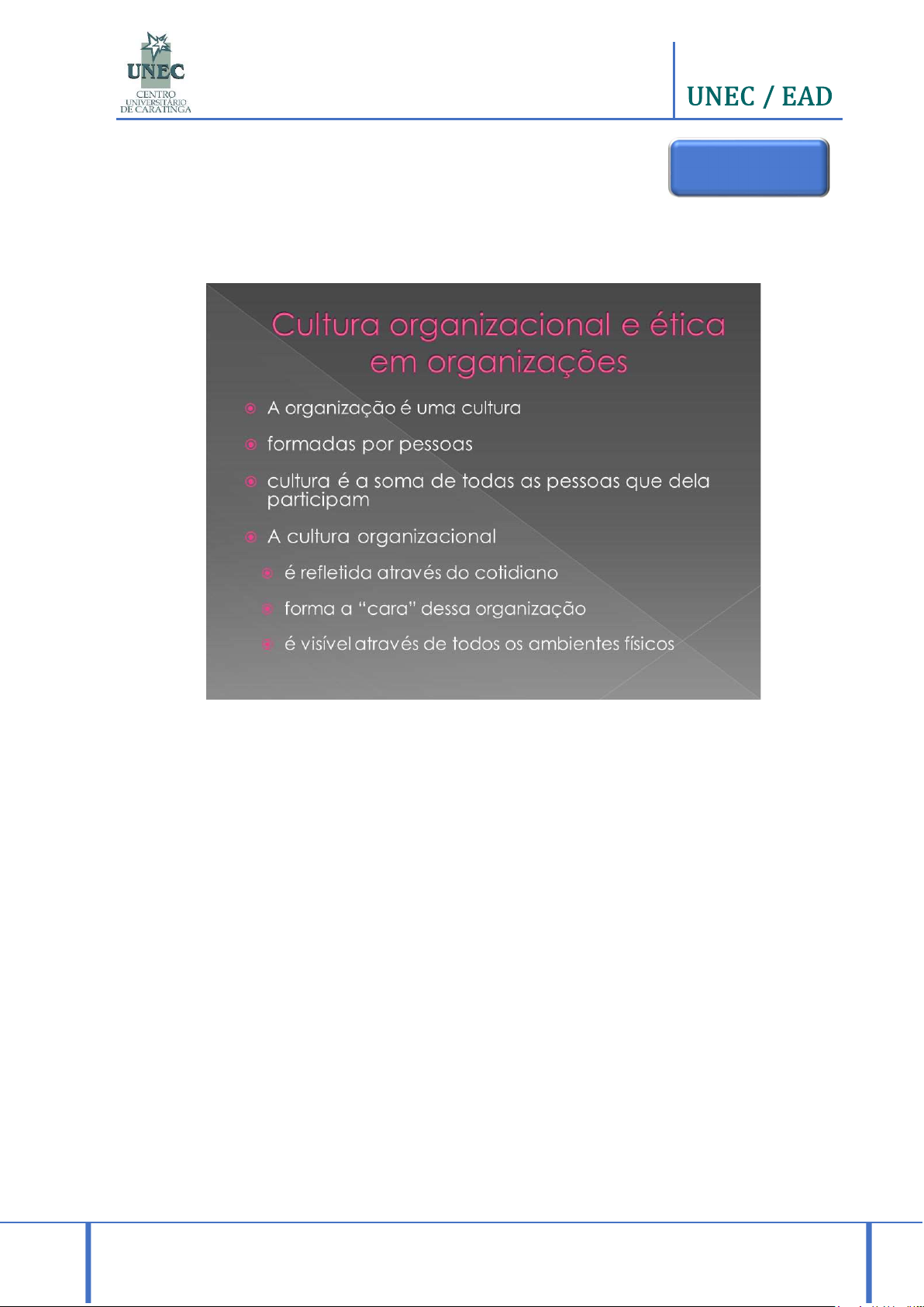 NÚCLEO DE ENSINO A DISTÂNCIA - NEAD Página | 48 secretariaead@funec.br GRADUAÇÃO CENTRO UNIVERSITÁRIO DE CARATINGA Ética, Cidadania e Legislação Profissional 5. CULTURA ORGANIZACIONAL E ÉTICA A cultura organizacional é um elemento fundamental que influencia diretamente a prá- tica da ética dentro de uma empresa. Reflete os valores, crenças e comportamentos que definem o ambiente de trabalho e moldam a forma como os colaboradores inte- ragem, tomam decisões e realizam suas atividades. Uma cultura ética não só contribui para um ambiente de trabalho saudável e respeitoso, mas também tem um impacto significativo na reputação e no desempenho organizacional. A cultura organizacional desempenha um papel vital na prática da ética, influenciando a maneira como os colaboradores se comportam e tomam decisões. Fomentar uma cultura ética requer liderança exemplar, políticas claras, um ambiente de confiança e monitoramento contínuo. O impacto de uma forte cultura ética é significativo, refle- tindo-se na reputação da empresa, no desempenho organizacional e na lealdade dos clientes e funcionários. Ao investir na construção e manutenção de uma cultura ética, as organizações podem alcançar não apenas o sucesso a curto prazo, mas também a sustentabilidade e o crescimento a longo prazo. AULA 5 NÚCLEO DE ENSINO A DISTÂNCIA - NEAD Página | 49 secretariaead@funec.br GRADUAÇÃO CENTRO UNIVERSITÁRIO DE CARATINGA Ética, Cidadania e Legislação Profissional 5.1. O Papel da Cultura Organizacional na Prática da Ética A cultura organizacional é um dos pilares fundamentais na prática e promoção da ética dentro de uma empresa. Ela representa o conjunto de valores, normas, crenças e comportamentos que definem o ambiente de trabalho e orientam as ações dos cola- boradores. A seguir, exploramos o papel da cultura organizacional na prática da ética, incluindo como ela influencia o comportamento dos funcionários, como pode ser cul- tivada e qual o impacto na integridade da empresa. a. Definição e Importância da Cultura Organizacional A cultura organizacional é composta pelo conjunto de valores, normas e práticas que orientam o comportamento dos membros de uma organização. Ela influencia como as decisões são tomadas, como as pessoas interagem entre si e como as operações são conduzidas. Valores e Normas: Os valores éticos que a organização promove e as normas que estabelece moldam a maneira como os colaboradores abordam questões éticas no dia a dia. Exemplos e Práticas: O comportamento dos líderes e o exemplo dado por eles têm um impacto profundo na formação da cultura. Se os líderes demonstram um forte compromisso com a ética, é mais provável que os membros da equipe também adotem comportamentos éticos. Exemplo Prático Na empresa Google, a cultura organizacional valoriza a transparência e a inova- ção. Seus líderes promovem uma cultura de abertura e responsabilidade, o que incentiva os funcionários a agir eticamente e a relatar comportamentos inade- quados sem medo de retaliação. Isso se reflete em políticas claras e na prática diária da empresa. NÚCLEO DE ENSINO A DISTÂNCIA - NEAD Página | 50 secretariaead@funec.br GRADUAÇÃO CENTRO UNIVERSITÁRIO DE CARATINGA Ética, Cidadania e Legislação Profissional b. Influência da Cultura na Comportamento Ético A cultura organizacional tem uma influência direta sobre a forma como os colabora- dores percebem e praticam a ética: Comportamento Diário: Uma cultura ética promove comportamentos consis- tentes com os valores da organização, influenciando a forma como as decisões são tomadas e como os desafios éticos são enfrentados. Expectativas e Regras: A cultura define as expectativas em relação ao com- portamento ético e estabelece regras que orientam a conduta dos funcionários. Uma cultura sólida fornece clareza sobre o que é aceitável e o que não é. 5.2. Como Fomentar uma Cultura Ética no Trabalho a. Liderança e Exemplo Os líderes desempenham um papel crucial na promoção de uma cultura ética. Suas ações e decisões servem como modelo para os colaboradores: Compromisso Visível: Líderes devem demonstrar um compromisso genuíno com a ética através de suas próprias ações e decisões. A transparência e a integridade na liderança ajudam a construir confiança e a estabelecer um pa- drão de comportamento. Exemplo Prático A Patagonia, uma empresa de roupas e equipamentos para atividades ao ar livre, incorpora práticas ambientais e sociais em sua cultura. Seus valores incluem a responsabilidade ambiental e o suporte a causas sociais. Isso se traduz em práti- cas como a doação de uma parte significativa dos lucros para causas ambientais e a promoção de uma cadeia de suprimentos sustentável. NÚCLEO DE ENSINO A DISTÂNCIA - NEAD Página | 51 secretariaead@funec.br GRADUAÇÃO CENTRO UNIVERSITÁRIO DE CARATINGA Ética, Cidadania e Legislação Profissional Comunicação Clara: Os líderes devem comunicar regularmente os valores e princípios éticos da organização, assegurando que todos os membros da equipe compreendam e estejam alinhados com essas expectativas. b. Políticas e Procedimentos Estabelecer políticas e procedimentos claros e acessíveis ajuda a garantir que os co- laboradores saibam como agir em situações éticas desafiadoras: Código de Ética: Implementar e divulgar um código de ética que descreva os valores e expectativas da organização, fornecendo diretrizes claras sobre como lidar com questões éticas. Treinamento e Educação: Oferecer treinamentos regulares sobre ética e con- duta profissional para todos os colaboradores, garantindo que eles compreen- dam as políticas e saibam como aplicá-las no trabalho. Exemplo Prático A Johnson & Johnson é conhecida por sua abordagem ética, especialmente em como lida com crises. Durante o escândalo do Tylenol na década de 1980, a em- presa retirou os produtos do merca