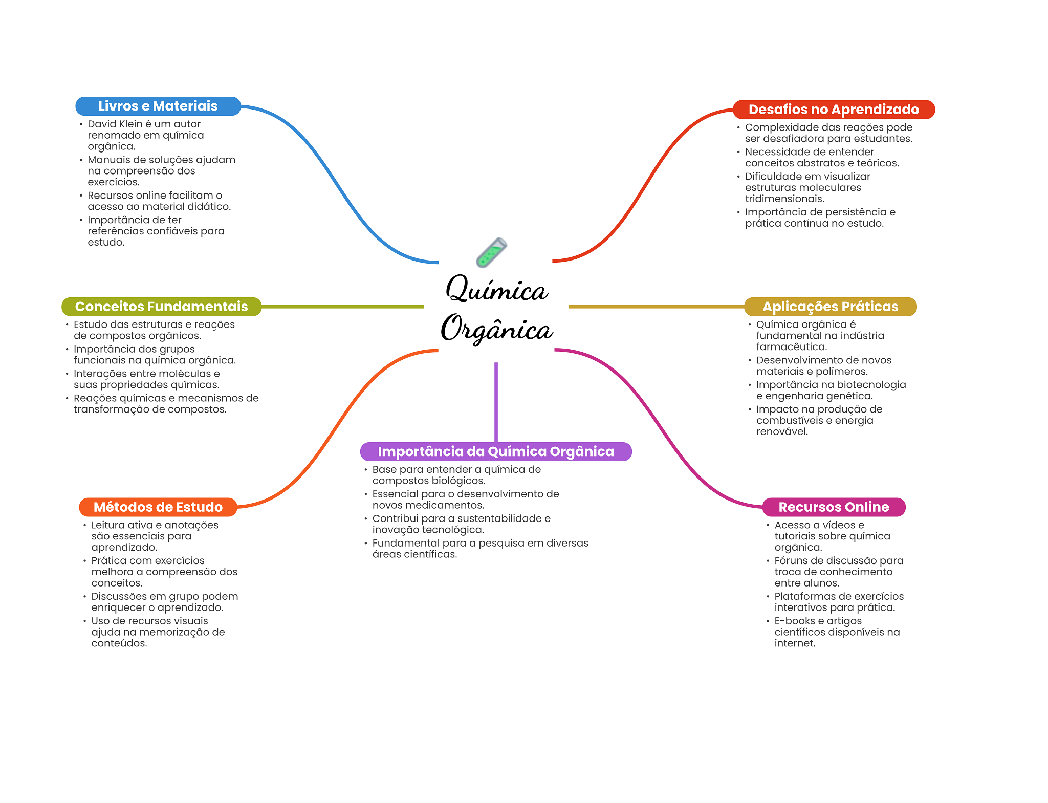Livros e Materiais Desafios no Aprendizado David Klein é um autor Complexidade das reações pode renomado em química ser desafiadora para estudantes. orgânica. Necessidade de entender Manuais de soluções ajudam conceitos abstratos e teóricos. na compreensão dos Dificuldade em visualizar exercícios. estruturas moleculares Recursos online facilitam tridimensionais. acesso ao material didático. Importância de persistência e Importância de ter prática no estudo. referências confiáveis para estudo. Química Conceitos Fundamentais Aplicações Práticas Estudo das estruturas e reações de compostos orgânicos. Orgânica Química orgânica é fundamental na indústria Importância dos grupos farmacêutica. funcionais na química orgânica. Desenvolvimento de novos Interações entre moléculas e materiais e suas propriedades químicas. Importância na biotecnologia Reações químicas e mecanismos de e engenharia genética. transformação de compostos. Impacto na produção de combustíveis e energia renovável. Importância da Química Orgânica Base para entender a química de compostos biológicos. Essencial para O desenvolvimento de Métodos de Estudo novos medicamentos. Recursos Online Contribui para a sustentabilidade e Leitura ativa e anotações Acesso a vídeos e inovação tecnológica. são essenciais para tutoriais sobre química aprendizado. Fundamental para a pesquisa em diversas orgânica. áreas científicas. Prática com exercícios Fóruns de discussão para melhora a compreensão dos troca de conhecimento conceitos. entre alunos. Discussões em grupo podem Plataformas de exercícios enriquecer O aprendizado. interativos para prática. Uso de recursos visuais E-books e artigos ajuda na memorização de científicos disponíveis na conteúdos. internet.