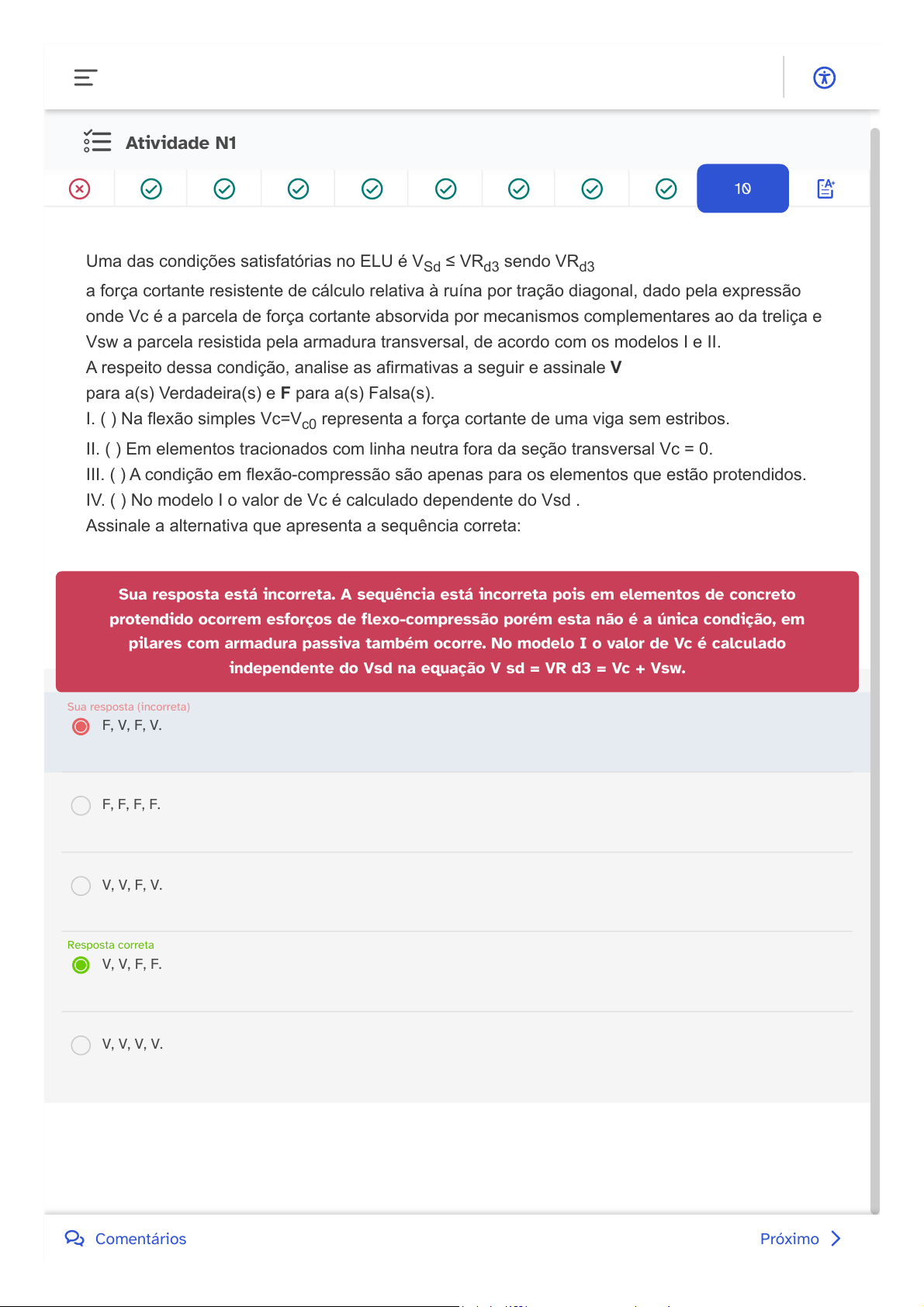 Atividade N1 Uma das condições satisfatórias no ELU é VSd ≤ VRd3 sendo VRd3 a força cortante resistente de cálculo relativa à ruína por tração diagonal, dado pela expressão onde Vc é a parcela de força cortante absorvida por mecanismos complementares ao da treliça e Vsw a parcela resistida pela armadura transversal, de acordo com os modelos I e II. A respeito dessa condição, analise as afirmativas a seguir e assinale V para a(s) Verdadeira(s) e F para a(s) Falsa(s). I. ( ) Na flexão simples Vc=Vc0 representa a força cortante de uma viga sem estribos. II. ( ) Em elementos tracionados com linha neutra fora da seção transversal Vc = 0. III. ( ) A condição em flexão-compressão são apenas para os elementos que estão protendidos. IV. ( ) No modelo I o valor de Vc é calculado dependente do Vsd . Assinale a alternativa que apresenta a sequência correta: Sua resposta está incorreta. A sequência está incorreta pois em elementos de concreto protendido ocorrem esforços de flexo-compressão porém esta não é a única condição, em pilares com armadura passiva também ocorre. No modelo I o valor de Vc é calculado independente do Vsd na equação V sd = VR d3 = Vc + Vsw. F, V, F, V. Sua resposta (incorreta) F, F, F, F. V, V, F, V. V, V, F, F. Resposta correta V, V, V, V. 10 Próximo Comentários