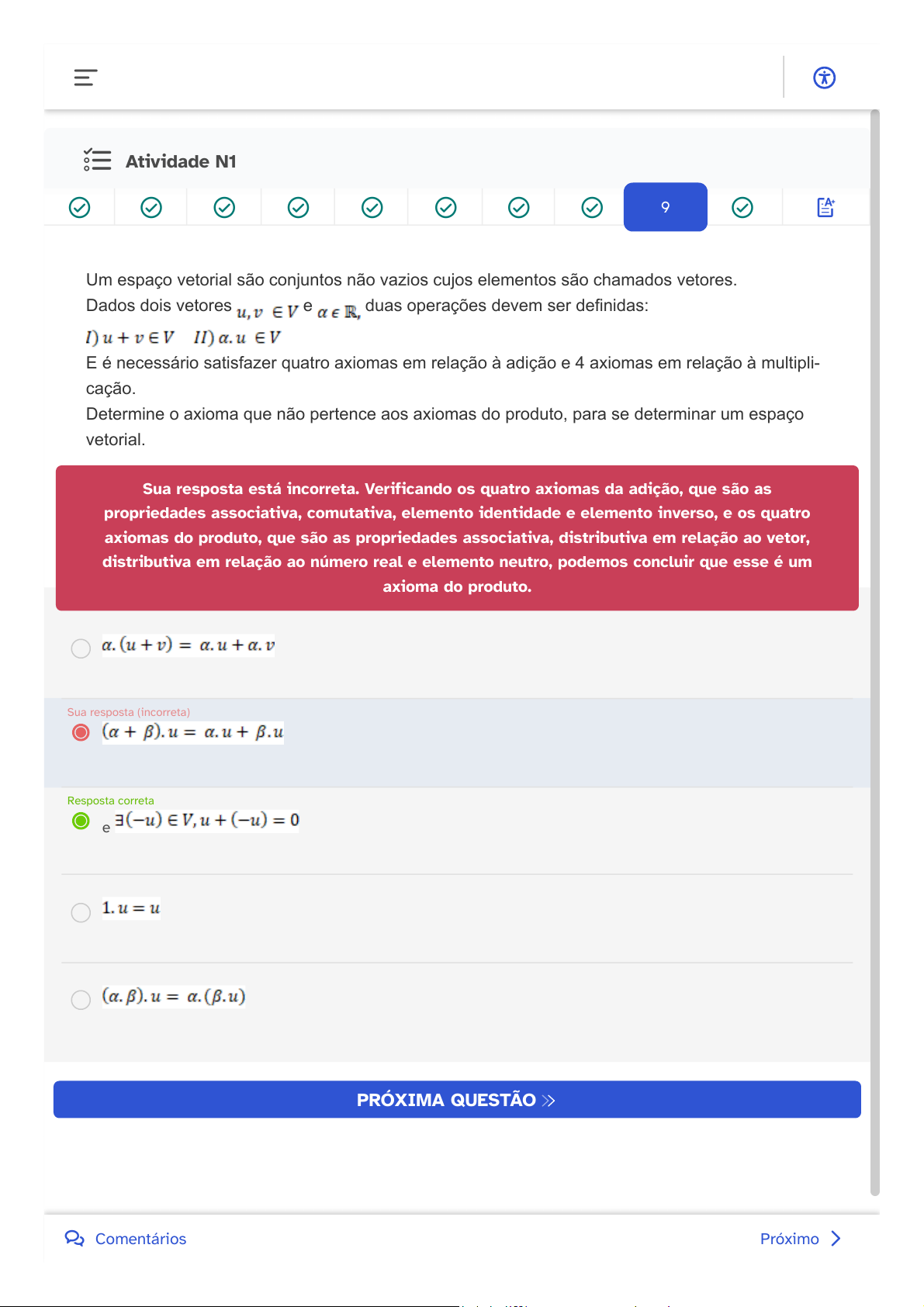 Atividade N1 Um espaço vetorial são conjuntos não vazios cujos elementos são chamados vetores. Dados dois vetores e duas operações devem ser definidas: E é necessário satisfazer quatro axiomas em relação à adição e 4 axiomas em relação à multipli- cação. Determine o axioma que não pertence aos axiomas do produto, para se determinar um espaço vetorial. Sua resposta está incorreta. Verificando os quatro axiomas da adição, que são as propriedades associativa, comutativa, elemento identidade e elemento inverso, e os quatro axiomas do produto, que são as propriedades associativa, distributiva em relação ao vetor, distributiva em relação ao número real e elemento neutro, podemos concluir que esse é um axioma do produto. Sua resposta (incorreta) e Resposta correta PRÓXIMA QUESTÃO 9 Próximo Comentários