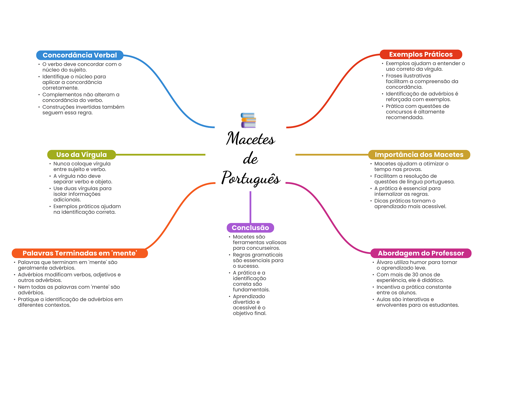 Concordância Verbal Exemplos Práticos verbo deve concordar com Exemplos ajudam a entender núcleo do sujeito. uso correto da vírgula. Identifique núcleo para Frases ilustrativas aplicar a concordância facilitam a compreensão da corretamente. concordância. Complementos não alteram a Identificação de advérbios é concordância do verbo. reforçada com exemplos. Construções invertidas também Prática com questões de seguem essa regra. concursos é altamente recomendada. Macetes Uso da Vírgula de Importância dos Macetes Nunca coloque vírgula Macetes ajudam a otimizar entre sujeito e verbo. tempo nas provas. A vírgula não deve separar verbo e objeto. Português Facilitam a resolução de questões de língua portuguesa. Use duas vírgulas para A prática é essencial para isolar informações internalizar as regras. adicionais. Dicas práticas tornam O Exemplos práticos ajudam aprendizado mais acessível. na identificação correta. Conclusão Macetes são ferramentas valiosas para concurseiros. Palavras Terminadas em 'mente' Regras gramaticais Abordagem do Professor Palavras que terminam em são são essenciais para Álvaro utiliza humor para tornar geralmente advérbios. sucesso. O aprendizado leve. Advérbios modificam verbos, adjetivos e A prática e a Com mais de 30 anos de outros advérbios. identificação experiência, ele é didático. correta são Nem todas as palavras com são fundamentais. Incentiva a prática constante advérbios. entre alunos. Aprendizado Pratique a identificação de advérbios em Aulas são interativas e divertido e diferentes contextos. acessível é envolventes para estudantes. objetivo final.