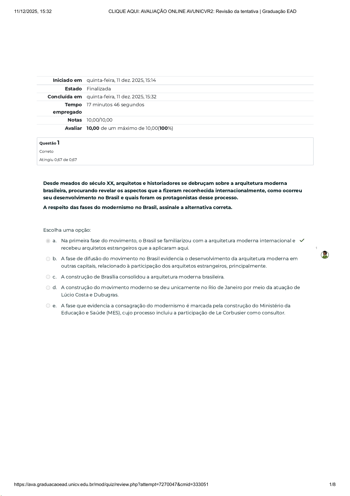 Iniciado em quinta-feira, 11 dez. 2025, 15:14 Estado Finalizada Concluída em quinta-feira, 11 dez. 2025, 15:32 Tempo empregado 17 minutos 46 segundos Notas 10,00/10,00 Avaliar 10,00 de um máximo de 10,00(100%) Questão 1 Correto Atingiu 0,67 de 0,67 Desde meados do século XX, arquitetos e historiadores se debruçam sobre a arquitetura moderna brasileira, procurando revelar os aspectos que a fizeram reconhecida internacionalmente, como ocorreu seu desenvolvimento no Brasil e quais foram os protagonistas desse processo. A respeito das fases do modernismo no Brasil, assinale a alternativa correta. Escolha uma opção: a. Na primeira fase do movimento, o Brasil se familiarizou com a arquitetura moderna internacional e recebeu arquitetos estrangeiros que a aplicaram aqui. ✓ b. A fase de difusão do movimento no Brasil evidencia o desenvolvimento da arquitetura moderna em outras capitais, relacionado à participação dos arquitetos estrangeiros, principalmente. c. A construção de Brasília consolidou a arquitetura moderna brasileira. d. A construção do movimento moderno se deu unicamente no Rio de Janeiro por meio da atuação de Lúcio Costa e Dubugras. e. A fase que evidencia a consagração do modernismo é marcada pela construção do Ministério da Educação e Saúde (MES), cujo processo incluiu a participação de Le Corbusier como consultor. 1 11/12/2025, 15:32 CLIQUE AQUI: AVALIAÇÃO ONLINE AVUNICVR2: Revisão da tentativa | Graduação EAD https://ava.graduacaoead.unicv.edu.br/mod/quiz/review.php?attempt=7270047&cmid=333051 1/8 Questão 2 Correto Atingiu 0,67 de 0,67 Questão 3 Correto Atingiu 0,67 de 0,67 O estilo barroco no Brasil pode ser facilmente reconhecido por meio das diversas igrejas que foram construídas na época de influência desse movimento. Sobre essas importantes obras religiosas brasileiras, marque a alternativa correta. Escolha uma opção: a. O Mosteiro de São Bento, exemplar barroco do Rio de Janeiro, apresenta em seu interior painéis de azulejos retratando passagens bíblicas. b. A Igreja da Ordem Terceira de São Francisco, localizada em Minas Gerais, teve influência do barroco português. c. Na Bahia, a Igreja São Francisco de Assis, apresenta toda a sua fachada em arenito, valorizando ainda mais os detalhes do estilo. d. Os principais exemplos religiosos da arquitetura barroca brasileira encontram-se nos estados da Bahia e de Minas Gerais. ✓ e. Um exemplo da escola regional barroca mineira é a Igreja de Bom Jesus dos Matosinhos e seus 12 profetas esculpidos pelo Mestre Ataíde. O que quer dizer quando se diz que a Arte contemporânea é de vanguarda? Escolha uma opção: a. Que há uma originalidade, um avanço, algo inovador e da atualidade. ✓ b. Que ela apresenta obras que estavam guardadas. c. Que está dirigida para as elites e os acadêmicos. d. Que está dirigida apenas para a classe popular. e. Que ela retoma valores antigos para expressar a arte. 1 11/12/2025, 15:32 CLIQUE AQUI: AVALIAÇÃO ONLINE AVUNICVR2: Revisão da tentativa | Graduação EAD https://ava.graduacaoead.unicv.edu.br/mod/quiz/review.php?attempt=7270047&cmid=333051 2/8 Questão 4 Correto Atingiu 0,67 de 0,67 Questão 5 Correto Atingiu 0,68 de 0,68 O Brasil foi colônia de Portugal por muito tempo. Após sua independência, ainda contava com a presença da família real portuguesa. Assim, é natural que nossa cultura tenha muita influência europeia. No início do século XX, a elite cultural brasileira — que estudou na Europa —, voltou para o Brasil com o intuito de implantar as ideias vanguardistas que estavam em vigor na Europa. Sendo assim, organizaram a Semana de Arte Moderna de 1922. Sobre a Semana de Arte Moderna de 1922, é correto afirmar que: Escolha uma opção: a. incentivava o nacionalismo. ✓ b. incentivava a arte genérica. c. incentivava a arte barroca. d. incentivava a busca de referências históricas. e. incentivava o academicismo. Os primeiros séculos da Idade Moderna foram marcados pelo movimento renascentista, que buscava uma nova forma de enxergar o mundo e foi dividido em três momentos. Sobre esses momentos, qual alternativa está correta? Escolha uma opção: a. O Ciquecento caracteriza o momento em que vários países começaram a aderir ao movimento. b. A fase do Quatrocento foi marcada pelo surgimento de ideais de caráter humanista. c. O período denominado Trecento foi marcado pelo auge do Renascimento artístico e cultural. d. O período de nome Quatrocento refere-se à consolidação do estilo em vários países europeus. e. A fase denominada Trecento foi um período de transição entre Idade Média e Idade Moderna. ✓ 1 11/12/2025, 15:32 CLIQUE AQUI: AVALIAÇÃO ONLINE AVUNICVR2: Revisão da tentativa | Graduação EAD https://ava.graduacaoead.unicv.edu.br/mod/quiz/review.php?attempt=7270047&cmid=333051 3/8 Questão 6 Correto Atingiu 0,67 de 0,67 Questão 7 Correto Atingiu 0,67 de 0,67 O desenvolvimento das vanguardas artísticas no início do século XX se espalhou por todo o Brasil. A consolidação do modernismo brasileiro trouxe, também, o surgimento de algumas correntes que se diferenciavam entre si. O Manifesto regionalista, de Gilberto Freyre, é a expressão de uma dessas correntes. A respeito desse manifesto, é correto afirmar que: Escolha uma opção: a. queria que todas as regiões tivessem uma única influência. b. dizia que o caminho para o nacionalismo era a autonomia para as regiões. ✓ c. buscava reproduzir influências de diversas regiões da Europa. d. buscava uma identidade universal para a cultura. e. buscava a homogeneização das manifestações culturais. O artesanato é um tipo de arte que necessita muita dedicação e cuidado. Sobre a produção artesanal, é correto afirmar que: Escolha uma opção: a. é uma maneira de difundir a tecnologia para âmbitos globais. b. é uma técnica que garante a produção de elementos idênticos. c. é um tipo de arte que possibilita a produção em larga es