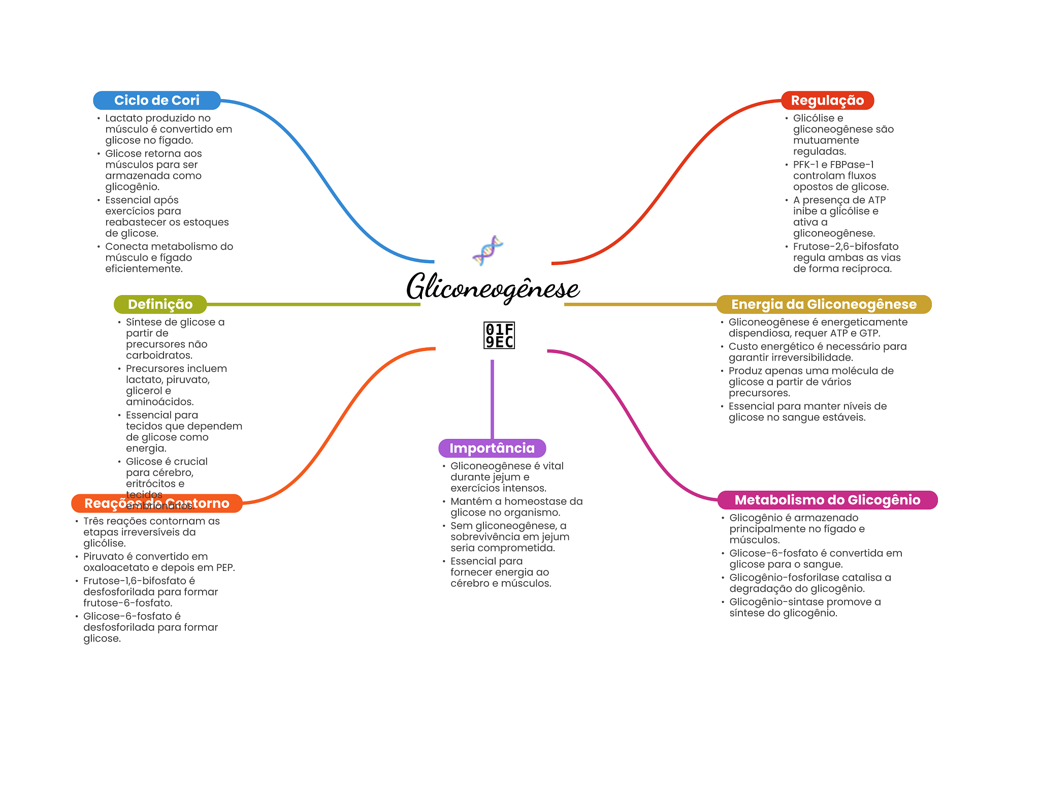 Ciclo de Cori Regulação Lactato produzido no Glicólise e músculo é convertido em gliconeogênese são glicose no fígado. mutuamente Glicose retorna aos reguladas. músculos para ser PFK-1 e FBPase-1 armazenada como controlam fluxos glicogênio. opostos de glicose. Essencial após A presença de ATP exercícios para inibe a glicólise e reabastecer estoques ativa a de glicose. gliconeogênese. Conecta metabolismo do Frutose-2,6-bifosfato músculo e fígado regula ambas as vias eficientemente. de forma recíproca. Gliconeogênese Definição Energia da Gliconeogênese Síntese de glicose a Gliconeogênese é energeticamente partir de 01F dispendiosa, requer ATP e GTP. precursores não 9EC Custo energético é necessário para carboidratos. garantir irreversibilidade. Precursores incluem Produz apenas uma molécula de lactato, piruvato, glicose a partir de vários glicerol e precursores. aminoácidos. Essencial para manter níveis de Essencial para glicose no sangue estáveis. tecidos que dependem de glicose como energia. Importância Glicose é crucial Gliconeogênese é vital para cérebro, durante jejum e eritrócitos e exercícios intensos. tecidos Reações de Mantém a homeostase da Metabolismo do Glicogênio glicose no organismo. Três reações contornam as Glicogênio é armazenado Sem gliconeogênese, a etapas irreversíveis da principalmente no fígado e sobrevivência em jejum glicólise. músculos. seria comprometida. Piruvato é convertido em Glicose-6-fosfato é convertida em Essencial para oxaloacetato e depois em PEP. glicose para sangue. fornecer energia ao Frutose-1,6-bifosfato é cérebro e músculos. Glicogênio-fosforilase catalisa a desfosforilada para formar degradação do glicogênio. frutose-6-fosfato. Glicogênio-sintase promove a Glicose-6-fosfato é síntese do glicogênio. desfosforilada para formar glicose.