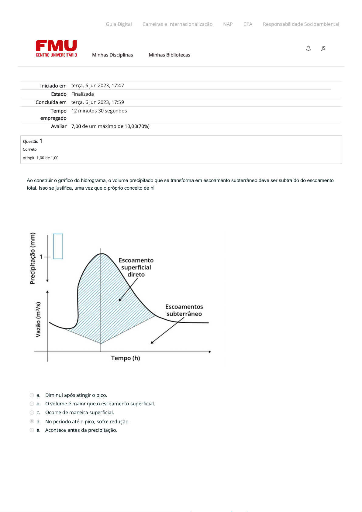 06/06/2023, 18:00 Atividade 4 (A4): Revisão da tentativa https://ambienteacademico.com.br/mod/quiz/review.php?attempt=2414749&cmid=786491 1/5 Iniciado em terça, 6 jun 2023, 17:47 Estado Finalizada Concluída em terça, 6 jun 2023, 17:59 Tempo empregado 12 minutos 30 segundos Avaliar 7,00 de um máximo de 10,00(70%) Questão 1 Correto Atingiu 1,00 de 1,00 Ao construir o gráfico do hidrograma, o volume precipitado que se transforma em escoamento subterrâneo deve ser subtraído do escoamento total. Isso se justifica, uma vez que o próprio conceito de hidrograma é de que ele envolve apenas a chuva efetiva, ou seja, aquela que não gera escoamento subterrâneo. No gráfico a seguir, qual a constatação a respeito da contribuição do escoamento subterrâneo no hidrograma geral? Figura 4.1 - Contribuição do escoamento subterrâneo Fonte: Elaborada pelo autor. Assinale a alternativa correta. a. Diminui após atingir o pico. b. O volume é maior que o escoamento super�cial. c. Ocorre de maneira super�cial. d. No período até o pico, sofre redução. e. Acontece antes da precipitação. Guia Digital Carreiras e Internacionalização NAP CPA Responsabilidade Socioambiental Minhas Disciplinas Minhas Bibliotecas JS https://codely-fmu-content.s3.amazonaws.com/Moodle/GuiaDigital/Guia+digital/index.html https://carreiras.fmu.br/ https://codely-fmu-content.s3.amazonaws.com/Moodle/NAP/inicial/nap/fmu/index.html https://codely-fmu-content.s3.amazonaws.com/Moodle/CPA/landing_CPA/index.html https://portal.fmu.br/sustentabilidade https://ambienteacademico.com.br/ https://ambienteacademico.com.br/ https://ambienteacademico.com.br/course/view.php?id=236 06/06/2023, 18:00 Atividade 4 (A4): Revisão da tentativa https://ambienteacademico.com.br/mod/quiz/review.php?attempt=2414749&cmid=786491 2/5 Questão 2 Correto Atingiu 1,00 de 1,00 Questão 3 Correto Atingiu 1,00 de 1,00 Uma bacia hidrográfica possui sua configuração estendida ao longo de diversos cursos-d’água que levam até ao rio principal, o qual se desloca ao longo do talvegue, por 4300 m. A nascente desse rio – e, consequentemente, o ponto mais alto da bacia – encontra-se na cota 2577 m e a foz, na cota 2405. Calcule o tempo de concentração para as chuvas nessa bacia, utilizando a fórmula de Watt e Chow ( ). Assinale a alternativa correta em relação ao resultado do problema apresentado. a. 4,25 horas. b. 5,12 horas. c. 3,18 horas. d. 1,44 horas. e. 2,43 horas. A seguir, encontra-se uma parte da planilha utilizada para verificar a adequação de um reservatório para retardar vazões geradas por chuvas intensas. Esta planilha foi gerada a partir dos dados de cota x volume, obtidos em função do formato do reservatório. Após, foram acrescentadas as colunas Q e 2S/dt + Q. Calcule o valor para Q indicado pelo ponto de interrogação, considerando que o coeficiente de contração é 1,5, que a crista do vertedor (retangular) está na cota 120 m e a sua largura é 25 m. Tabela 4.1 - Cota-volume Cota (m) S (Volume) (m ) Q = C x L x h (2S/Δt)+Q 115 120 121 122 123 124 125 126 127 128 129 130 19.000.000 20.000.000 20.080.000 20.380.000 21.020.000 22.080.000 23.620.000 25.690.000 28.340.000 31.630.000 35.600.000 40.290.000 - 0 37,5 148,1 194,9 ? 419,3 551,1 694,5 848,5 1.012,5 1.185,9 - 11.111 11.193 11.428 11.873 12.567 13.541 14.823 16.439 18.421 20.790 23.569 Fonte: Collischonn (2013). Assinale a alternativa correta para o problema apresentado. a. 420 m /s. b. 532 m /s. c. 383 m /s. d. 350 m /s. e. 300 m /s. 3 3/2 3 3 3 3 3 Guia Digital Carreiras e Internacionalização NAP CPA Responsabilidade Socioambiental Minhas Disciplinas Minhas Bibliotecas JS https://codely-fmu-content.s3.amazonaws.com/Moodle/GuiaDigital/Guia+digital/index.html https://carreiras.fmu.br/ https://codely-fmu-content.s3.amazonaws.com/Moodle/NAP/inicial/nap/fmu/index.html https://codely-fmu-content.s3.amazonaws.com/Moodle/CPA/landing_CPA/index.html https://portal.fmu.br/sustentabilidade https://ambienteacademico.com.br/ https://ambienteacademico.com.br/ https://ambienteacademico.com.br/course/view.php?id=236 06/06/2023, 18:00 Atividade 4 (A4): Revisão da tentativa https://ambienteacademico.com.br/mod/quiz/review.php?attempt=2414749&cmid=786491 3/5 Questão 4 Correto Atingiu 1,00 de 1,00 Questão 5 Incorreto Atingiu 0,00 de 1,00 Questão 6 Incorreto Atingiu 0,00 de 1,00 O método do hidrograma unitário consiste em uma simplificação bastante eficiente no processo de calcular vazões numa determinada bacia. Considere que, numa determinada região, a vazão medida por esse método resultou em 0,416 m /s/cm para um tempo de pico de 15 min. Calcule qual a área da bacia, considerando que . Assinale a alternativa correta em relação ao resultado do problema apresentado. a. 6 km . b. 5 km . c. 4 km . d. 2 km . e. 3 km . 3 2 2 2 2 2 Para o dimensionamento de reservatórios com a finalidade de amortecer chuvas intensas, um dos métodos mais empregados se chama método de Puls. Ele consiste em equacionar os diversos parâmetros que envolvem a chuva e seu consequente ingresso em uma estrutura construída para reter essa precipitação, relacionado com a maneira como essa mesma água irá deixar o reservatório. Esse segundo fato deverá se dar de forma controlada. A equação que rege o método de Puls é: Referente a essa equação, assinale a alternativa correta para o que significam os termos à esquerda e à direita da igualdade. a. À esquerda estão os termos do que ocorre antes da chuva e, à direita, os termos do que ocorre após. b. À esquerda, estão os termos desconhecidos, e à direita, os termos conhecidos. c. À esquerda estão as incógnitas sobre a entrada de água e à direita, sobre a saída. d. À esquerda estão os termos da precipitação e à direita do escoamento. e. À esquerda os dados da chuva e à direita os dados do reservatório. Um aquífero com coeficiente de armazenamento 0,001 e coeficiente de transmissividade 0,0079 m /s possui um 