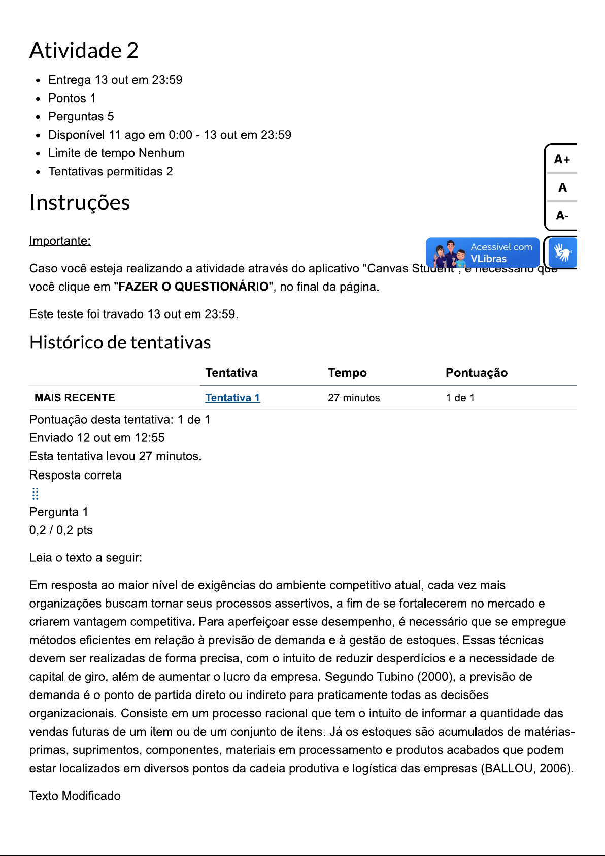 Atividade 2 Entrega 13 out em 23:59 Pontos 1 Perguntas 5 Disponível 11 ago em 0:00 13 out em 23:59 Limite de tempo Nenhum A+ Tentativas permitidas 2 A Instruções A- Importante: Acessível com VLibras Caso você esteja realizando a atividade através do aplicativo "Canvas Student que você clique em "FAZER QUESTIONÁRIO", no final da página. Este teste foi travado 13 out em 23:59. Histórico de tentativas Tentativa Tempo Pontuação MAIS RECENTE Tentativa 1 27 minutos 1 de 1 Pontuação desta tentativa: 1 de 1 Enviado 12 out em 12:55 Esta tentativa levou 27 minutos. Resposta correta Pergunta 1 0,2 / 0,2 pts Leia texto a seguir: Em resposta ao maior nível de exigências do ambiente competitivo atual, cada vez mais organizações buscam tornar seus processos assertivos, a fim de se fortalecerem no mercado e criarem vantagem competitiva. Para aperfeiçoar esse desempenho, é necessário que se empregue métodos eficientes em relação à previsão de demanda e à gestão de estoques. Essas técnicas devem ser realizadas de forma precisa, com intuito de reduzir desperdícios e a necessidade de capital de giro, além de aumentar o lucro da empresa. Segundo Tubino (2000), a previsão de demanda é o ponto de partida direto ou indireto para praticamente todas as decisões organizacionais. Consiste em um processo racional que tem intuito de informar a quantidade das vendas futuras de um item ou de um conjunto de itens. Já os estoques são acumulados de matérias- primas, suprimentos, componentes, materiais em processamento e produtos acabados que podem estar localizados em diversos pontos da cadeia produtiva e logística das empresas (BALLOU, 2006). Texto ModificadoWILVERT, José E. et al. Previsão de demanda e gestão de estoque: um estudo realizado em uma empresa de polpas de fruta. Disponível em: TN_STP_291_1641_37429.pdf (abepro.org.br). Acesso em: 12 mai. 2023. (adaptado). Analise as asserções a seguir e a relação entre elas: I. principal objetivo da análise ABC é identificar os itens de maior valor de demanda e sobre A+ exercer uma gestão mais refinada. A A- Porque Acessível com VLibras II. Os métodos de avaliação de estoques são voltados à verificação e ao acompanhamento de quanto capital está imobilizado em estoque. É correto que se afirma em: As asserções I e são proposições verdadeiras, e a é uma justificativa da I. As asserções I e são proposições falsas. As asserções I e são proposições verdadeiras, e a é uma justificativa da I. A asserção é uma proposição falsa, e a é uma proposição verdadeira. As asserções I e são proposições verdadeiras, mas a não é uma justificativa da I. Esta alternativa é a correta, pois as asserções I e são proposições verdadeiras, mas a não é uma justificativa da I. A asserção I é verdadeira, pois principal objetivo da análise ABC é identificar os itens de maior valor de demanda e sobre eles exercer uma gestão mais refinada, especialmente por representarem altos valores de investimentos e, muitas vezes, com impactos estratégicos para a sobrevivência da organização. A asserção também é verdadeira, pois os métodos de avaliação de estoques voltam-se à verificação e ao acompanhamento de quanto capital está imobilizado em estoque, esta asserção está afirmando a avaliação de estoques e por este motiva não é uma justificativa da I que trata do principal objetivo da curva ABC. Resposta correta Pergunta 2 0,2 / 0,2 pts Leia texto abaixo:Uma empresa que planeja comprar, para cobrir suas necessidades anuais, determinada quantidade de um produto (cem mil parafusos, por exemplo) poderia resolver colocar um pedido único de cem mil unidades representando as necessidades do ano inteiro, ou poderia fazer dois pedidos semestrais de cinquenta mil unidades, ou quatro pedidos trimestrais de vinte e cinco mil, ou seis pedidos bimensais de dezesseis mil e seiscentas, ou ainda doze pedidos mensais de oito mil e trezentas unidades. Quanto maior lote comprado, maiores serão empate de capital e os juros sobre ele, bem como as despesas de armazenamento; em compensação, as despesas de A+ administração da compra, tais como tempo gasto para entrar em contato com fornecedor, e também risco de atraso do fornecimento serão menores. custo total da compra será a soma A despesas de armazenamento, de juros e de administração da compra. Ao custo total mínimo A- corresponderá o lote econômico de compra. Para determinação do lote econômico, o método m geral consiste em calcular sucessivamente os custos correspondentes a Acessível com doze lotes por ano. O lote que resultar em custo total mínimo é lote eco VLibras rigor para todos os efeitos práticos. Maior exatidão no resultado pode ser conseguida, lançando num gráfico os pontos obtidos e traçando uma curva de custos unindo esses pontos; ponto mínimo da curva corresponde ao valor exato do lote econômico. Quando não há descontos de compra para pedidos maiores, também se podem usar fórmulas conhecidas. MACHLINE, Claude. Inflação e lote econômico de compra. SciELO Brasil Inflação e lote econômico de compra Inflação e lote econômico de compra. Acesso em: 12 dez. 2023. (adaptado). Analise as afirmativas a seguir: I. A gestão de estoques se preocupa somente com fluxo diário entre compras e produção, não admitindo mudanças na forma tradicional de estoque nas suas diferentes formas. II. Sem estoque é impossível uma empresa trabalhar, pois ele é amortecedor entre os vários estágios da produção até a venda final do produto. III. A gestão de estoques deverá conciliar, da melhor maneira, os objetivos dos departamentos, sem prejudicar a operacionalidade da empresa, assim como a definição e a execução da política de estoques. É correto que se afirma apenas em: II, apenas. e III, apenas. Esta alternativa está correta, pois apenas as afirmativas e III são verdadeiras. A afirmativa é verdadeira, pois sem estoqu