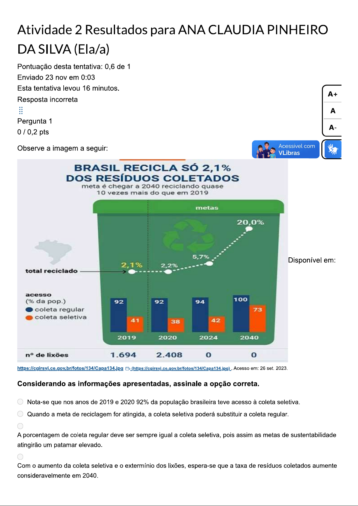 Atividade 2 Resultados para ANA CLAUDIA PINHEIRO DA SILVA (Ela/a) Pontuação desta tentativa: 0,6 de 1 Enviado 23 nov em 0:03 Esta tentativa levou 16 minutos. A+ Resposta incorreta A Pergunta 1 A- Observe a imagem a seguir: Acessível com VLibras BRASIL RECICLA SÓ 2,1% DOS RESÍDUOS COLETADOS meta é chegar a 2040 reciclando quase 10 vezes mais do que em 2019 metas 20,0% 5,7% Disponível em: 2,1% 2,2% total reciclado acesso (% da pop.) 92 92 94 100 coleta regular 73 coleta seletiva 41 38 42 2019 2020 2024 2040 de lixões 1.694 2.408 Acesso em: 26 set. 2023. Considerando as informações apresentadas, assinale a opção correta. Nota-se que nos anos de 2019 e da população brasileira teve acesso à coleta seletiva. Quando a meta de reciclagem for atingida, a coleta seletiva poderá substituir a coleta regular. A porcentagem de coleta regular deve ser sempre igual a coleta seletiva, pois assim as metas de sustentabilidade atingirão um patamar elevado. Com o aumento da coleta seletiva e extermínio dos lixões, espera-se que a taxa de resíduos coletados aumente consideravelmente em 2040.Estima-se que em 2040, a taxa de reciclagem chegará a 100%, que equivale a 10 vezes alcançado em 2019. A alternativa está incorreta, pois como gráfico mostra a meta é 20%, e esse valor equivale a 10 vezes a taxa obtida em 2019. Desse modo, a alternativa correta é aquela que diz que com aumento da coleta seletiva e extermínio dos lixões, espera-se que a taxa de resíduos coletados aumente A+ consideravelmente em 2040. Isso porque com o extermínio dos lixões a céu aberto e a prática frequente da coleta seletiva, o processo de reciclagem será mais viável de ser realizado, visto A materiais sendo separados, facilitam sua destinação adequado. Isso porque as metas para 204 A- visam extermínio dos lixões, uma porcentagem de 73 do acesso à coleta seletiva e assim, a de resíduos reciclados em 20%, um aumento considerável ao comparar Acessível com a taxa de 2020 (2,2%) e a estimativa de 2024 (5,7%). VLibras Resposta correta Pergunta 2 0,2 / 0,2 pts Observe a imagem e leia o texto a seguir: SUSTENTABILIDADE MOISESCARTUNS.COM.BR Fonte: CARVALHO, M. Sustentabilidade. Moisés Cartuns, 21 abr. 2022. Disponível em: https://www.moisescartuns.com.br/2022/04/sustentabilidade.html Acesso em: 14 set. 2023.O secretário-geral da ONU emitiu um aviso severo sobre as alterações climáticas esta semana: "A era do aquecimento global terminou; a era da ebulição global chegou", declarou António Guterres numa conferência de imprensa, quando os cientistas confirmaram que julho deverá ser mês mais quente de que há registo na Terra. "As alterações climáticas estão aqui. São aterradoras. E isto é apenas começo", disse António Guterres numa conferência de imprensa na sede da ONU em Nova lorque, na quinta-feira, enquanto descrevia "crianças arrastadas pelas chuvas de monção, famílias a fugir das chamas [e] A+ trabalhadores a sucumbir ao calor abrasador". A Os dados mostram que mês de julho já registou período de três semanas mais quente de A- sempre; os três dias mais quentes de que há registo; e as temperaturas oceânicas mais elevad sempre para esta época do ano". Acessível com VLibras Fonte: THE WASHINGTON POST. Começou "uma era de ebulição global", avisou António Guterres. que é que 05 ago. 2023. Disponível 14 set. 2023. A partir da imagem e da leitura do texto, avalie as afirmativas abaixo: I. A sustentabilidade atua de forma independente às novas formas de relação entre homem e a natureza, sendo uma corrente de pensamento de ativistas ambientais que lutam pelo bem do meio ambiente. II. A "era da ebulição global" citada no texto remete a uma situação climática atual alarmante e próximo de um grau de irreversibilidade para a resolução dos impactos ambientais. III. caos climático relatado no texto pode ser resolvido facilmente com desenvolvimento e o uso de tecnologias capazes de gerar recursos naturais artificiais. Está correto que se afirma em: I, apenas. II, apenas. III, apenas. I e II, apenas. e III, apenas. A alternativa está correta, pois apenas a afirmativa II está correta. A afirmativa está incorreta, pois a sustentabilidade está sim relacionada às novas formas do homem se relacionar com a natureza de maneira a preservar os recursos naturais. A afirmativa está correta, pois atualmente o aquecimento se tornou tão intenso e próximo da irreversibilidade que os cientistas denominam como ebulição global. A alternativa III está incorreta, pois não existem tecnologias capazes de gerar recursos naturais, logo não é tão fácil resolver caos climático. Resposta corretaPergunta 3 0,2 / 0,2 pts Leia os textos a seguir: Texto I Embora numerosas organizações da sociedade civil funcionem de forma autônoma em relação ao governo, frequentemente colaboram com o Estado na prestação de serviços de interesse A+ Brasil, as diretrizes que regem esse relacionamento são ditadas pelo Marco Regulatório das A Organizações da Sociedade Civil (MROSC), que é a Lei n° 13.019, implementada em 31 de jull 2014. A- Texto II Acessível com VLibras Estabelece regime jurídico das parcerias entre a administração pública sociedade civil, em regime de mútua cooperação, para a consecução de finalidades de interesse público e recíproco, mediante a execução de atividades ou de projetos previamente estabelecidos em planos de trabalho inseridos em termos de colaboração, em termos de fomento ou em acordos de cooperação; define diretrizes para a política de fomento, de colaboração e de cooperação com organizações da sociedade civil. Fonte: BRASIL. Lei n° 13.019, de 31 de julho de 2014. Brasília DF. Disponível em: https://www.planalto.gov.br/ccivil 03/ ato2011- (https://www.planalto.gov.br/ccivil 03/ Acesso em: 13 set. 2023. Considerando as informações apresentadas, avalie as afirmativas abaixo: I. Com processo de redemocratização em curso no Bra