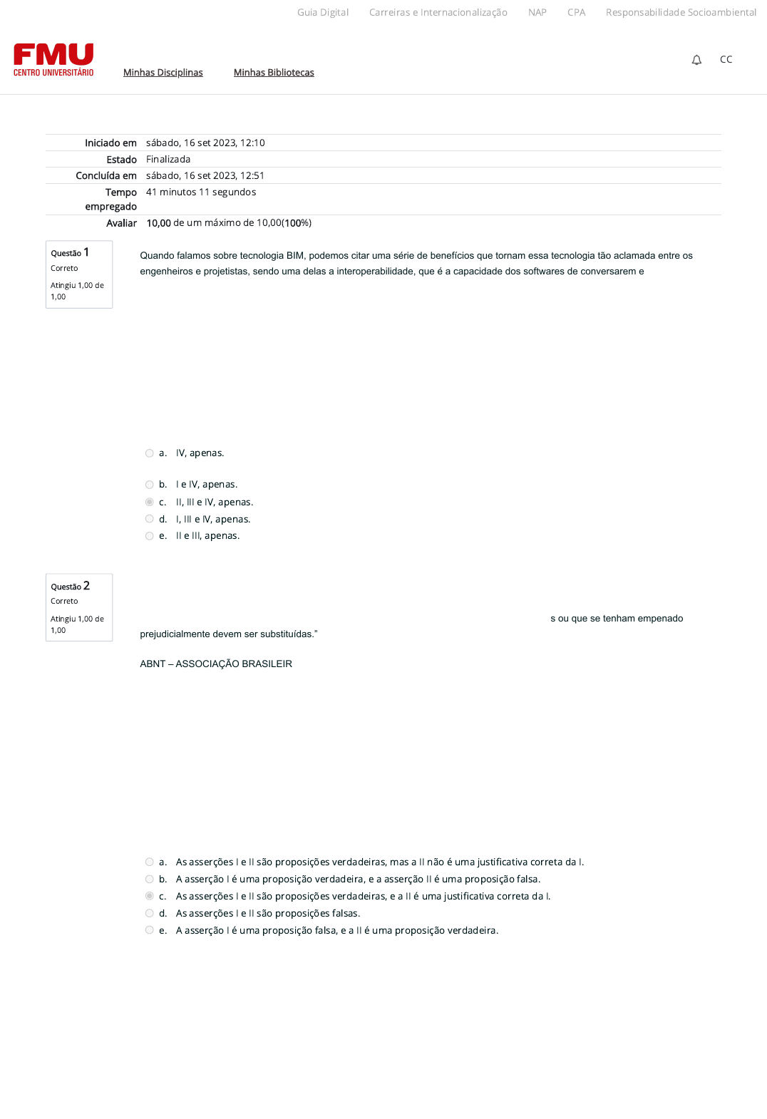 Guia Digital Carreiras e Internacionalização NAP CPA Responsabilidade Socioambiental FMU CC CENTRO UNIVERSITÁRIO Minhas Disciplinas Minhas Bibliotecas Iniciado em sábado, 16 set 2023, 12:10 Estado Finalizada Concluída em sábado, 16 set 2023, 12:51 Tempo 41 minutos 11 segundos empregado Avaliar 10,00 de um máximo de 10,00(100%) Questão 1 Quando falamos sobre tecnologia BIM, podemos citar uma série de benefícios que tornam essa tecnologia tão aclamada entre os Correto engenheiros e projetistas, sendo uma delas a interoperabilidade, que é a capacidade dos softwares de conversarem e Atingiu 1,00 de 1,00 a. IV, apenas. b. le IV, apenas. II, III e IV, apenas. d. I, III e IV, apenas. e. II e III, apenas. Questão 2 Correto Atingiu 1,00 de S ou que se tenham empenado 1,00 prejudicialmente devem ser substituídas." ABNT ASSOCIAÇÃO BRASILEIR a. As asserções e II são proposições verdadeiras, mas a II não é uma justificativa correta da I. b. A asserção I é uma proposição verdadeira, e a asserção é uma proposição falsa. C. As asserções e II são proposições verdadeiras, ea II é uma justificativa correta da I. d. As asserções I e II são proposições falsas. e. A asserção I é uma proposição falsa, e a é uma proposição verdadeira.