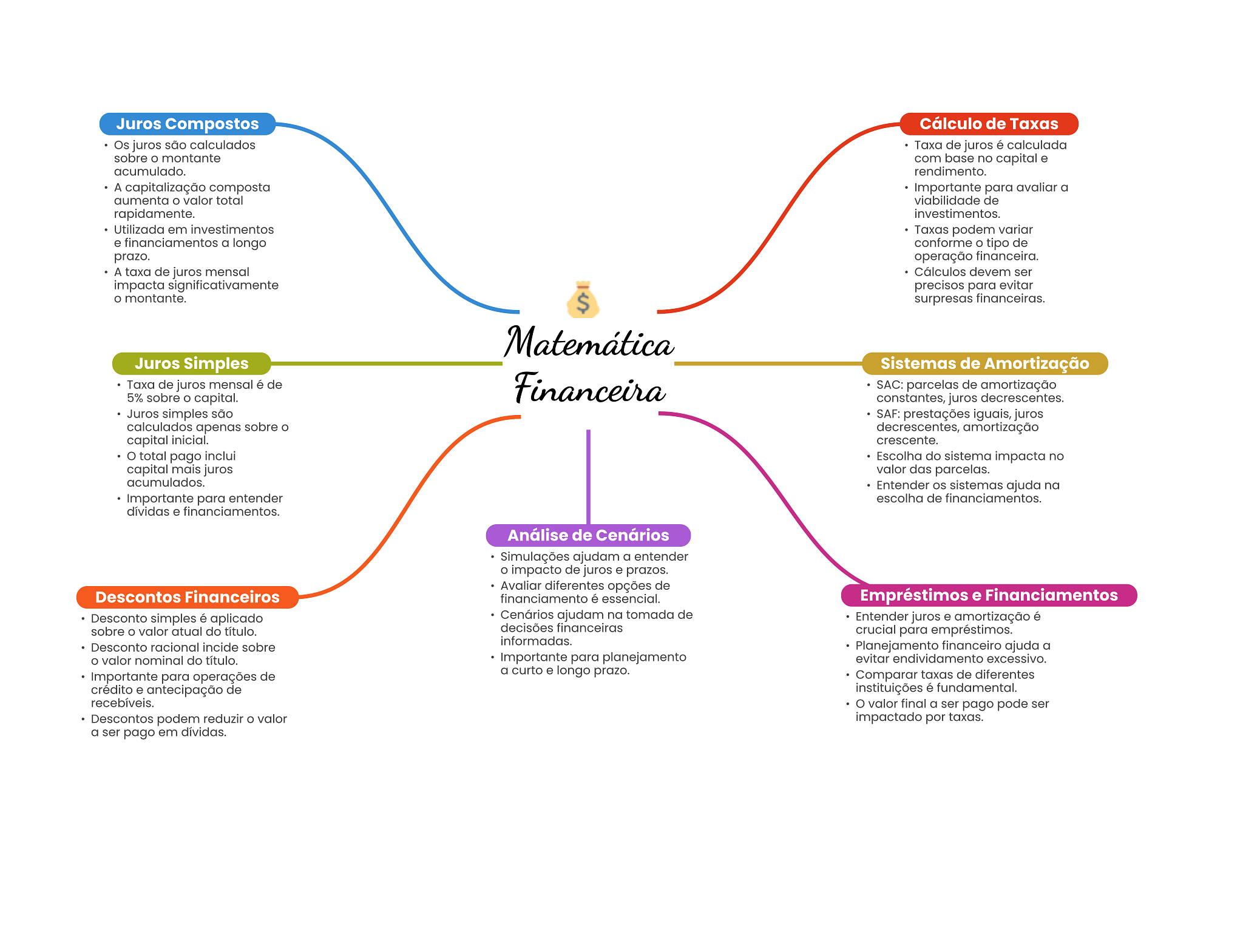 Juros Compostos Cálculo de Taxas Os juros são calculados Taxa de juros é calculada sobre montante com base no capital e acumulado. rendimento. A capitalização composta Importante para avaliar a aumenta valor total viabilidade de rapidamente. investimentos. Utilizada em investimentos Taxas podem variar e financiamentos a longo conforme tipo de prazo. operação financeira. A taxa de juros mensal Cálculos devem ser impacta significativamente precisos para evitar montante. $ surpresas financeiras. Matemática Juros Simples Sistemas de Amortização Taxa de juros mensal é de 5% sobre capital. Financeira SAC: parcelas de amortização constantes, juros decrescentes. Juros simples são SAF: prestações iguais, juros calculados apenas sobre decrescentes, amortização capital inicial. crescente. total pago inclui Escolha do sistema impacta no capital mais juros valor das parcelas. acumulados. Entender OS sistemas ajuda na Importante para entender escolha de financiamentos. dívidas e financiamentos. Análise de Cenários Simulações ajudam a entender impacto de juros e prazos. Avaliar diferentes opções de Descontos Financeiros financiamento é essencial. Empréstimos e Financiamentos Desconto simples é aplicado Cenários ajudam na tomada de Entender juros e amortização é sobre valor atual do título. decisões financeiras crucial para empréstimos. informadas. Desconto racional incide sobre Planejamento financeiro ajuda a valor nominal do título. Importante para planejamento evitar endividamento excessivo. Importante para operações de a curto e longo prazo. Comparar taxas de diferentes crédito e antecipação de instituições é fundamental. recebíveis. valor final a ser pago pode ser Descontos podem reduzir valor impactado por taxas. a ser pago em dívidas.