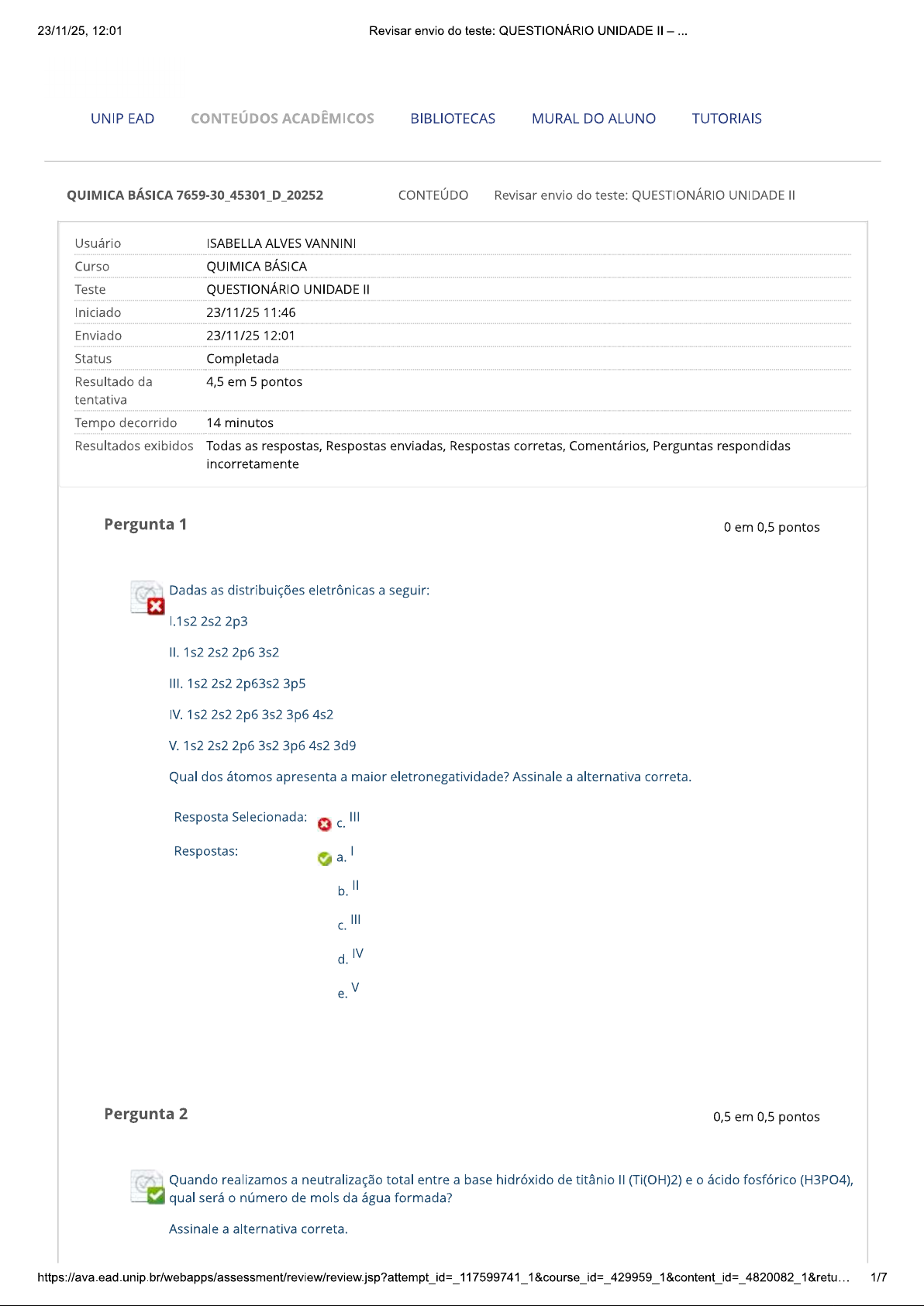 23/11/25, 12:01 Revisar envio do teste: QUESTIONÁRIO UNIDADE UNIP EAD CONTEÚDOS ACADÊMICOS BIBLIOTECAS MURAL DO ALUNO TUTORIAIS QUIMICA BÁSICA 7659-30_45301_D_20252 CONTEÚDO Revisar envio do teste: QUESTIONÁRIO UNIDADE Usuário ISABELLA ALVES VANNINI Curso QUIMICA BÁSICA Teste QUESTIONÁRIO UNIDADE Iniciado 23/11/25 11:46 Enviado 23/11/25 12:01 Status Completada Resultado da 4,5 em 5 pontos tentativa Tempo decorrido 14 minutos Resultados exibidos Todas as respostas, Respostas enviadas, Respostas corretas, Comentários, Perguntas respondidas incorretamente Pergunta 1 0 em 0,5 pontos Dadas as distribuições eletrônicas a seguir: 2s2 2p3 II. 1s2 2s2 3s2 III. IV. 1s2 2s2 3s2 4s2 V. 1s2 2s2 3s2 4s2 3d9 Qual dos átomos apresenta a maior eletronegatividade? Assinale a alternativa correta. Resposta Selecionada: III Respostas: a. b. III C. d. IV V e. Pergunta 2 0,5 em 0,5 pontos Quando realizamos a neutralização total entre a base hidróxido de titânio (Ti(OH)2) e ácido fosfórico (H3PO4), qual será número de mols da água formada? Assinale a alternativa correta. 1/723/11/25, 12:01 Revisar envio do teste: QUESTIONÁRIO UNIDADE Resposta Selecionada: 6 mols Respostas: a. 2 mols b. 4 mols C. 6 mols d. 5 mols e. 1 mol Comentário da resposta: Resposta: Comentário: Na reação de neutralização, que sempre acontece entre um ácido e uma base, os produtos formados são um sal e água. Ao fazer 0 balanceamento da reação é possível saber 0 número de mols de água produzida. + -> Pergunta 3 0,5 em 0,5 pontos Uma reação entre alumínio (Al) e óxido de ferro III (Fe203) produz ferro metálico (Fe) e óxido de alumínio Se eu utilizar 3,7 Kg de alumínio nesta reação, qual será a quantidade de ferro metálico produzido? Assinale a alternativa correta. Dadas as massas atômicas: O=16u; Al=27u; Fe=56u Resposta Selecionada: b. 7,674 Kg Respostas: a. 8,87 Kg b. 7,674 Kg 15,34 Kg d. 14,32 Kg e. 9,58 Kg 2/723/11/25, 12:01 Revisar envio do teste: QUESTIONÁRIO UNIDADE Comentário da resposta: Resposta: Comentário: É necessário montar a equação da reação química e depois fazer 0 balanceamento desta para verificar a proporção entre reagente e 0 produto Fe. Conhecendo a proporção calculamos a massa de cada um destes elementos na reação e fazemos uma relação entre a massa teórica (com os valores dados de massa atômica) e a massa utilizada na prática do reagente alumínio, 0 resultado desta relação matemática (regra de três) será a quantidade de ferro produzida usando 3,7 Kg (ou 3.700 g) de alumínio. importante fazer a conversão das unidades para os cálculos. 2Al + 2Fe + 54g de Al produz 112g de Fe produzirá 3.700g de Al xg de Fe = 7.674 g ou 7,674Kg de Fe serão produzidos A massa atômica do e do Fe foi multiplicada por dois, pois balanceamento da equação mostrou que 2 mols de alumínio produzem 2 mols de ferro. Pergunta 4 0,5 em 0,5 pontos Quantos gramas existem em 3 mols de Mg2SiO4 (fosterite ou silicato natural)? Dadas as massas atômicas: Mg=24g; Si=28g. Assinale a alternativa correta. Resposta Selecionada: e. 420 Respostas: a. 204g b. 308 312g d. 267 e. 420 g Comentário da resposta: Resposta: E Comentário: Os valores da massa atômica dos elementos (os quais estão na tabela periódica) referem-se à quantidade destes em 1 mol. A soma das massas atômicas será 0 valor da massa molecular do silicato Mg2SiO4 em 1mol. 24g(x2) + 28g + 140g é a massa molecular do Se 1 mol de Mg2SiO4 possui 140 g, para saber quanto em gramas desta substância há em 3 mols, monta-se uma relação em regra de três. 1 mol de possui 140g possuirá 3 mols de Mg₂SiO₄ xg 420g em 3 mols Pergunta 5 0,5 em 0,5 pontos 3/723/11/25, 12:01 Revisar envio do teste: QUESTIONÁRIO UNIDADE Para combater a acidez estomacal podem ser usados medicamentos à base de hidróxido de magnésio (Mg(OH)2). alívio do sintoma resulta da neutralização do ácido clorídrico (HCI) do estômago pelo hidróxido de magnésio. No caso de uma reação de neutralização total entre os reagentes, qual será número de mols do sal cloreto de magnésio produzido? Assinale a alternativa correta: Resposta Selecionada: a. 1 mol. Respostas: 1 mol. a. b. 4 mols. C. 3 mols. d. 2 mols. 1,5 mol. e. Comentário da resposta: Resposta: A Comentário: Na reação de neutralização, que sempre acontece entre um ácido e uma base, neste caso HCI e Mg(OH)2, produtos formados são um sal e água. Ao fazer 0 balanceamento da reação é possível saber 0 número de mols do sal produzido. 1Mg(OH)₂ + 2HCl 1MgCl₂ + Pergunta 6 0,5 em 0,5 pontos Uma reação entre o tetracloreto de titânio gasoso (TiCl4) e o magnésio sólido (Mg) produz cloreto de magnésio líquido e titânio metálico (Ti). Se eu utilizar 8,4g de tetracloreto de titânio nesta reação, qual será a quantidade de titânio metálico produzido? Assinale a alternativa correta. Dadas as massas atômicas: Mg=24u; Ti=48u; Cl=35,5u Resposta Selecionada: a. 2,122g Respostas: a. b. C. 2,980 g d. 1,500 g e. Comentário da resposta: 4/723/11/25, 12:01 Revisar envio do teste: QUESTIONÁRIO UNIDADE Resposta: A Comentário: Primeiramente, é necessário montar a equação da reação química e depois fazer 0 balanceamento desta para verificar a proporção entre 0 reagente e 0 produto Ti. Conhecendo a proporção, calculamos a massa de cada um destes elementos na reação e fazemos uma relação entre a massa teórica (com os valores dados de massa atômica, os quais encontram-se na tabela periódica) e a massa utilizada na prática do reagente TiC14, 0 resultado desta relação matemática (regra de três) será a quantidade de titânio metálico (Ti) produzido quando forem utilizados 8,4 g de tetracloreto de titânio. + 2Mg -> 2MgCl₂ + 1Ti produz 190g de TiCl₄ 48g de Ti produzirá 8,4g de TiCl₄ xg de Ti = 2,122g de Ti serão produzidos Pergunta 7 0,5 em 0,5 pontos Quantos mols existem em 186 g de C2H6O2 (etilenoglicol)? Assinale a alternativa correta. Dadas