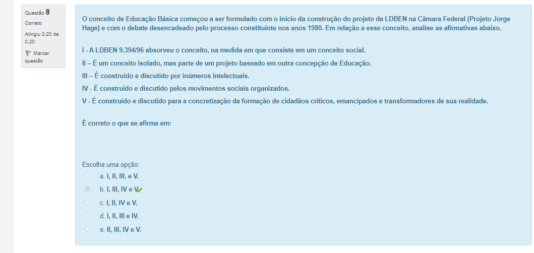Questão 8 conceito de Educação começou a ser formulado com início da construção do projeto da LDBEN na Câmara Federal (Projeto Jorge Correto Hage) e com 0 debate desencadeado pelo processo constituinte nos anos 1980. Em relação a esse conceito, analise as afirmativas abaixo. Atingiu de P Marcar I A LDBEN 9.394/96 absorveu 0 conceito, na medida em que consiste em um conceito social. questão II É um conceito isolado, mas parte de um projeto baseado em outra concepção de Educação. III É construído e discutido por inúmeros intelectuais. IV É construído e discutido pelos movimentos sociais organizados. V-É construído e discutido para a concretização da formação de cidadãos críticos, emancipados e transformadores de sua realidade. É correto que se afirma em: Escolha uma opção: a. I, II, III, e V. b. I, III, IV e C. I, II, IV e V. d. I, II, III e IV. e. II, III, IV e V.