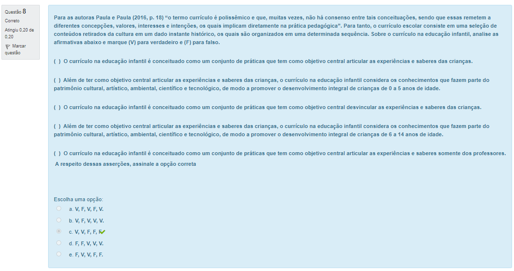 Questão 8 Correto Para as autoras Paula e Paula (2016, p. 18) termo currículo é polissêmico e que, muitas vezes, não consenso entre tais conceituações, sendo que essas remetem a diferentes concepções, valores, interesses e intenções, os quais implicam diretamente na prática Para tanto, 0 currículo escolar consiste em uma seleção de Atingiu 0.20 de 0.20 conteúdos retirados da cultura em um dado instante histórico, quais são organizados em uma determinada sequência. Sobre 0 currículo na educação infantil, analise as afirmativas abaixo e marque (V) para verdadeiro e (F) para falso. P Marcar questão O na educação infantil é conceituado como um conjunto de práticas que tem como objetivo central articular as experiências e saberes das crianças. de ter como objetivo central articular as experiências e saberes das crianças, curriculo na educação infantil considera os conhecimentos que fazem parte do patrimônio cultural, artistico, ambiental, cientifico e tecnológico, de modo a promover desenvolvimento integral de crianças de 0 a 5 anos de idade. currículo na educação infantil é conceituado como um conjunto de práticas que tem como objetivo central desvincular as e saberes das crianças. () Além de ter como objetivo central articular as experiências e saberes das crianças, currículo na educação infantil considera conhecimentos que fazem parte do patrimônio cultural, artístico, ambiental, científico e tecnológico, de modo a promover desenvolvimento integral de crianças de 6 a 14 anos de idade. currículo na educação infantil é conceituado como um conjunto de práticas que tem como objetivo central articular as experiências e saberes somente dos professores. A respeito dessas asserções, assinale a opção correta Escolha uma opção: a.V,F,V,F,V.