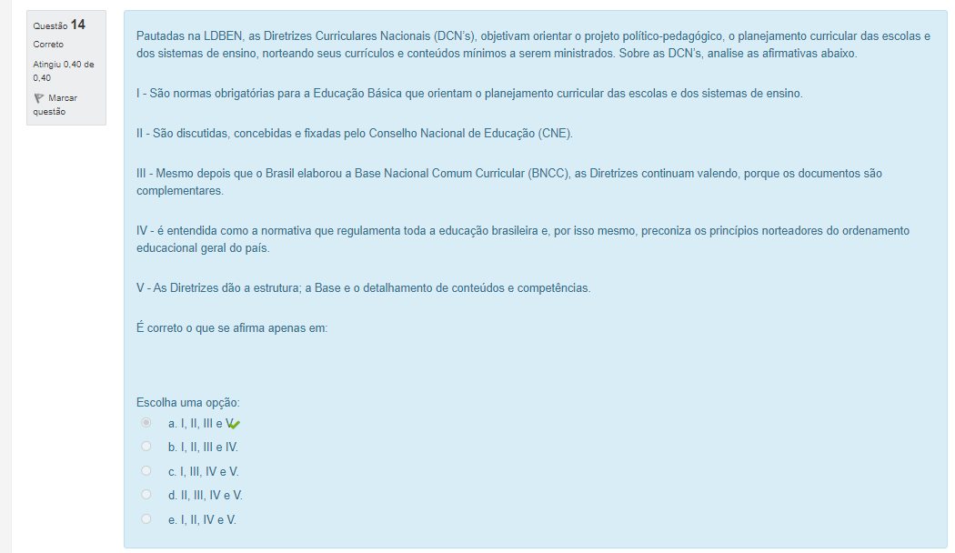 Questão 14 Pautadas na LDBEN, as Diretrizes Curriculares Nacionais (DCN's), objetivam orientar 0 projeto 0 planejamento curricular das escolas e Correto dos sistemas de ensino, norteando seus currículos e conteúdos mínimos a serem ministrados. Sobre as DCN's, analise as afirmativas abaixo. Atingiu de Marcar I São normas obrigatórias para a Educação que orientam 0 planejamento curricular das escolas e dos sistemas de ensino. questão São discutidas, concebidas e fixadas pelo Conselho Nacional de Educação (CNE). III Mesmo depois que 0 Brasil elaborou a Base Nacional Comum Curricular (BNCC), as Diretrizes continuam valendo, porque os documentos são complementares. IV é entendida como a normativa que regulamenta toda a educação brasileira e, por isso mesmo, preconiza os princípios norteadores do ordenamento educacional geral do país. V As Diretrizes dão a estrutura; a Base e 0 detalhamento de conteúdos e competências. É correto 0 que se afirma apenas em: Escolha uma opção: II, III e II, III e IV. C. I, III, IV e V. d. II, III, IV e V. e. I, II, IV e V.