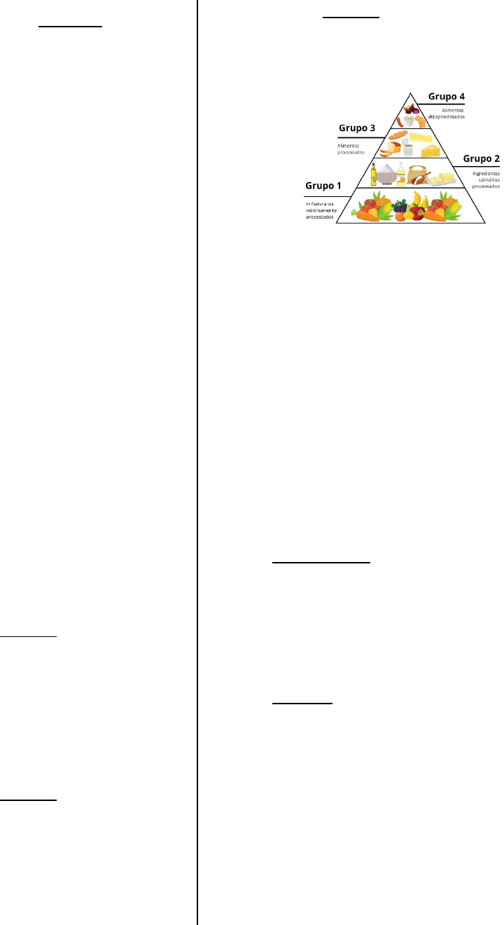 Ciência da Nutriçao Conceito: Nutrição é a ciência que estuda as diversas etapas que um alimento sofre, desde sua introdução no organismo, mastigação até a eliminação. Onde promove o crescimento, a reparação dos tecidos, a produção de energia e o equilíbrio das funções orgânicas. Fases da nutrição · Escolha do alimento; · Digestão; · Absorção; · Metabolismo(digestão-absorção) · Excreção; Classificação dos nutrientes · Construtores: proteínas- – PTN · Função: manutenção, crescimento do organismo, renovação dos tecidos e células; · Energético: carboidratos e gordura · Função: energia do organismo; · Reguladores: frutas, legumes e verduras · Função: regulação das atividades do organismo Nutrientes São substancias que compões os alimentos Alimentação adequada precisa de: · Qualidade; · Quantidade; · Harmonia; Macronutrientes · Grandes quantidades diárias; · Base da pirâmide alimentar; · Carboidratos (CHO): são glicídios, encontrados em vegetais, raízes, fruto, sementes, caule e folhas. Lactose (açúcar do leite) e Frutose (açúcar do mel); · Lipídeos (LIP, gordura ou ácidos-graxos, insolúvel em H2O): · fornece energia; · armazenamento através de triglicerídeos; · sabor da dieta; · poupar PTN para síntese tecidual; · proteção dos órgãos vitais; · controle da temperatura; · transporte de vitaminas lipossolúveis (A, D, E, K) · Proteína (PTN): essencial na formação de células, anticorpos, hormônios e enzimas · PTN de alto valor biológico: completa, contém todos os aminoácidos, fonte de origem animal; · PTN de baixo valor biológico: incompleto, falta de um ou mais aminoácidos essenciais, fonte de origem vegetal; Micronutrientes ... Exercício O alimento é um dos requerimentos básicos para a existência de um povo, e a aquisição desta comida desempenha um papel importante na formação de quaisquer culturas. Os métodos de procurar e processar estes alimentos estão intimamente ligados a expressão cultural e social de um povo. Diante do exposto é correto afirma que: a) A alimentação é um processo involuntário e o processamento dos alimentos deve ser desconsiderado na elaboração do plano alimentar. b) Indiferente do alimento escolhido todo e qualquer método de procura e processamento deve ser considerado. c) O alimento é fundamental para subsistência dos indivíduos e o seu significado político-econômico prevalece sobre os demais. d) A nutrição é um processo voluntario e o processamento dos alimentos deve ser desconsiderado na elaboração do plano alimentar. e) A nutrição prioriza a recuperação da saúde dos indivíduos indiferentemente dos seus hábitos alimentares. image1.png