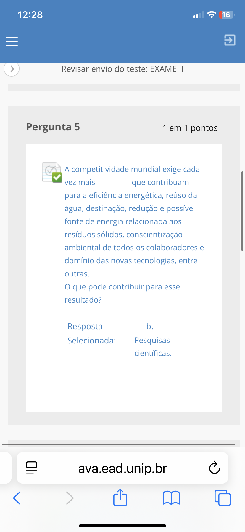 12:28 16 Revisar envio do teste: EXAME Pergunta 5 1 em 1 pontos A competitividade mundial exige cada vez mais que contribuam para a eficiência energética, reúso da água, destinação, redução e possível fonte de energia relacionada aos resíduos sólidos, conscientização ambiental de todos os colaboradores e domínio das novas tecnologias, entre outras. que pode contribuir para esse resultado? Resposta b. Selecionada: Pesquisas científicas. ava.ead.unip.br