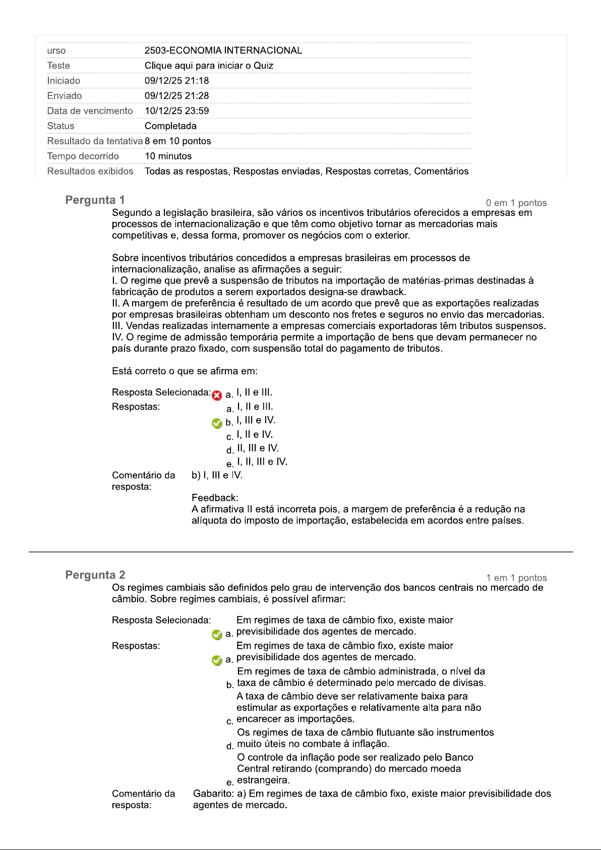 urso 2503-ECONOMIA INTERNACIONAL Teste Clique aqui para iniciar Quiz Iniciado 09/12/25 21:18 Enviado 09/12/25 21:28 Data de vencimento 10/12/25 23:59 Status Completada Resultado da tentativa 8 em 10 pontos Tempo decorrido 10 minutos Resultados exibidos Todas as respostas, Respostas enviadas, Respostas corretas, Comentários Pergunta 1 0 em 1 pontos Segundo a legislação brasileira, são vários os incentivos tributários oferecidos a empresas em processos de internacionalização e que têm como objetivo tornar as mercadorias mais competitivas e, dessa forma, promover os negócios com o exterior. Sobre incentivos tributários concedidos a empresas brasileiras em processos de internacionalização, analise as afirmações a seguir: I. O regime que prevê a suspensão de tributos na importação de matérias-primas destinadas à fabricação de produtos a serem exportados designa-se drawback. II. A margem de preferência é resultado de um acordo que prevê que as exportações realizadas por empresas brasileiras obtenham um desconto nos fretes e seguros no envio das mercadorias. III. Vendas realizadas internamente a empresas comerciais exportadoras têm tributos suspensos. IV. regime de admissão temporária permite a importação de bens que devam permanecer no país durante prazo fixado, com suspensão total do pagamento de tributos. Está correto o que se afirma em: Resposta Selecionada: a. I, e III. Respostas: a. I, e III. b. I, III e IV. C. I, e IV. d. II, III e IV. e. I, II, III e IV. Comentário da b) I, III e IV. resposta: Feedback: A afirmativa está incorreta pois, a margem de preferência é a redução na alíquota do imposto de importação, estabelecida em acordos entre países. Pergunta 2 1 em 1 pontos Os regimes cambiais são definidos pelo grau de intervenção dos bancos centrais no mercado de câmbio. Sobre regimes cambiais, é possível afirmar: Resposta Selecionada: Em regimes de taxa de câmbio fixo, existe maior a. previsibilidade dos agentes de mercado. Respostas: Em regimes de taxa de câmbio fixo, existe maior a. previsibilidade dos agentes de mercado. Em regimes de taxa de câmbio administrada, o nível da b. taxa de câmbio é determinado pelo mercado de divisas. A taxa de câmbio deve ser relativamente baixa para estimular as exportações e relativamente alta para não encarecer as importações. Os regimes de taxa de câmbio flutuante são instrumentos d. muito úteis no combate à inflação. O controle da inflação pode ser realizado pelo Banco Central retirando (comprando) do mercado moeda e. estrangeira. Comentário da Gabarito: a) Em regimes de taxa de câmbio fixo, existe maior previsibilidade dos resposta: agentes de mercado.Feedback: Os regimes de taxa de câmbio fixo garantem maior previsibilidade aos agentes de mercado, pois mantêm a taxa cambial constante. Pergunta 3 1 em 1 pontos Nem todas as operações cambiais afetam o Balanço de Pagamentos. Entre as operações a seguir, indique qual a que não afeta significativamente Balanço de Pagamentos. Resposta Selecionada: a. Operações de câmbio interbancário. Respostas: a. Operações de câmbio interbancário. b. Operações de câmbio primário. Operações de câmbio sacado. d. Operações de câmbio manual. e. Operações de câmbio a termo. Comentário da Gabarito: a) Operações de câmbio interbancário. resposta: Feedback: Em operações de câmbio interbancário são realizadas trocas de moedas de diferentes países, o que não representa para efeito do Balanço de Pagamentos uma entrada nem uma saída de moeda estrangeira. Pergunta 4 1 em 1 pontos Entre as várias teorias que procuram fundamentar as razões do comércio internacional e seus benefícios para determinadas regiões, aquela que procura explicar as razões e os ganhos do comércio internacional por meio das diferenças estruturais e da disponibilidade de recursos de uma nação comparativamente à outra é designada de: Resposta Selecionada: a. Teoria da proporção dos fatores. Respostas: a. Teoria da proporção dos fatores. b. Teoria das vantagens comparativas. Teoria da procura representativa d. Teoria da demanda recíproca. e. Teoria das vantagens baseadas em recursos. Comentário daGabarito: a) Teoria da proporção dos fatores. resposta: Feedback: Os economistas Eli Heckscher e Bertil Ohin desenvolveram a teoria das proporções dos fatores, para explicar as razões e os ganhos do comércio internacional. Eles deduziram que um país exportará um bem que utiliza seu fator de produção mais abundante e importará o bem que usa intensamente o fator relativamente escasso. Pergunta 5 1 em 1 pontos Embora não tenha sido possível estruturar um acordo que regulamentasse o comércio exterior, o acordo de Bretton Woods abriu discussões que levaram mais tarde à celebração de um acordo definindo os princípios gerais de um regime multilateral de comércio, conhecido por: Resposta Selecionada: a. Acordo Geral sobre Tarifas e Comércio (Gatt). Respostas: a. Acordo Geral sobre Tarifas e Comércio (Gatt). b. Banco Mundial. Fundo Monetário Internacional (FMI). d. Organização Mundial do Comércio (OMC). e. Organização Internacional de Comércio. Comentário da Gabarito: a) Acordo Geral sobre Tarifas e Comércio (Gatt). resposta: Feedback: O Gatt surgiu de uma série de negociações entre países signatários com foco de remover as barreiras comerciais e ao mesmo tempo estabelecer regras e normas de controle por meio de tarifas de imposto de importação, capazes de promover os negócios internacionais.Pergunta 6 1 em 1 pontos No Brasil as empresas são livres de importar qualquer produto, no entanto, devem obedecer a certos requisitos no ato de importação, para ultrapassarem barreiras tarifárias e não tarifárias. Nesse contexto, é possível afirmar: Resposta Selecionada: Os governos podem impor temporariamente limites à d. importação de certos produtos. Respostas: Na importação de medicamentos, todas as bar