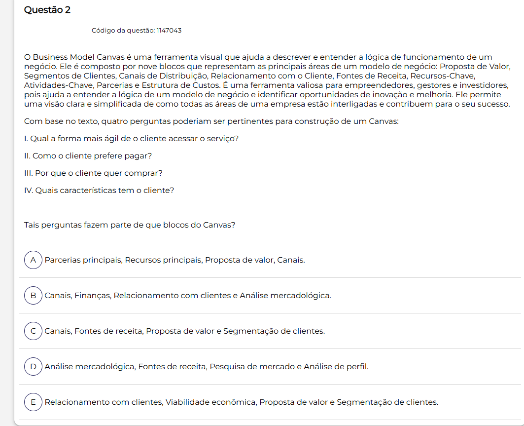 Questão 2 Código da questão: 1147043 Business Model Canvas é uma ferramenta visual que ajuda a descrever e entender a lógica de funcionamento de um negócio. Ele é composto por nove blocos que representam as principais áreas de um modelo de negócio: Proposta de Valor, Segmentos de Clientes, Canais de Distribuição, Relacionamento com O Cliente, Fontes de Receita, Recursos-Chave, Atividades-Chave, Parcerias e Estrutura de Custos. É uma ferramenta valiosa para empreendedores, gestores e investidores, pois ajuda a entender a lógica de um modelo de negócio e identificar oportunidades de inovação e melhoria. Ele permite uma visão clara e simplificada de como todas as áreas de uma empresa estão interligadas e contribuem para O seu sucesso. Com base no texto, quatro perguntas poderiam ser pertinentes para construção de um Canvas: I. Qual a forma mais ágil de cliente acessar O serviço? II. Como O cliente prefere pagar? III. Por que O cliente quer comprar? IV. Quais características tem cliente? Tais perguntas fazem parte de que blocos do Canvas? A Parcerias principais, Recursos principais, Proposta de valor, Canais. Canais, Finanças, Relacionamento com clientes e Análise mercadológica. C Canais, Fontes de receita, Proposta de valor e Segmentação de clientes. D Análise mercadológica, Fontes de receita, Pesquisa de mercado e Análise de perfil. E Relacionamento com clientes, Viabilidade econômica, Proposta de valor e Segmentação de clientes.